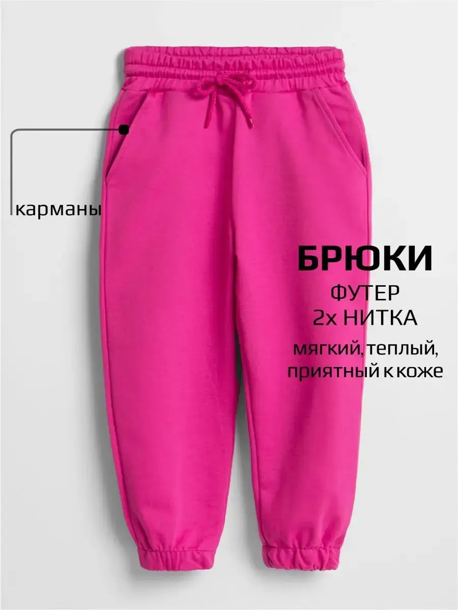 Брюки для девочек - выполнены также из трикотажной ткани на основе натурального хлопка. Широкий пояс на резинке не сдавливает животик ребенка и обеспечивает надежную фиксацию на талии. Классические спортивные детские брюки придают образу оригинальность и следуют последним модным тенденциям.