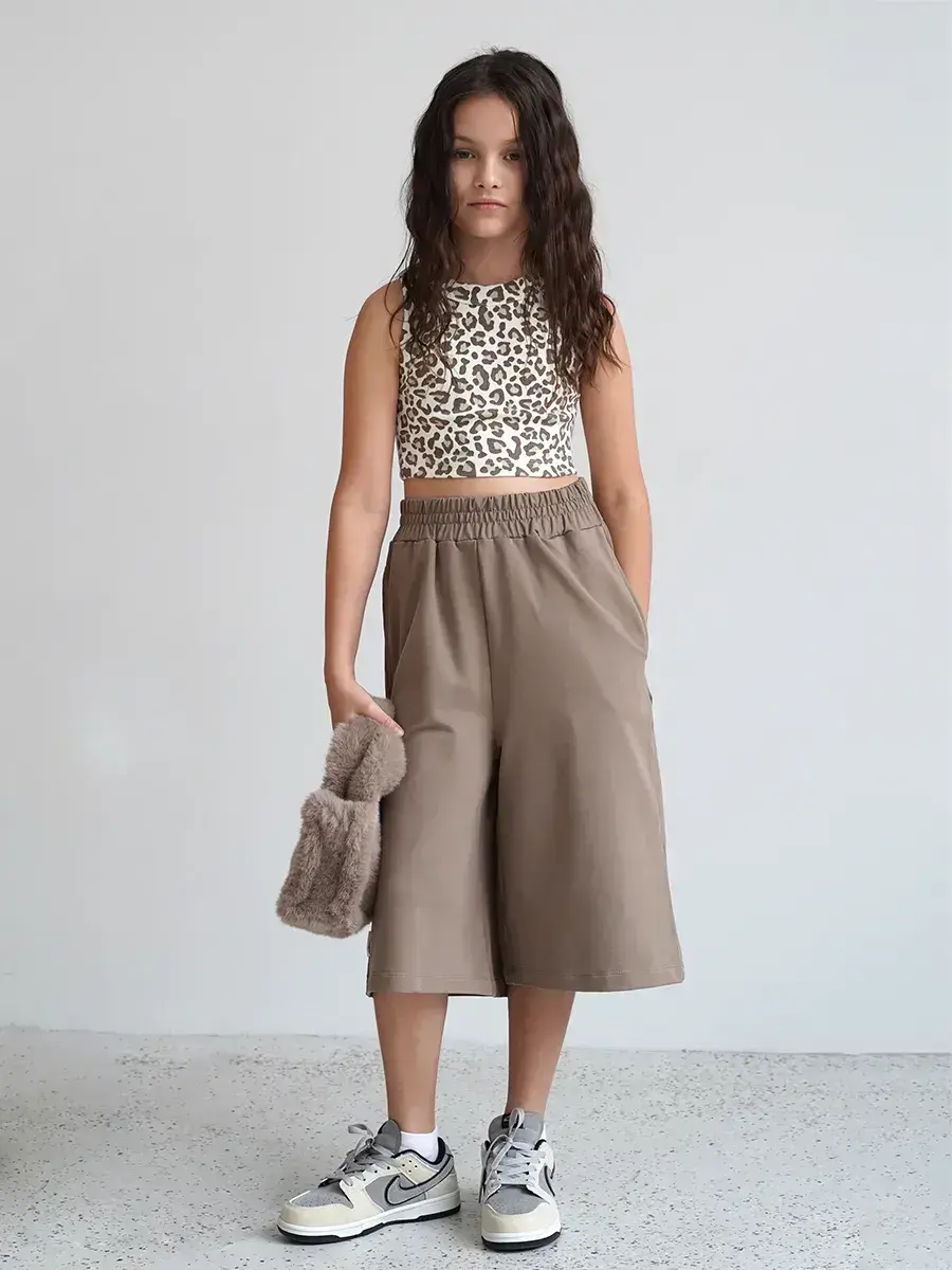 Шорты кюлоты для девочек: Изготовлены из прочного, но мягкого материала, обеспечивающего высокую износостойкость. Широкий эластичный пояс не будет давить на живот ребенка, а достаточная длина обеспечит удобство при любых активностях.