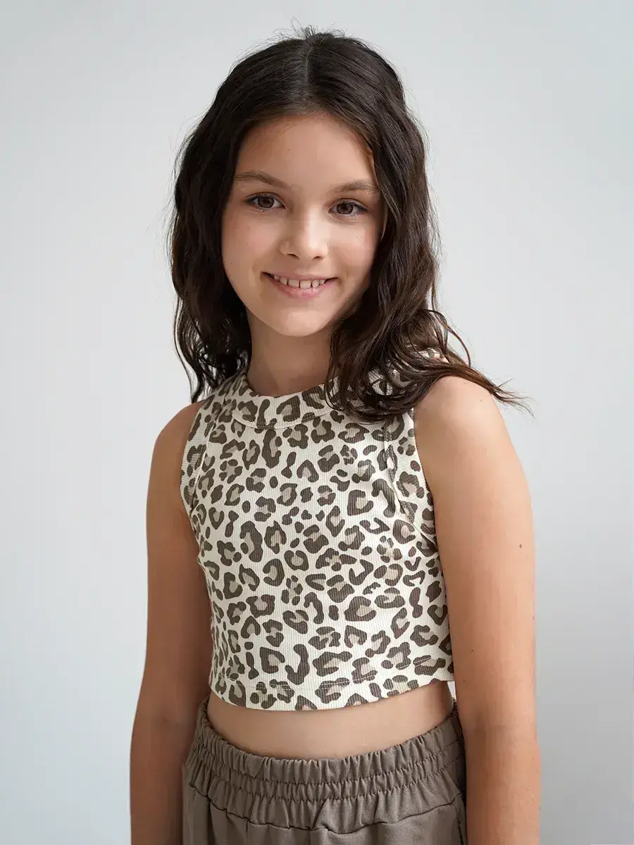 Топ для девочек с леопардовым принтом выполнен из качественного материала, который обеспечивает комфортное ношение даже в самые жаркие летние дни. Благодаря эластичной ткани топ не сковывает движения, позволяя ребенку чувствовать себя свободно.