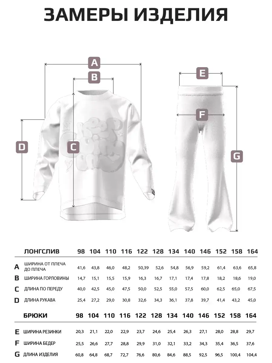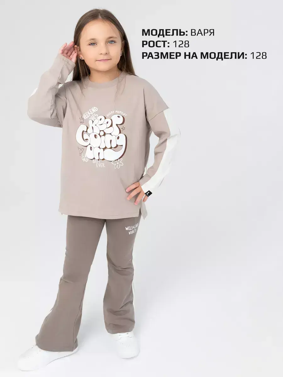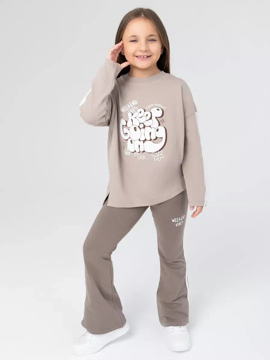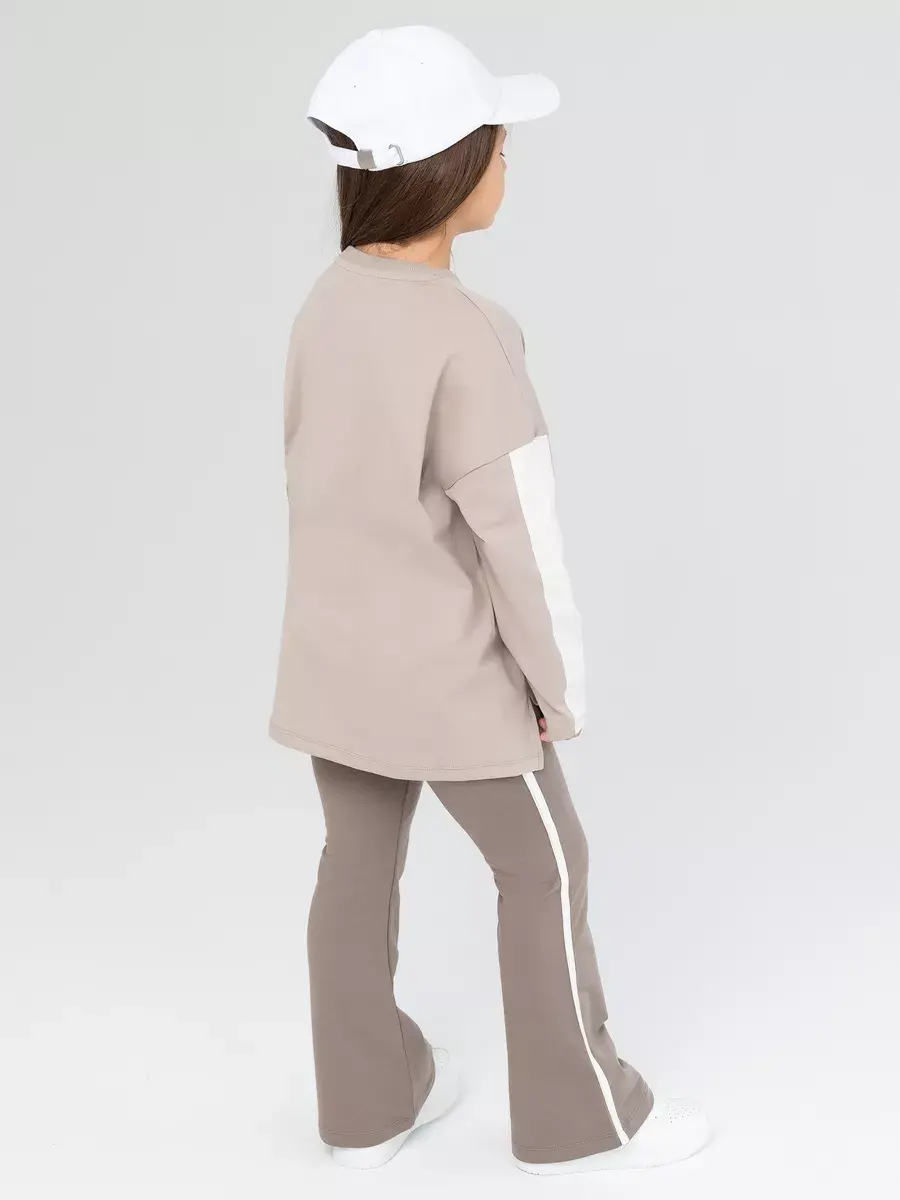 Спортивный костюм для девочек, который сочетает в себе стиль, комфорт и качество. Этот трикотажный детский костюм состоит из удобного лонгслива и модных брюк клеш, которые подарят вашей малышке свободу движений в прохладные осенние дни.