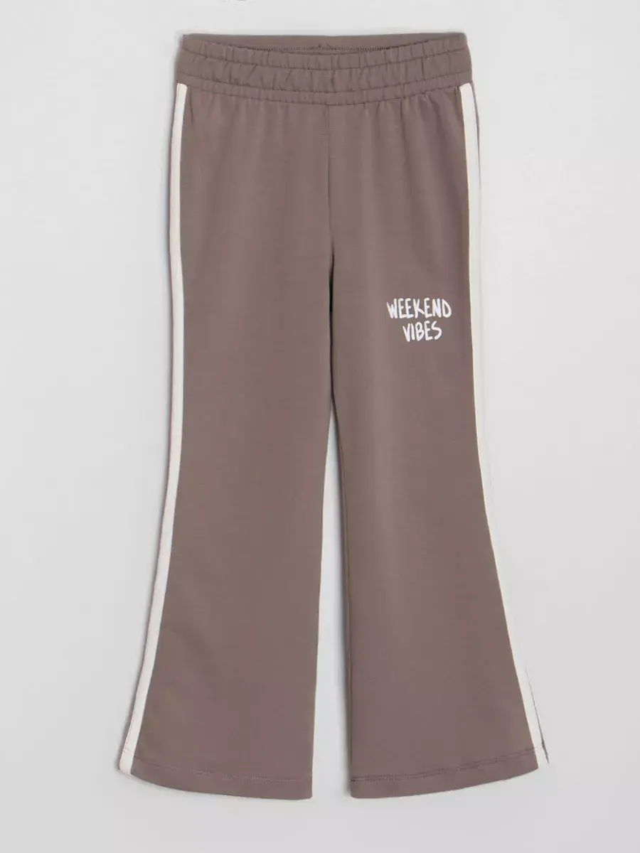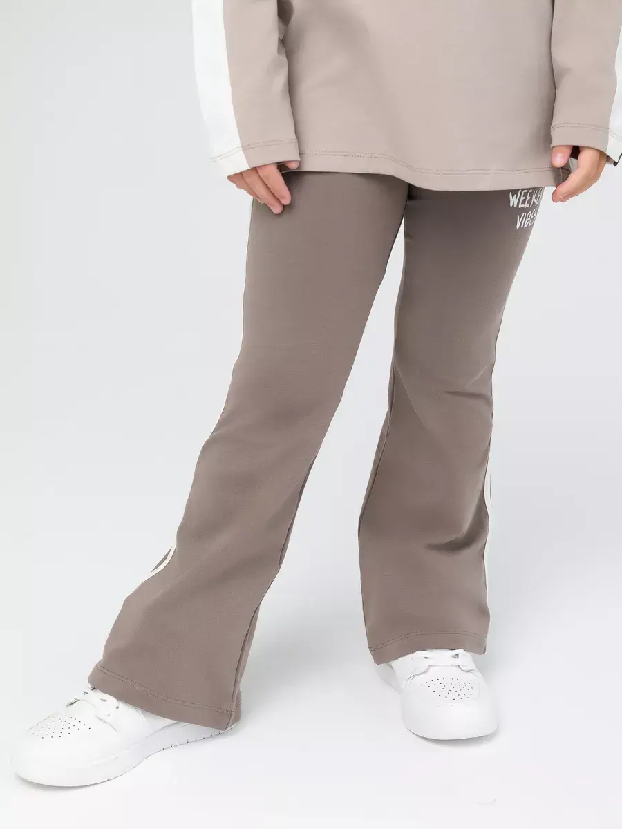Брюки клеш для девочек - выполнены также из трикотажной ткани на основе натурального хлопка. Широкий пояс на резинке не сдавливает животик ребенка и обеспечивает надежную фиксацию на талии. Расширенные от колена к низу брючины придают образу оригинальность и следуют последним модным тенденциям.