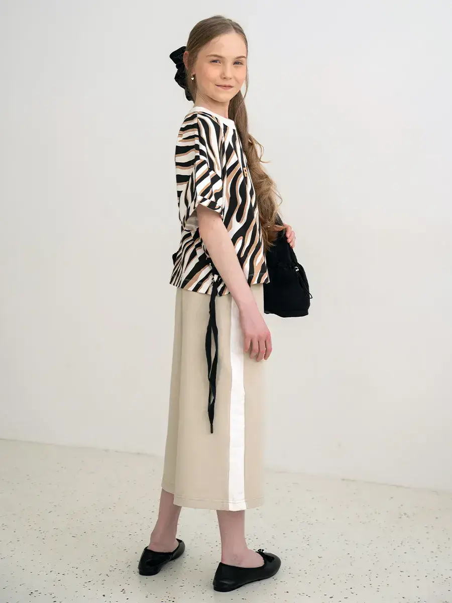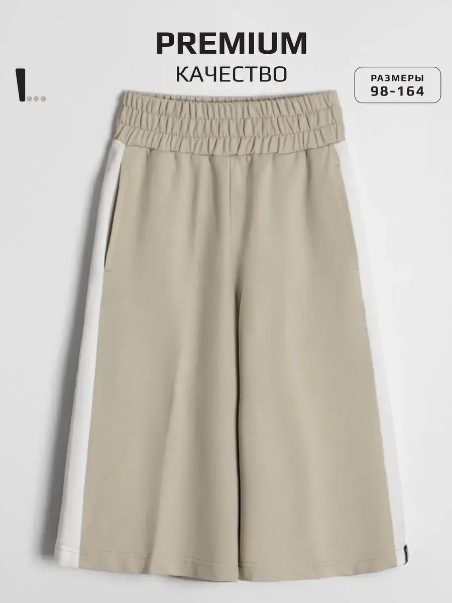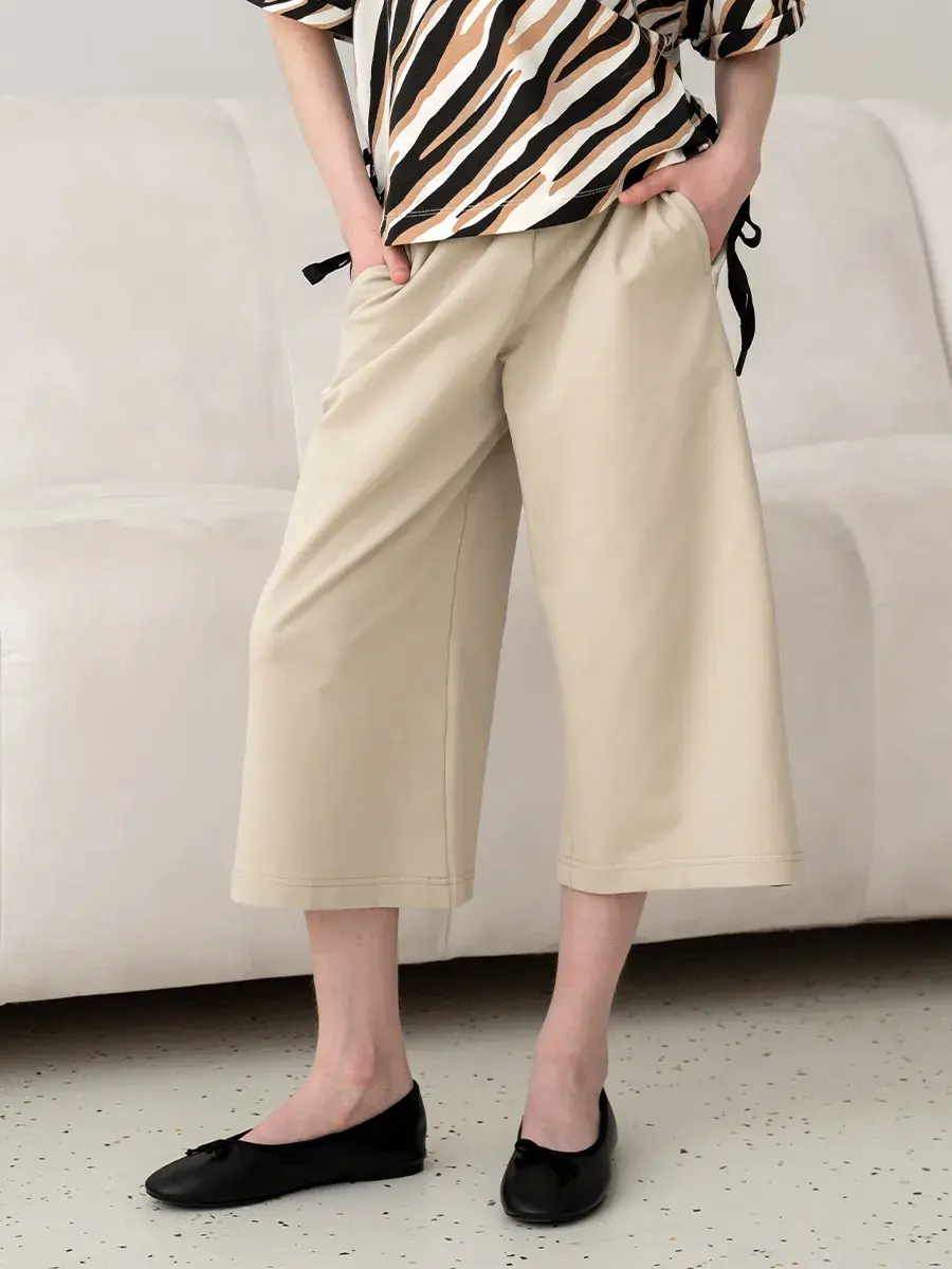 Бежевые кюлоты для девочек выполнены из качественных материалов, что обеспечивает долговечность изделия. Штаны палаццо для девочки имеют резинку на талии, которая позволяет регулировать размер и обеспечивает удобную посадку на фигуре.