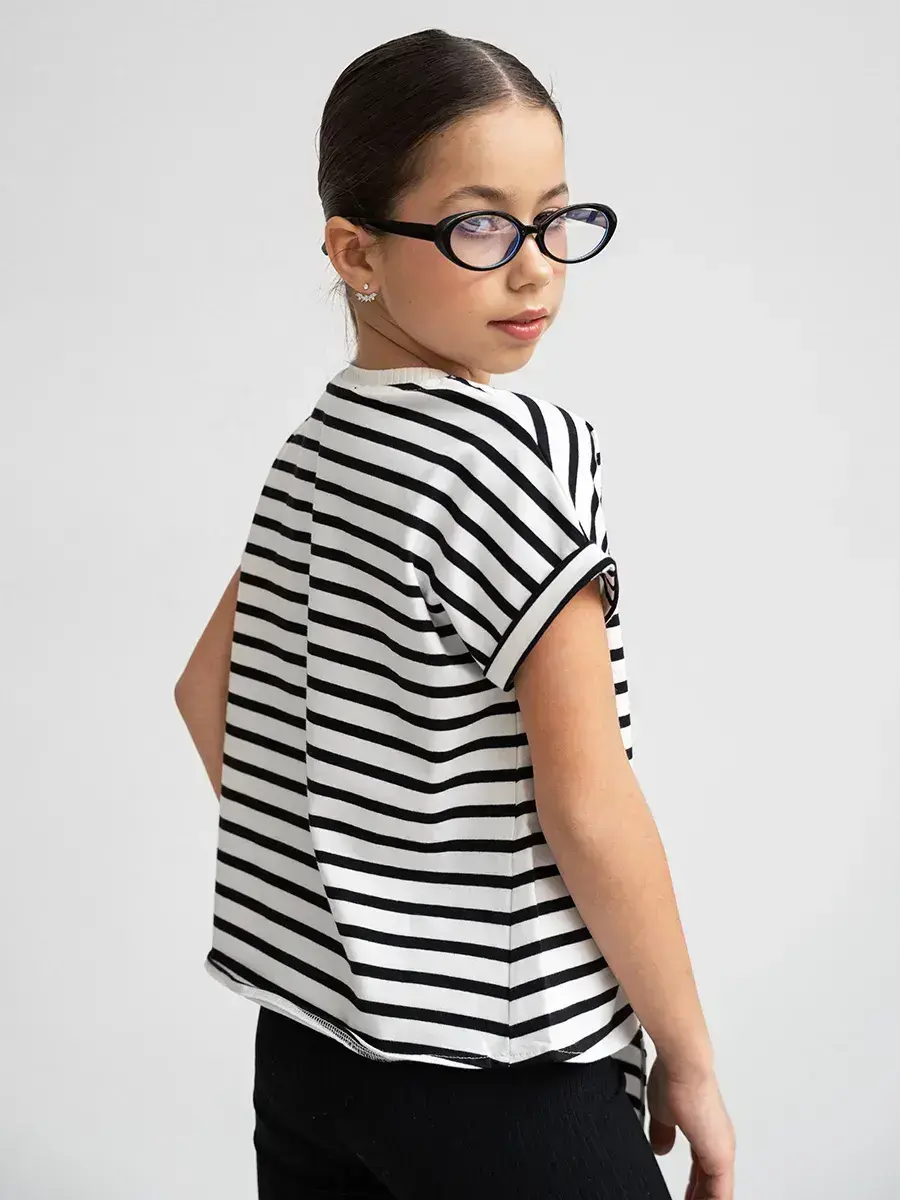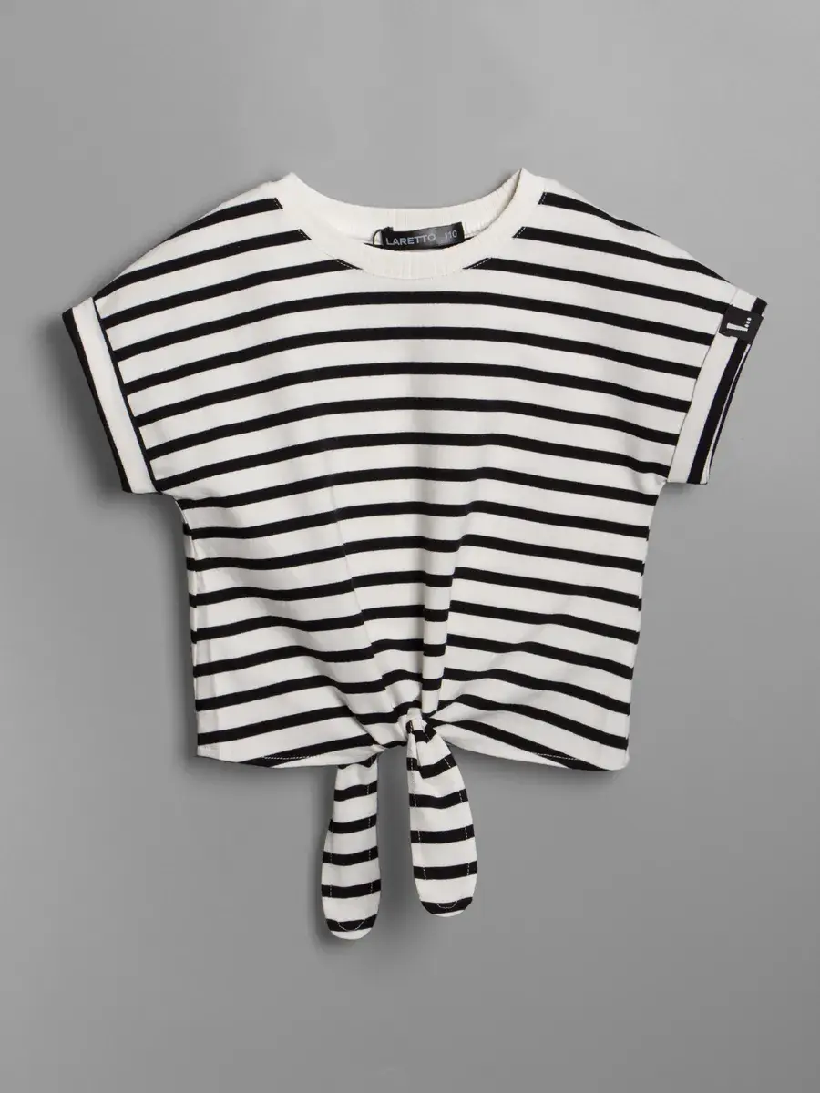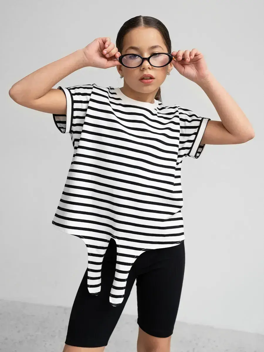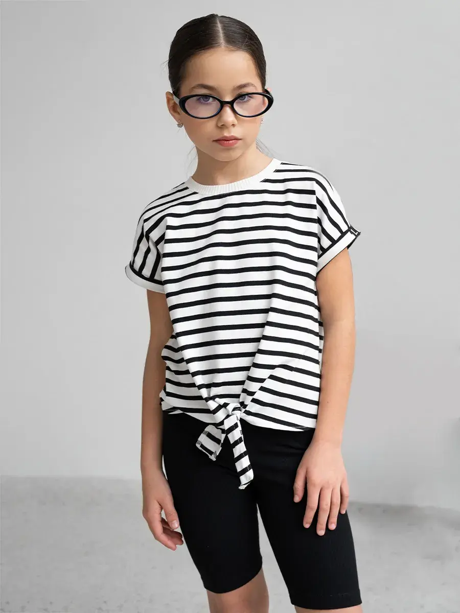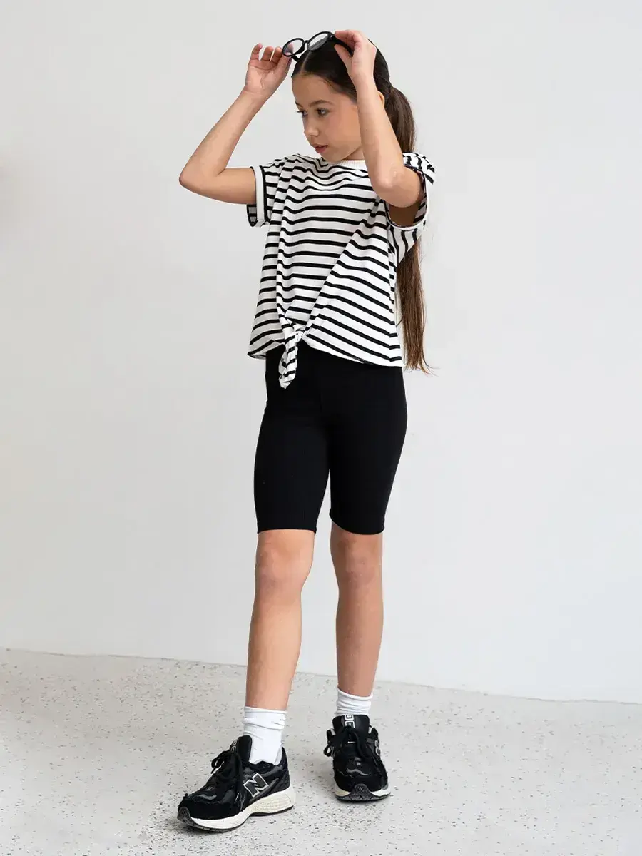 Топ с завязками и велосипедки выглядят стильно не только во время занятий спортом, но и на прогулке. Идеальный крой и качественное исполнение в сочетании с большим размерным рядом позволит подобрать модель не только для малышей, но и для подростков. Одежда для девочек не сковывает движений и подойдет для дома и отдыха. Спортивные шортики создают красивый силуэт, подчеркивают талию, а широкая резинка не оставляет следов на коже. Укороченная футболка тельняшка - хит этого сезона!