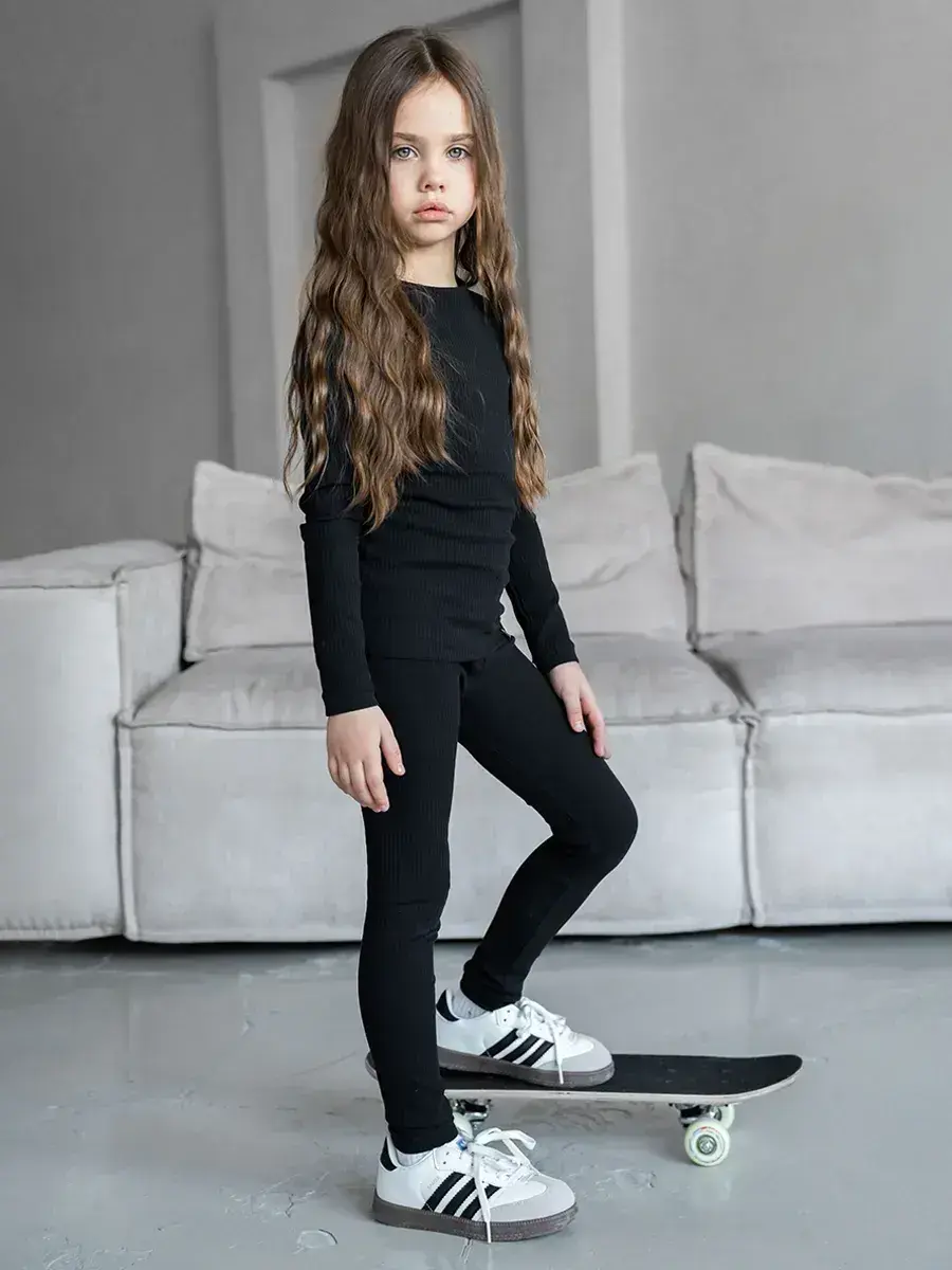 Этот универсальный детский комплект идеально подходит как для малышей, так и для подростков, обеспечивая комфорт и свободу движений в любое время года. Лонгслив для девочки выполнен из мягкого трикотажного материала, который дышит и приятно ощущается на коже, а леггинсы в рубчик обеспечивают отличную посадку и поддержку.