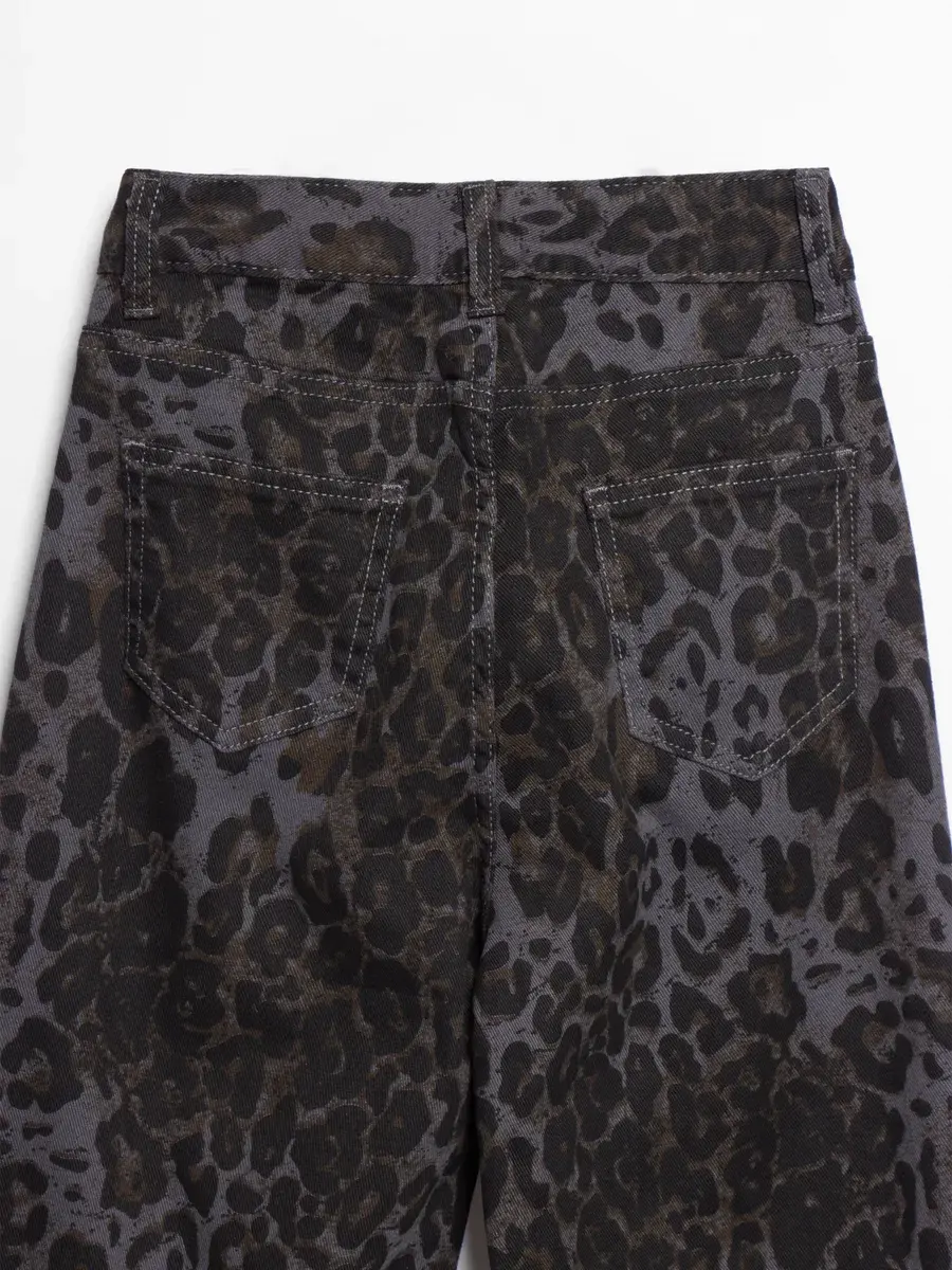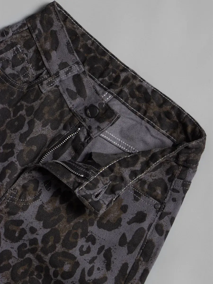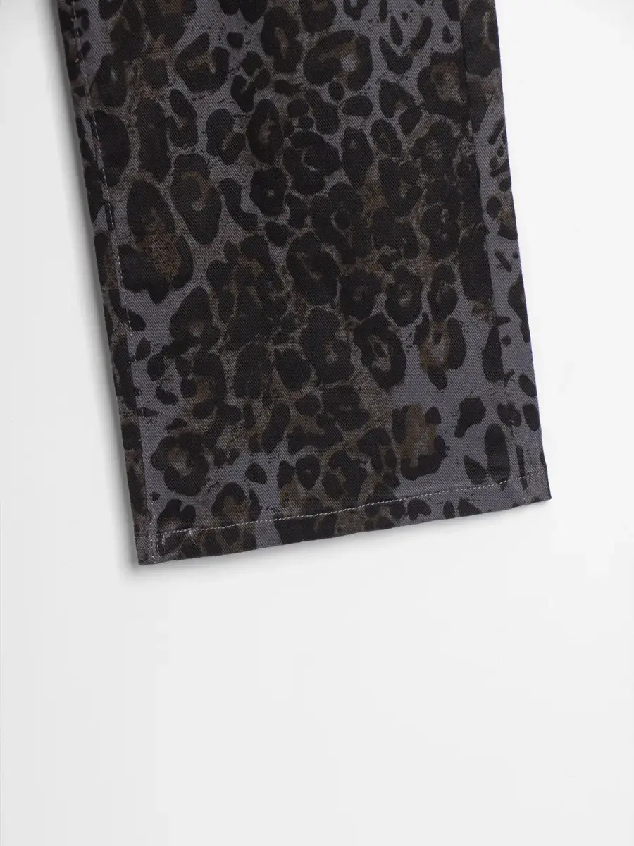 Джинсы выполнены из плотного денима темно-серого оттенка с эффектом варенки — ткань имеет легкую неравномерную окраску, что придает изделию глубину и текстуру. По всему полотну распределен крупный леопардовый принт — пятна насыщенного черного и темно-оливкового цвета на серо-графитовом фоне. Это не просто леопард, а современная интерпретация, которая выглядит стильно и не слишком кричаще — идеально для школы и повседневной носки.