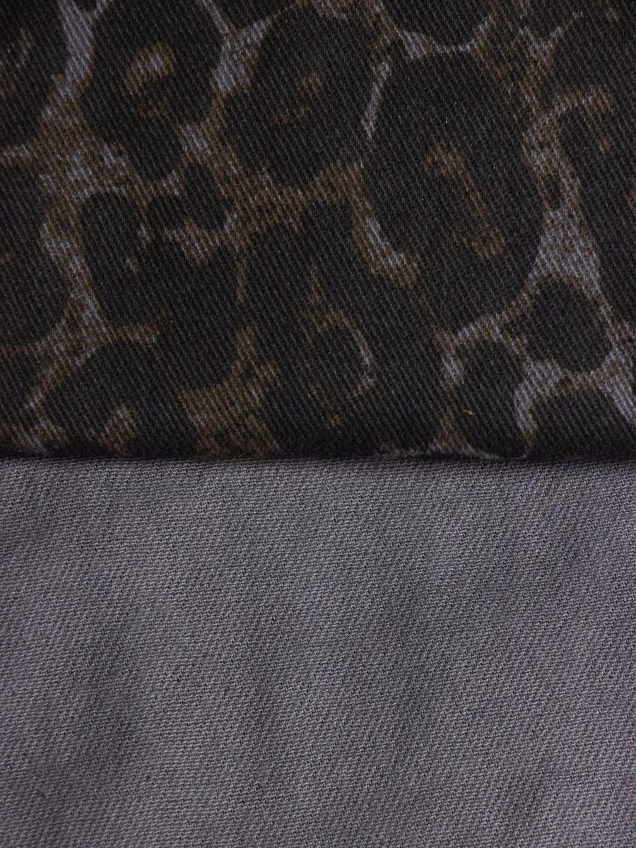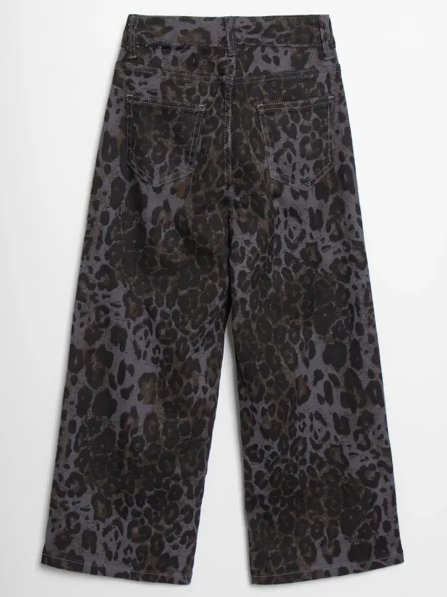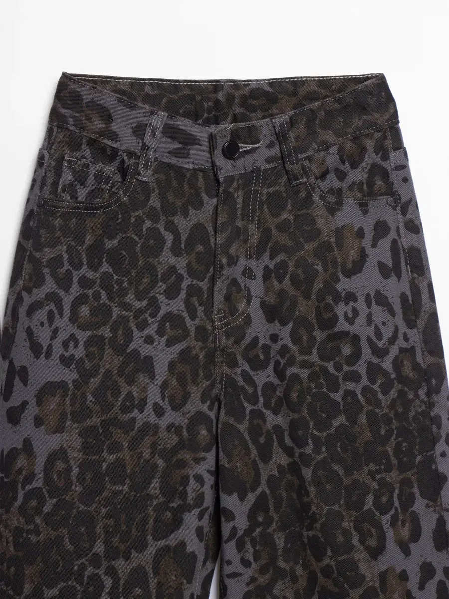 Джинсы выполнены из плотного денима темно-серого оттенка с эффектом варенки — ткань имеет легкую неравномерную окраску, что придает изделию глубину и текстуру. По всему полотну распределен крупный леопардовый принт — пятна насыщенного черного и темно-оливкового цвета на серо-графитовом фоне. Это не просто леопард, а современная интерпретация, которая выглядит стильно и не слишком кричаще — идеально для школы и повседневной носки.