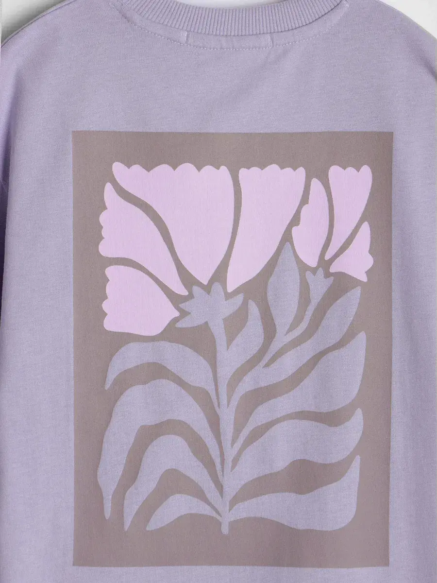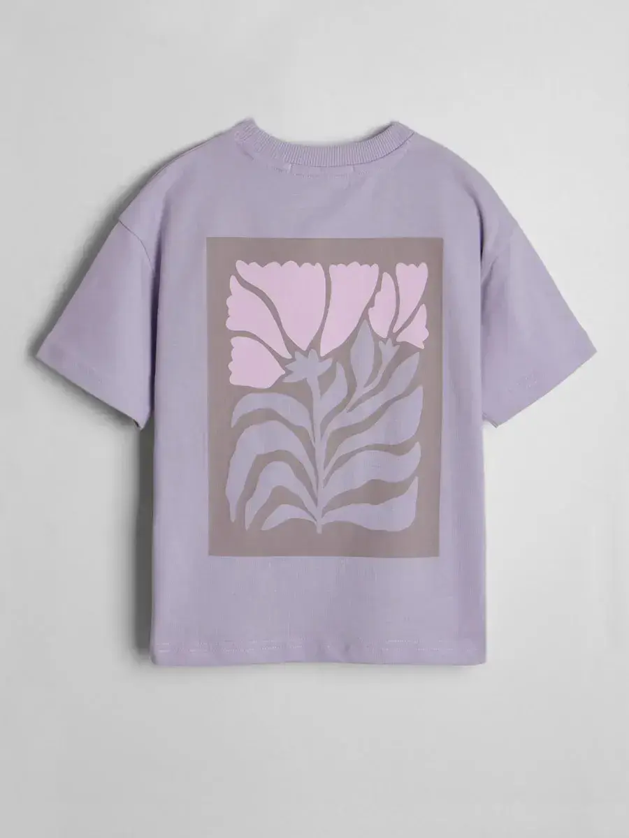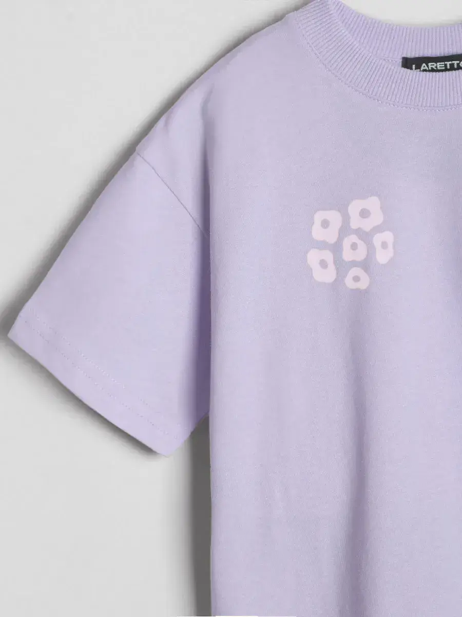 Трикотажная футболка оверсайз с принтом для девочек от LARETTO, идеальную для стильных и комфортных образов. Эта сиреневая детская футболка с принтом в виде цветов выполнена в модном оверсайз крое, что обеспечивает свободу движений и комфорт в носке.