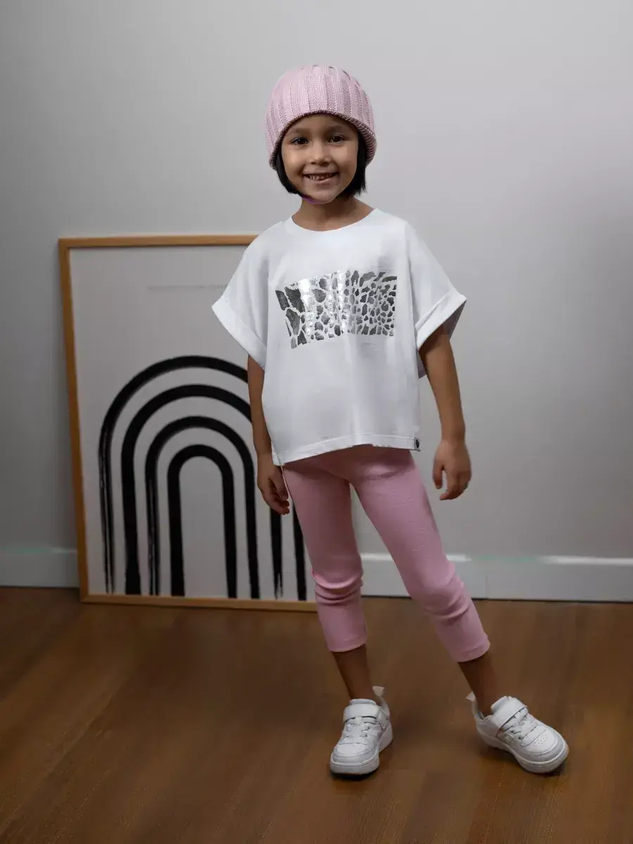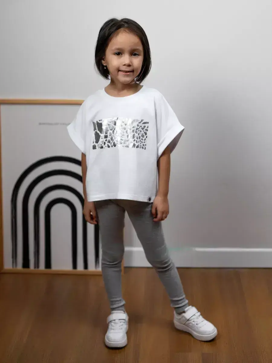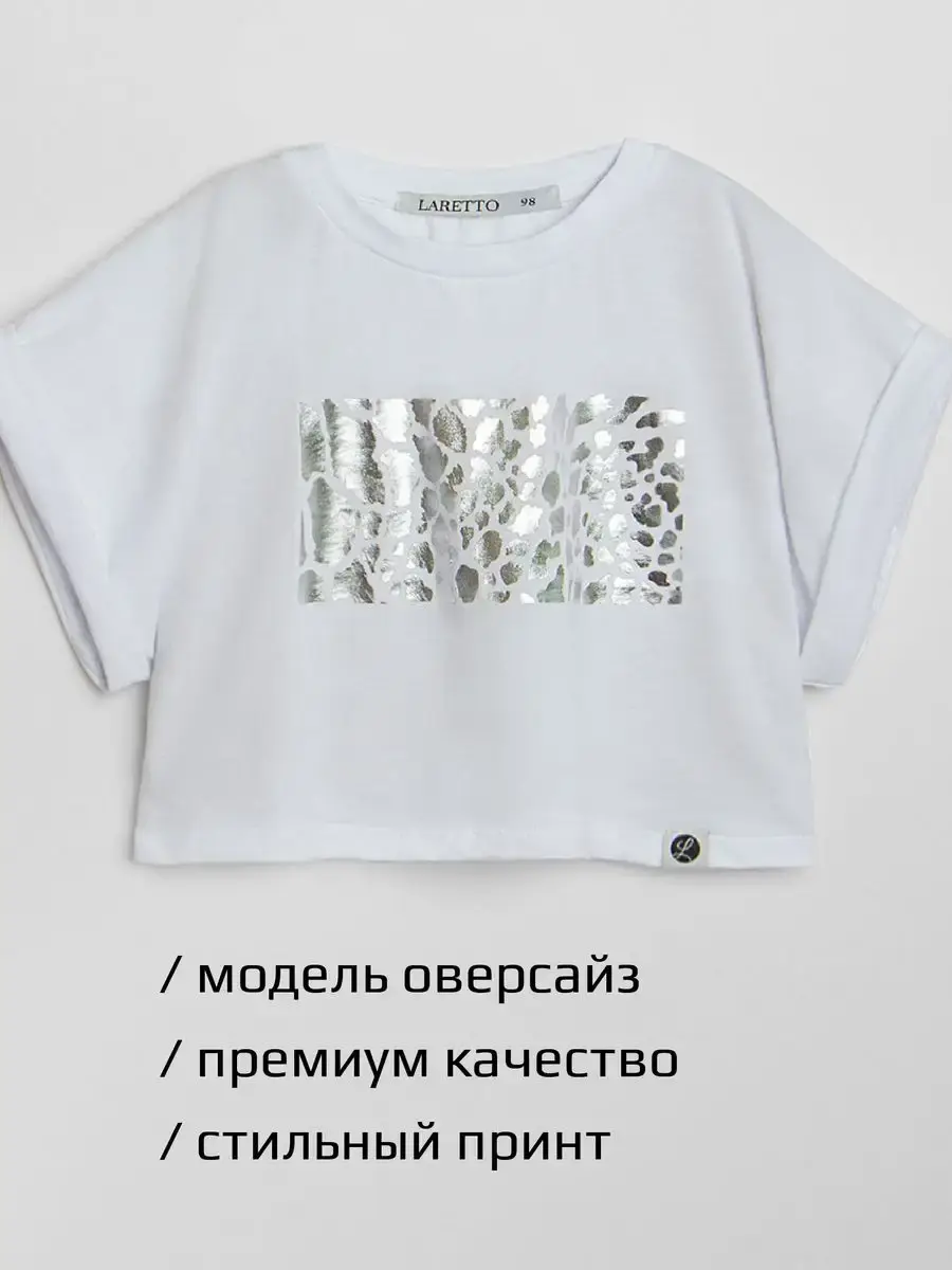 Футболка для девочки — стильный и комфортный выбор для повседневного гардероба. Свободный крой оверсайз, спущенная линия плеча и прямой широкий рукав создают модный образ в духе современных тенденций. Благодаря удобному фасону, эта футболка детская идеально подходит для активного отдыха, занятий спортом, детского сада или дома.
