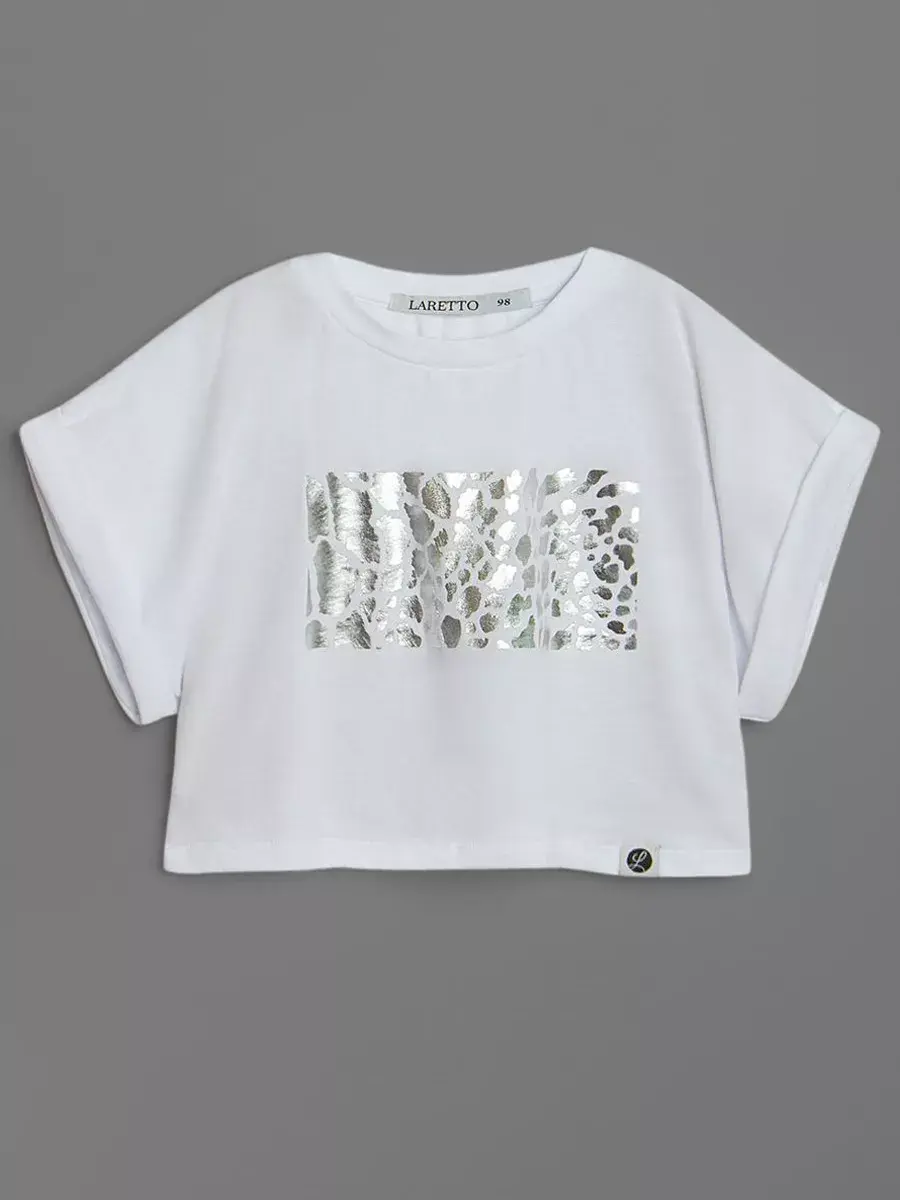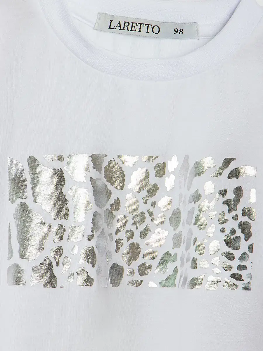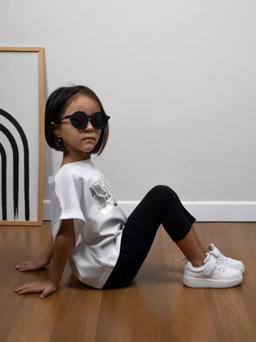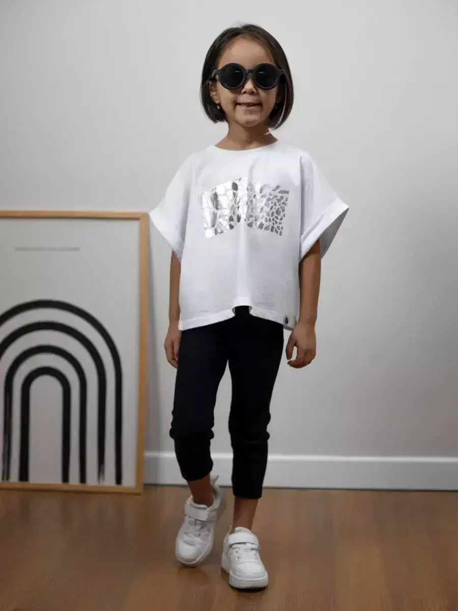Футболка для девочки — стильный и комфортный выбор для повседневного гардероба. Свободный крой оверсайз, спущенная линия плеча и прямой широкий рукав создают модный образ в духе современных тенденций. Благодаря удобному фасону, эта футболка детская идеально подходит для активного отдыха, занятий спортом, детского сада или дома.