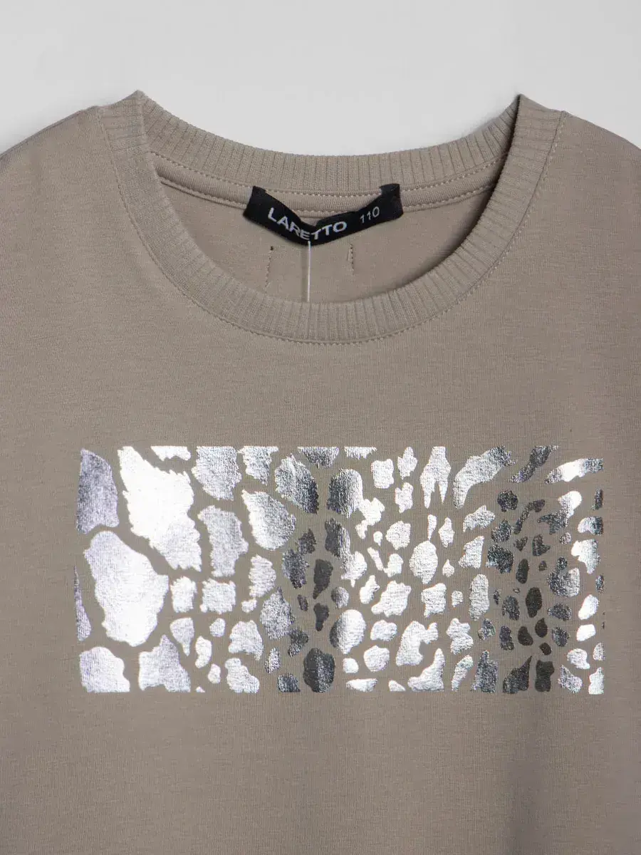 Футболка для девочки — стильный и комфортный выбор для повседневного гардероба. Свободный крой оверсайз, спущенная линия плеча и прямой широкий рукав создают модный образ в духе современных тенденций. Благодаря удобному фасону, эта футболка детская идеально подходит для активного отдыха, занятий спортом, детского сада или дома.