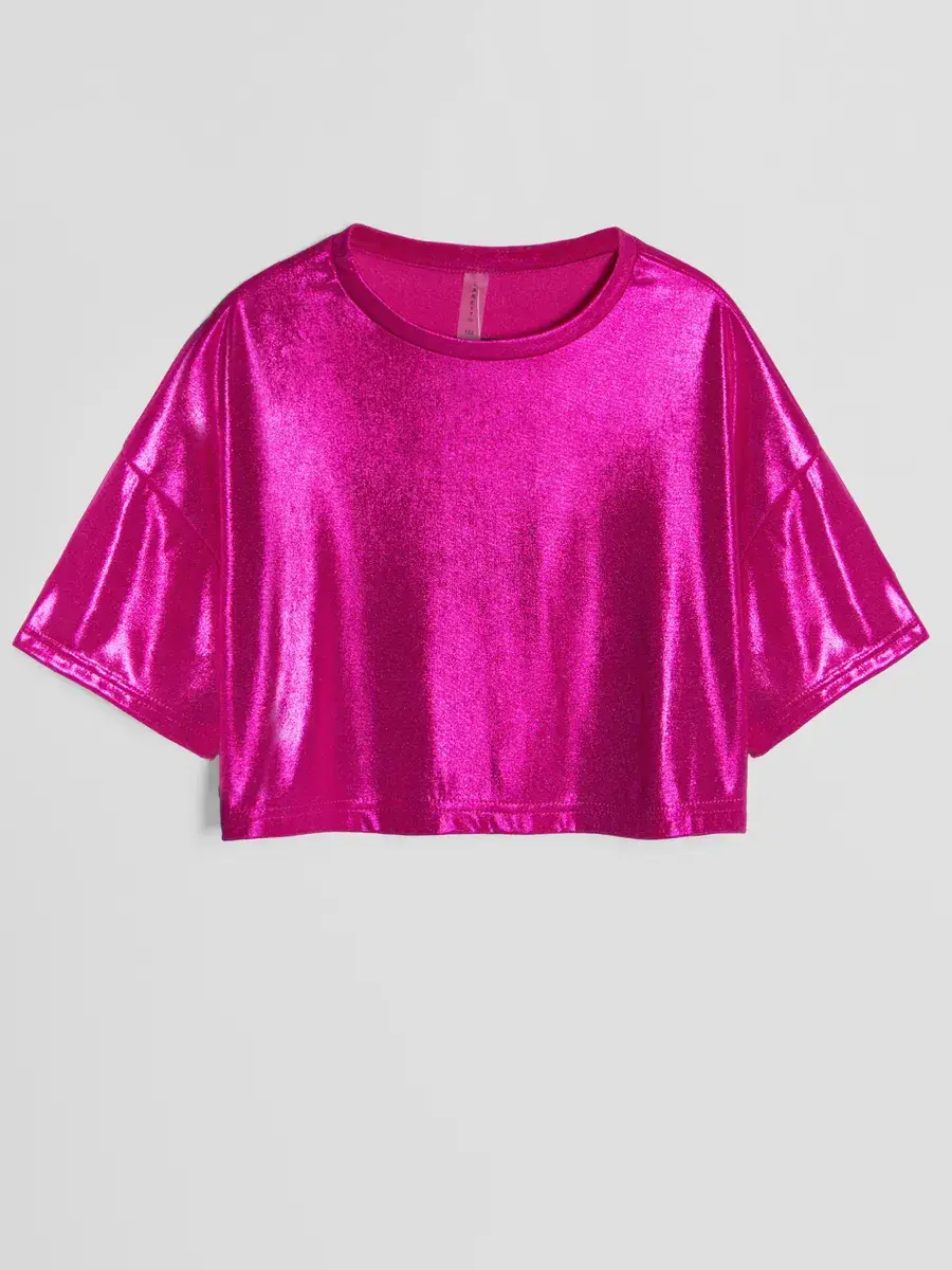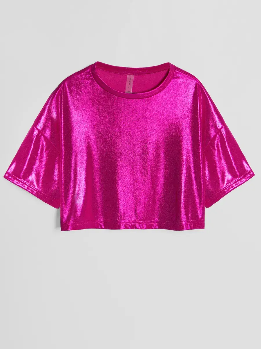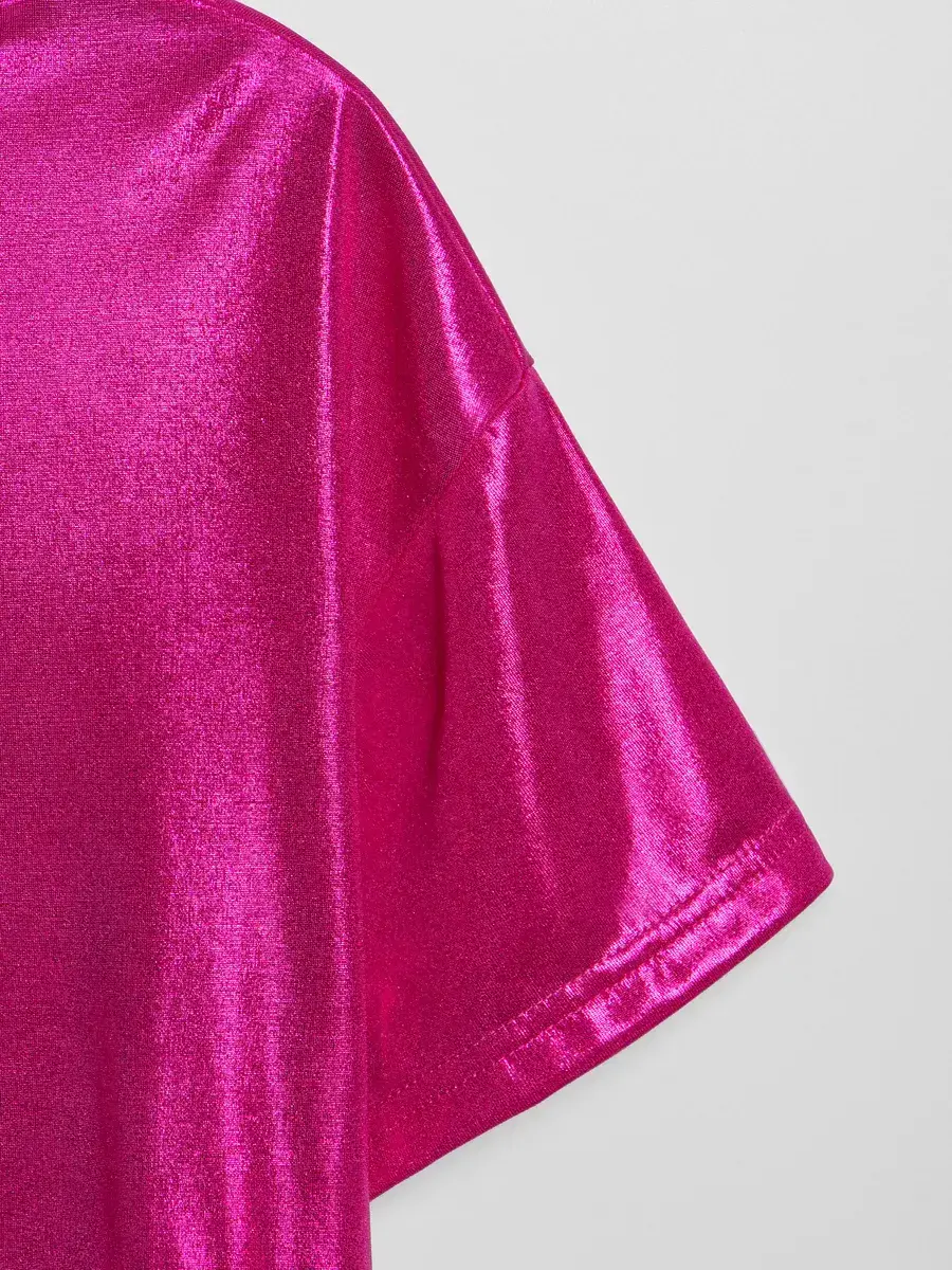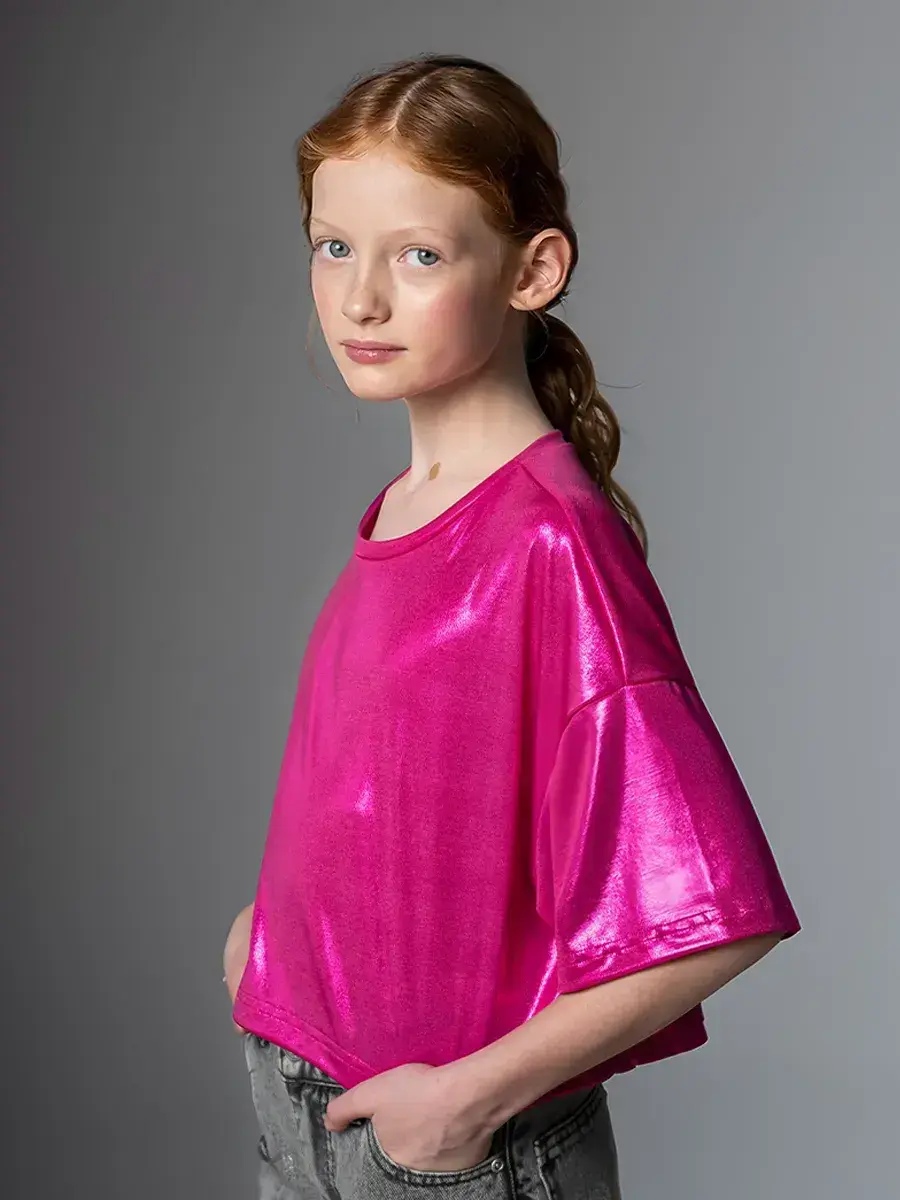 Изготовлена из струящейся ткани с эффектом масла, эта трикотажная модель обладает приятной текстурой и лёгким блеском. Оверсайз подходит как подросткам, так и маленьким детям, делая её универсальной. Милые детали подойдут для фотосессий или праздничных мероприятий.