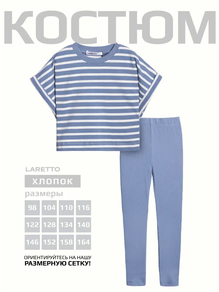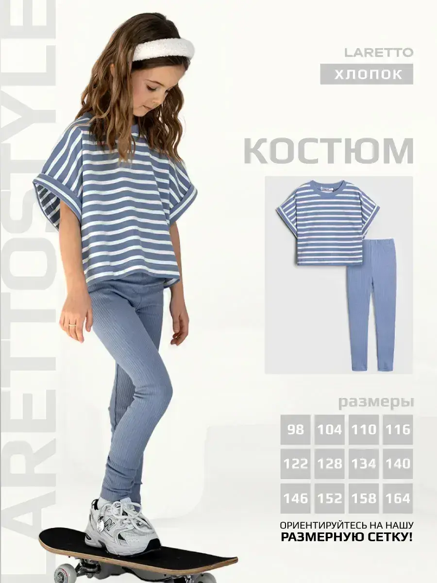 Представляем стильный и удобный костюм для девочки летний, состоящий из футболки и леггинсов в рубчик. Этот универсальный детский комплект идеально подходит как для малышей, так и для подростков, обеспечивая комфорт и свободу движений в любое время года. Футболка для девочки выполнена из мягкого трикотажного материала, который дышит и приятно ощущается на коже, а леггинсы обеспечивают отличную посадку и поддержку.