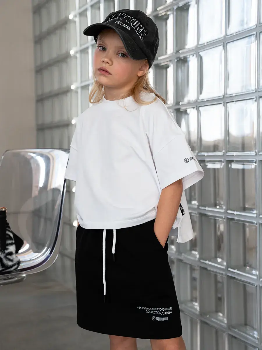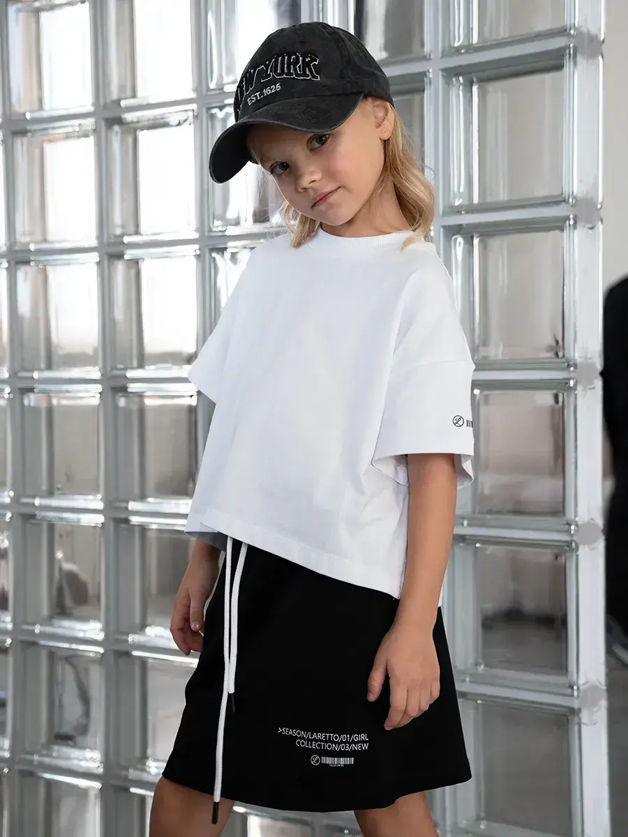 Юбка имеет эластичный пояс, что обеспечивает идеальную посадку и свободу движений. Она выполнена из легкого материала, который не сковывает движения и позволяет девочке легко играть и бегать. Дизайн юбки прекрасно сочетается с футболкой, создавая стильный образ для любого случая.