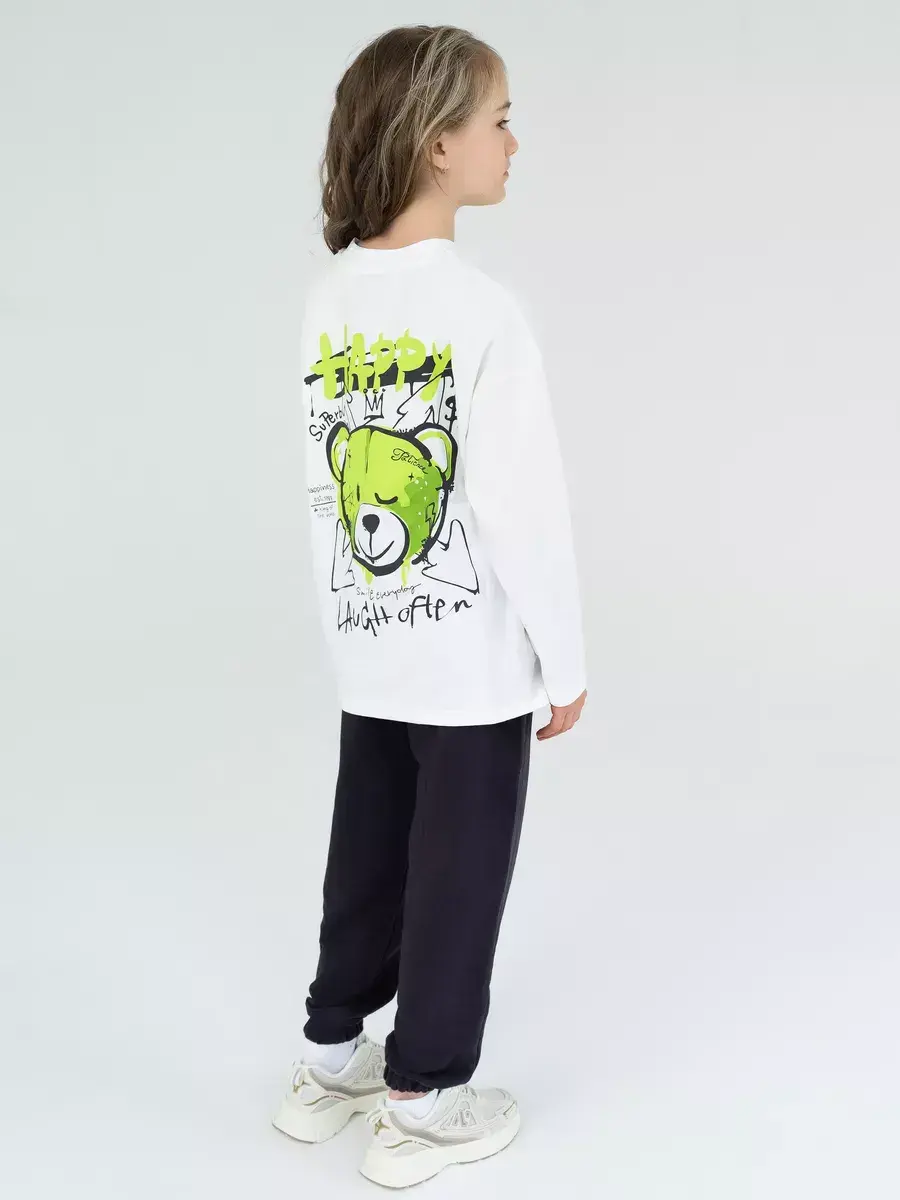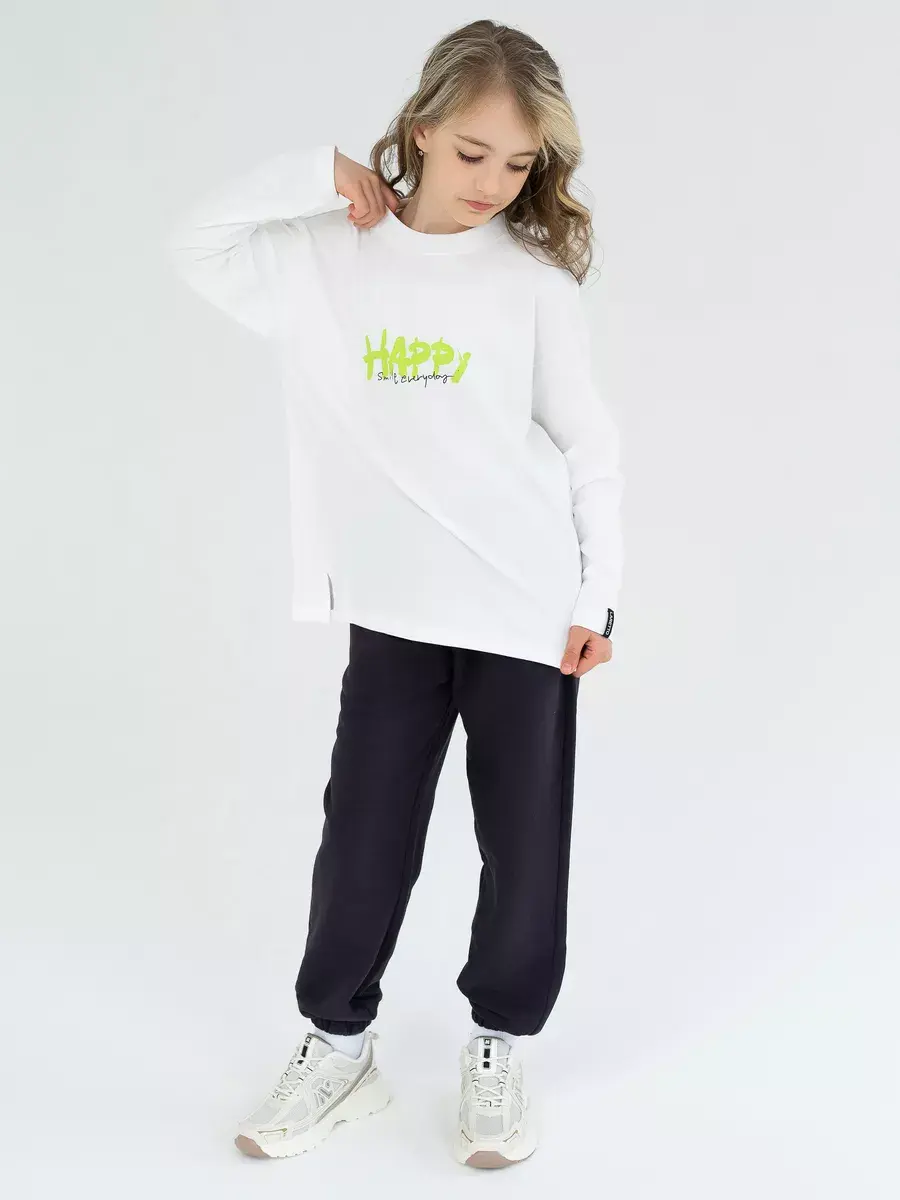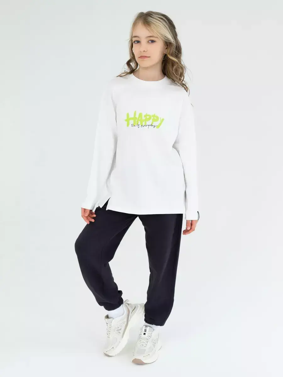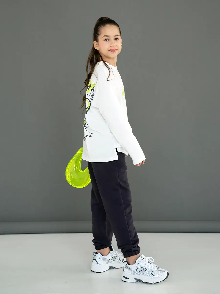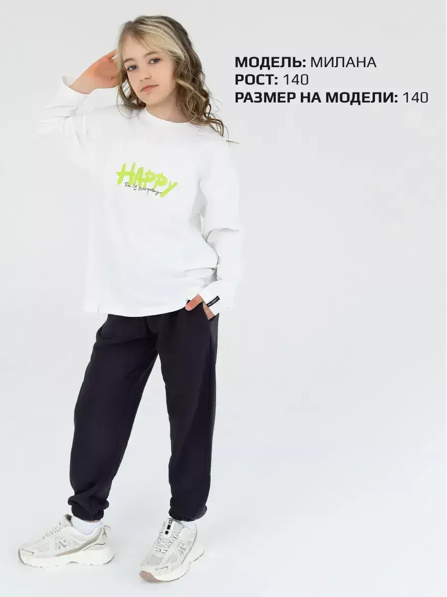 Он идеален для подростков, которые ценят комфорт и свободу движений. Лонгслив для девочек оверсайз выполнен из качественного хлопка. Уникальный дизайн с разрезами по бокам и яркий рисунок подчеркнет индивидуальность и бунтарский нрав своей обладательницы. Однотонные брюки из футера 2-х нитки хорошо садятся на любой тип фигуры. Спортивные штаны джоггеры для девочки отлично сочетаются с любым верхом, например худи или футболкой.