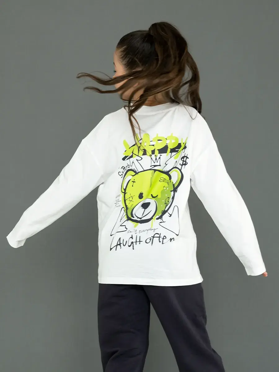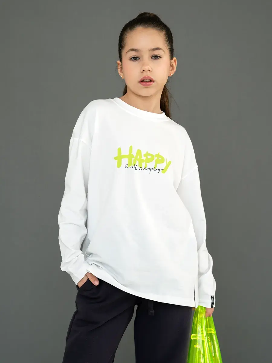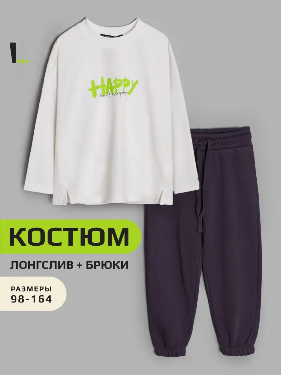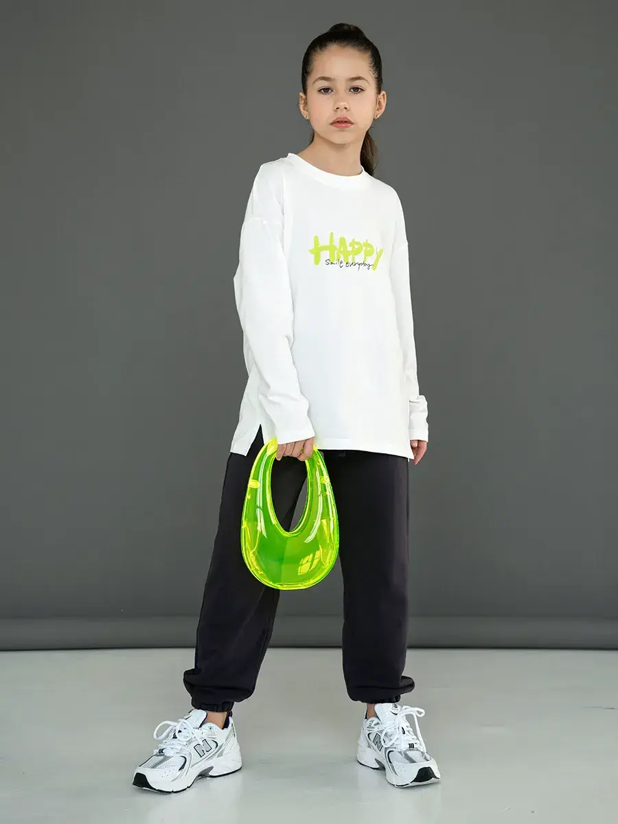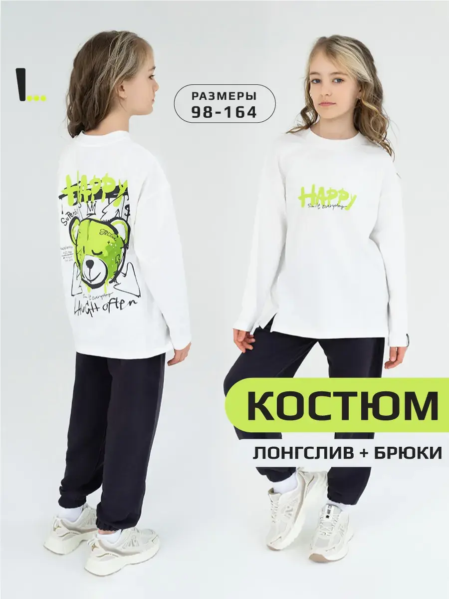 Он идеален для подростков, которые ценят комфорт и свободу движений. Лонгслив для девочек оверсайз выполнен из качественного хлопка. Уникальный дизайн с разрезами по бокам и яркий рисунок подчеркнет индивидуальность и бунтарский нрав своей обладательницы. Однотонные брюки из футера 2-х нитки хорошо садятся на любой тип фигуры. Спортивные штаны джоггеры для девочки отлично сочетаются с любым верхом, например худи или футболкой.