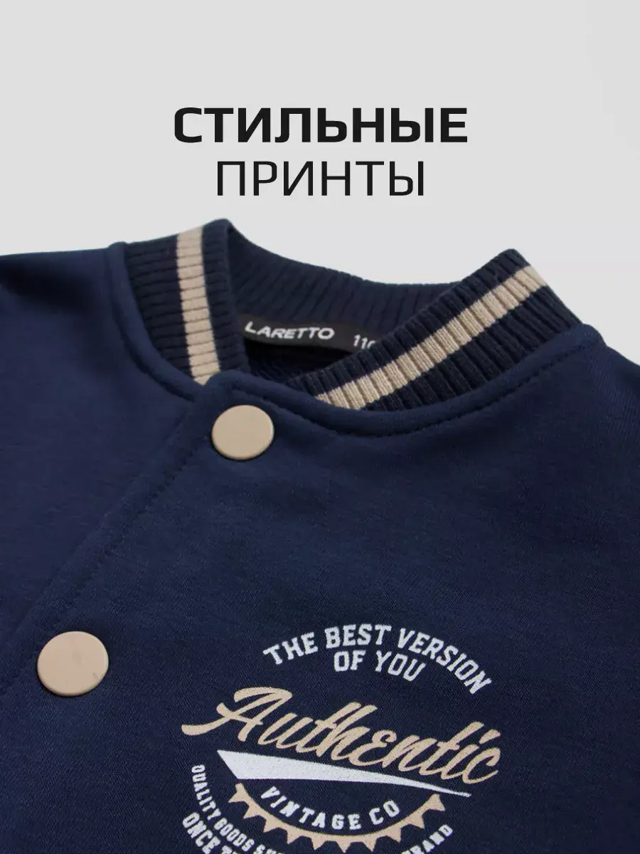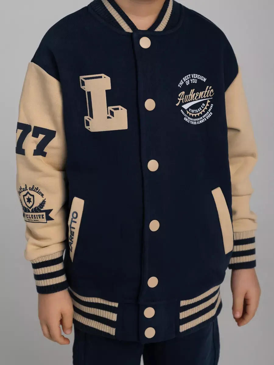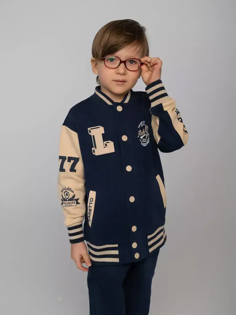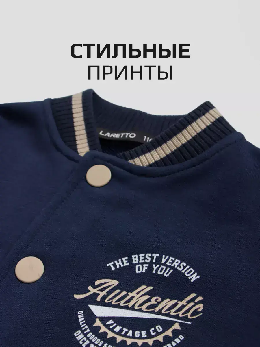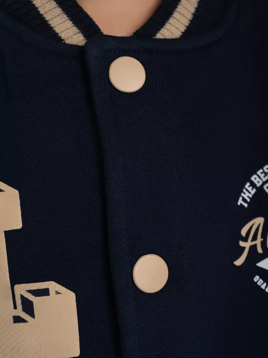 Бомбер для мальчика школьный: Изготовлено из высококачественного материала, который обеспечивает тепло в прохладную погоду. Стильная детская кофта на кнопках украшена ярким принтом и надписями, добавляя игривости в образ.
