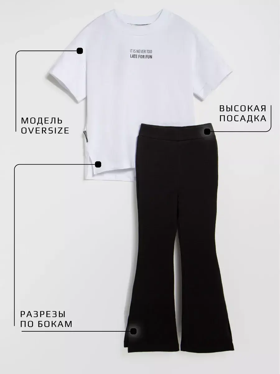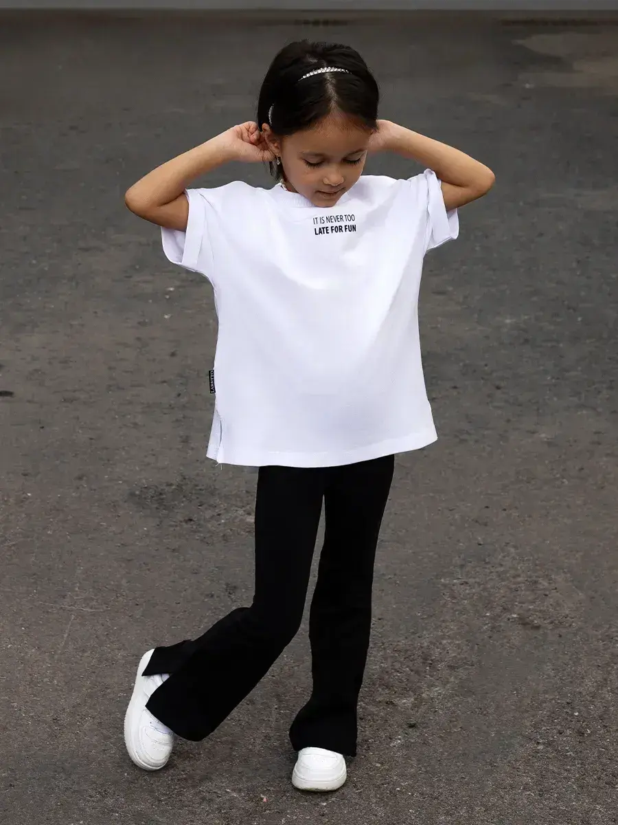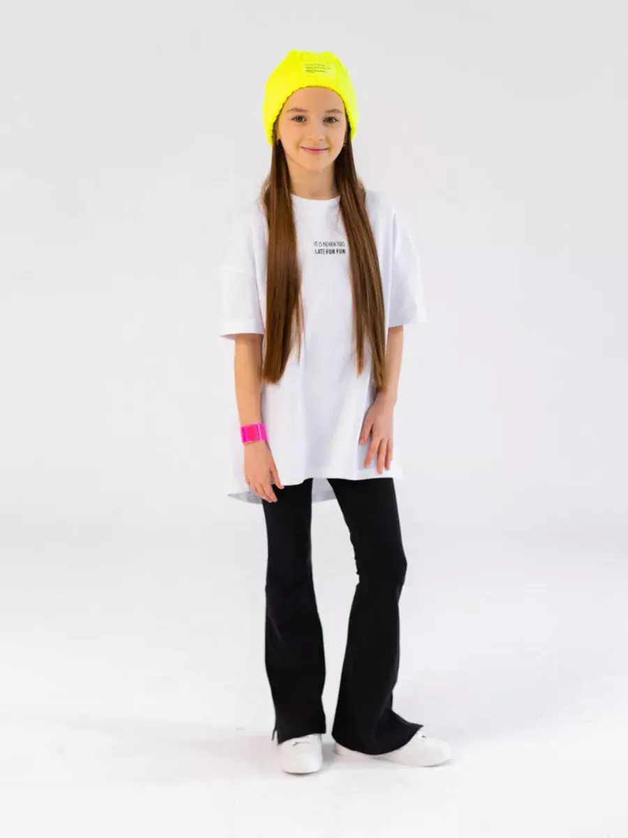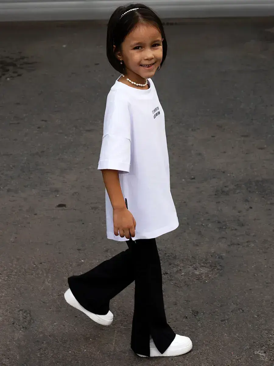 Костюм для девочки, который сочетает в себе стиль, комфорт и качество. Этот трикотажный летний костюм для девочки состоит из удобной футболки оверсайз и модных брюк клеш, которые подарят вашей малышке свободу движений в прохладные весенние дни.