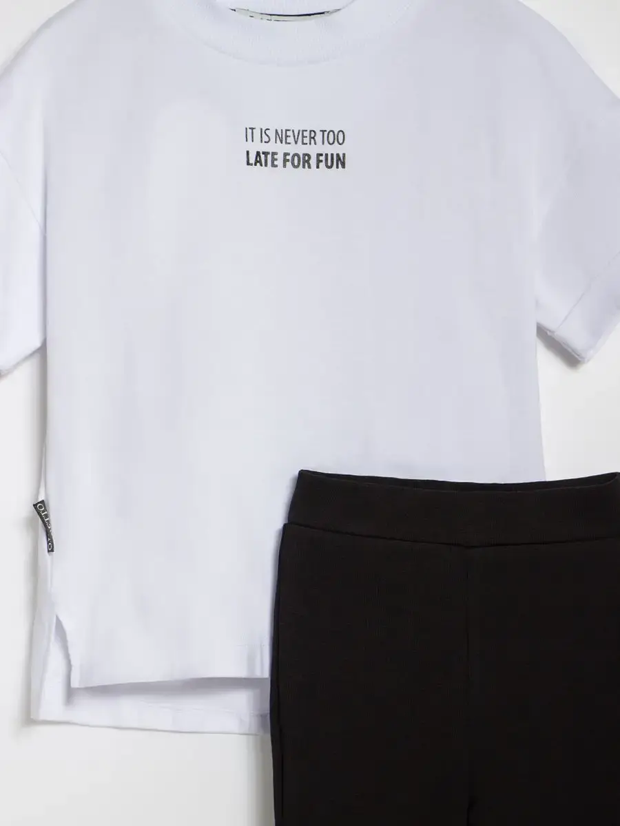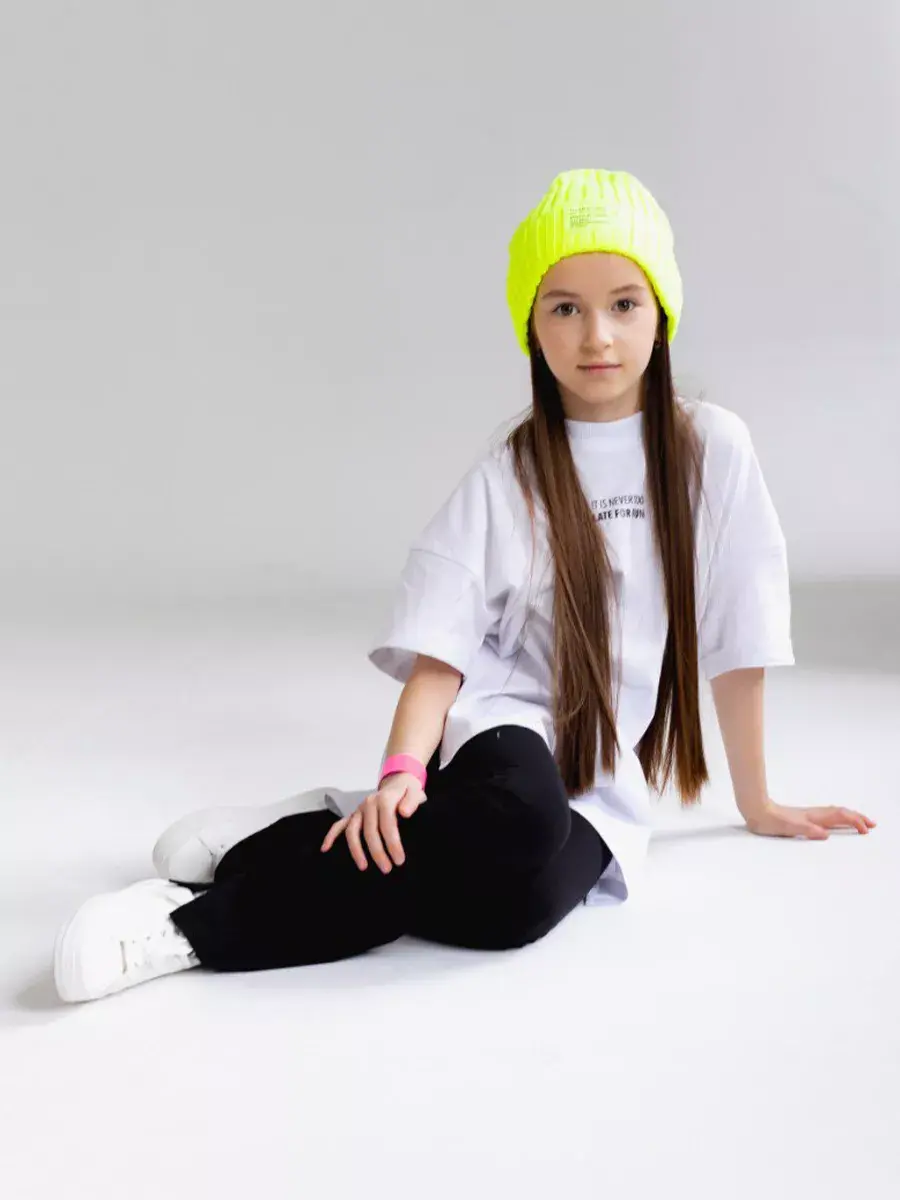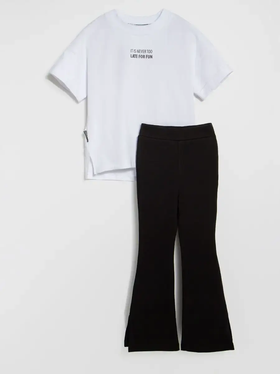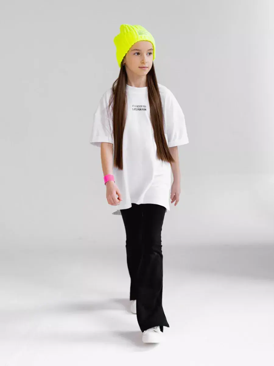 Костюм для девочки, который сочетает в себе стиль, комфорт и качество. Этот трикотажный летний костюм для девочки состоит из удобной футболки оверсайз и модных брюк клеш, которые подарят вашей малышке свободу движений в прохладные весенние дни.