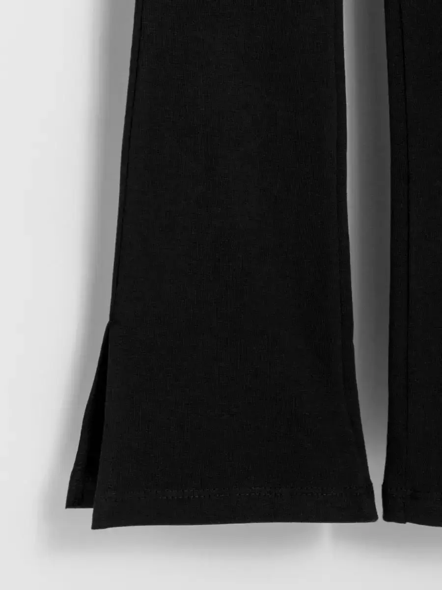 Брюки клеш для девочек - выполнены также из трикотажной ткани на основе натурального хлопка. Широкий пояс на резинке не сдавливает животик ребенка и обеспечивает надежную фиксацию на талии. Расширенные от колена к низу брючины придают образу оригинальность и следуют последним модным тенденциям.