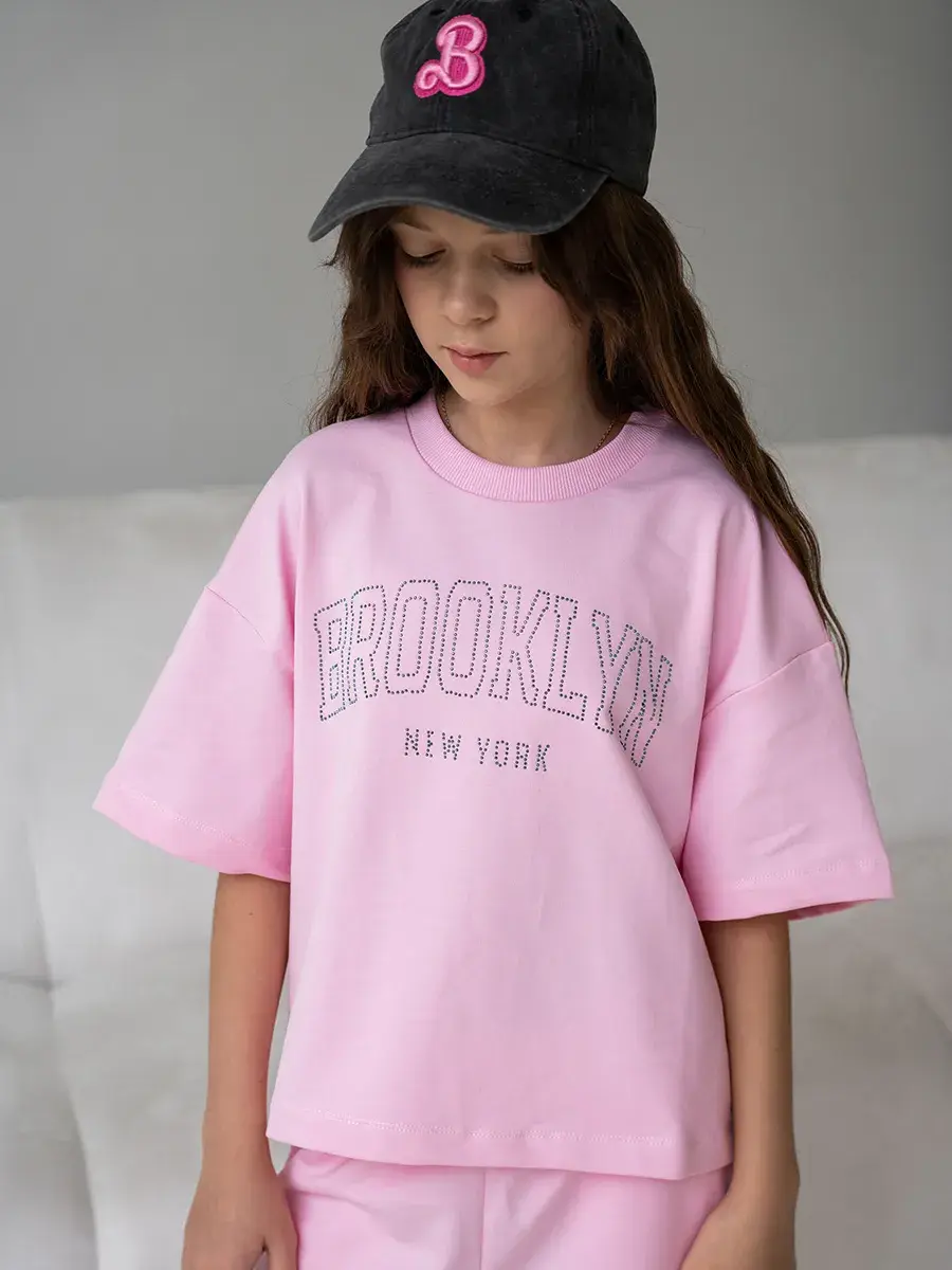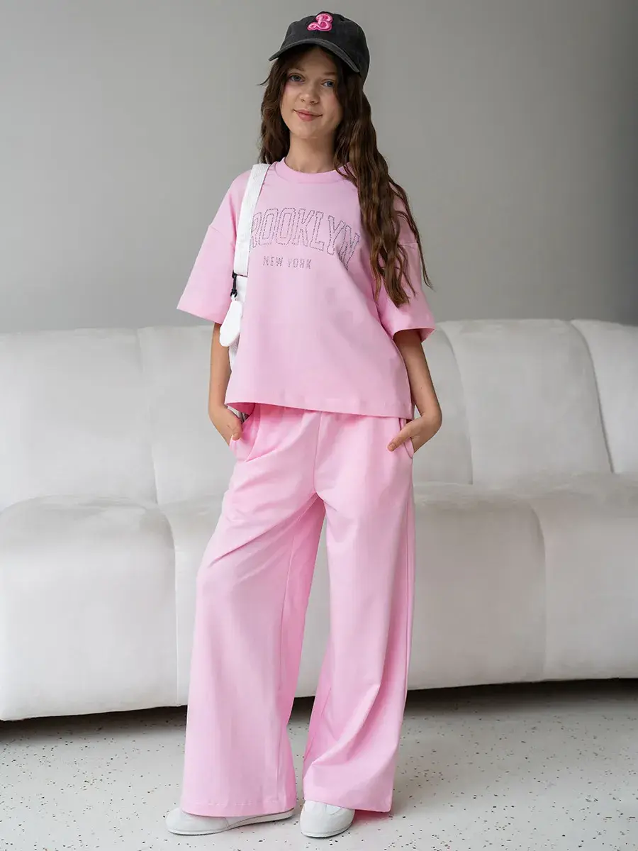 Футболка украшена модным принтом Brooklyn (бруклин), что делает образ современным и стильным. Такой дизайн особенно понравится тем, кто подбирает костюм для девочки подростка — он выглядит модно и актуально. Свободный крой не стесняет движений, а мягкий дышащий материал обеспечивает комфорт даже в жаркую погоду. Брюки прямого фасона отлично сидят на фигуре, не сковывают активность ребёнка и легко сочетаются с другой одеждой.