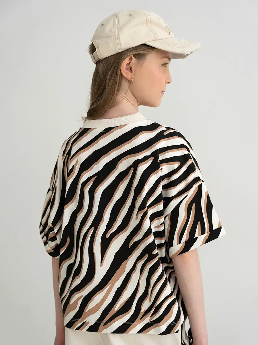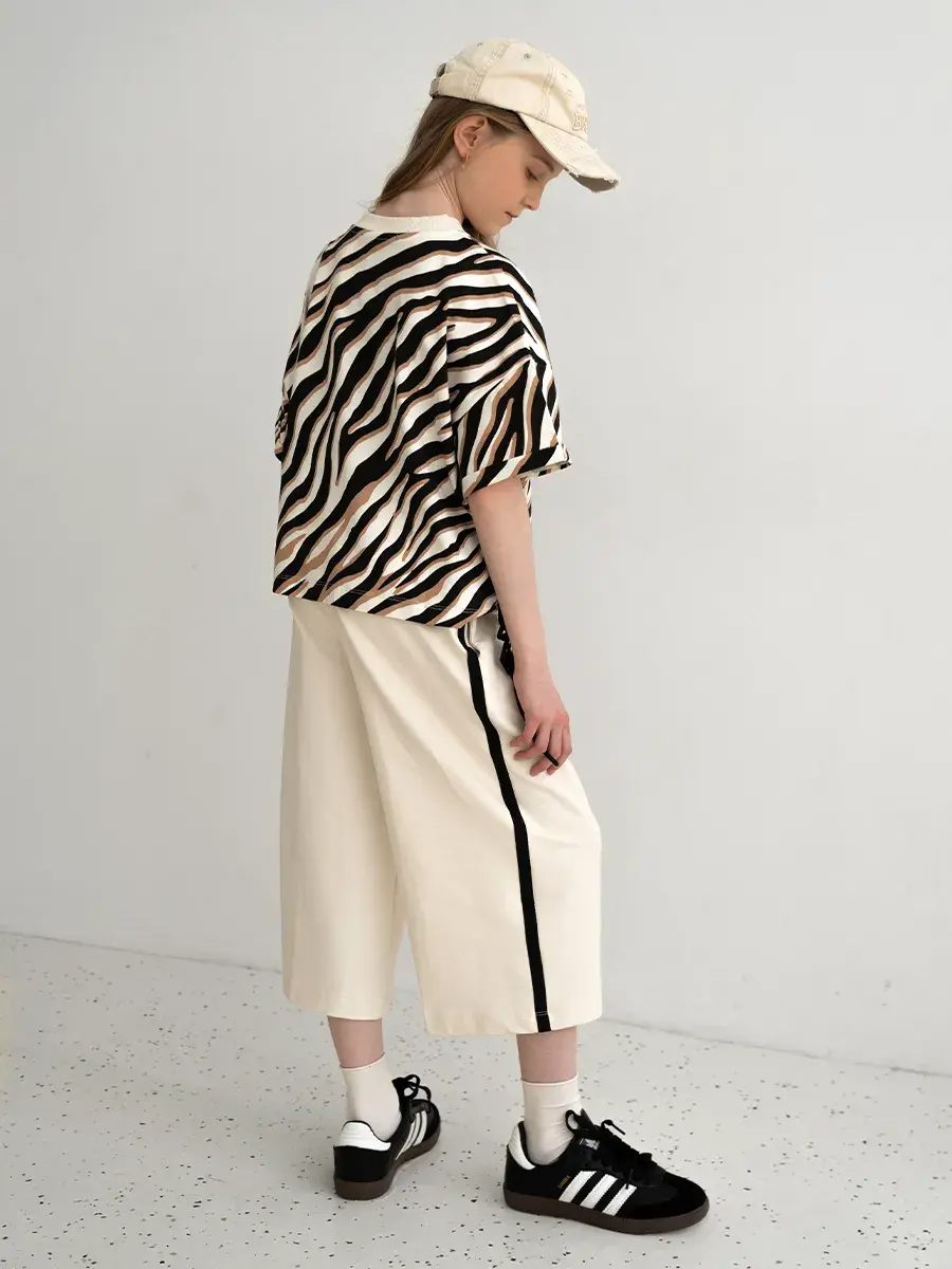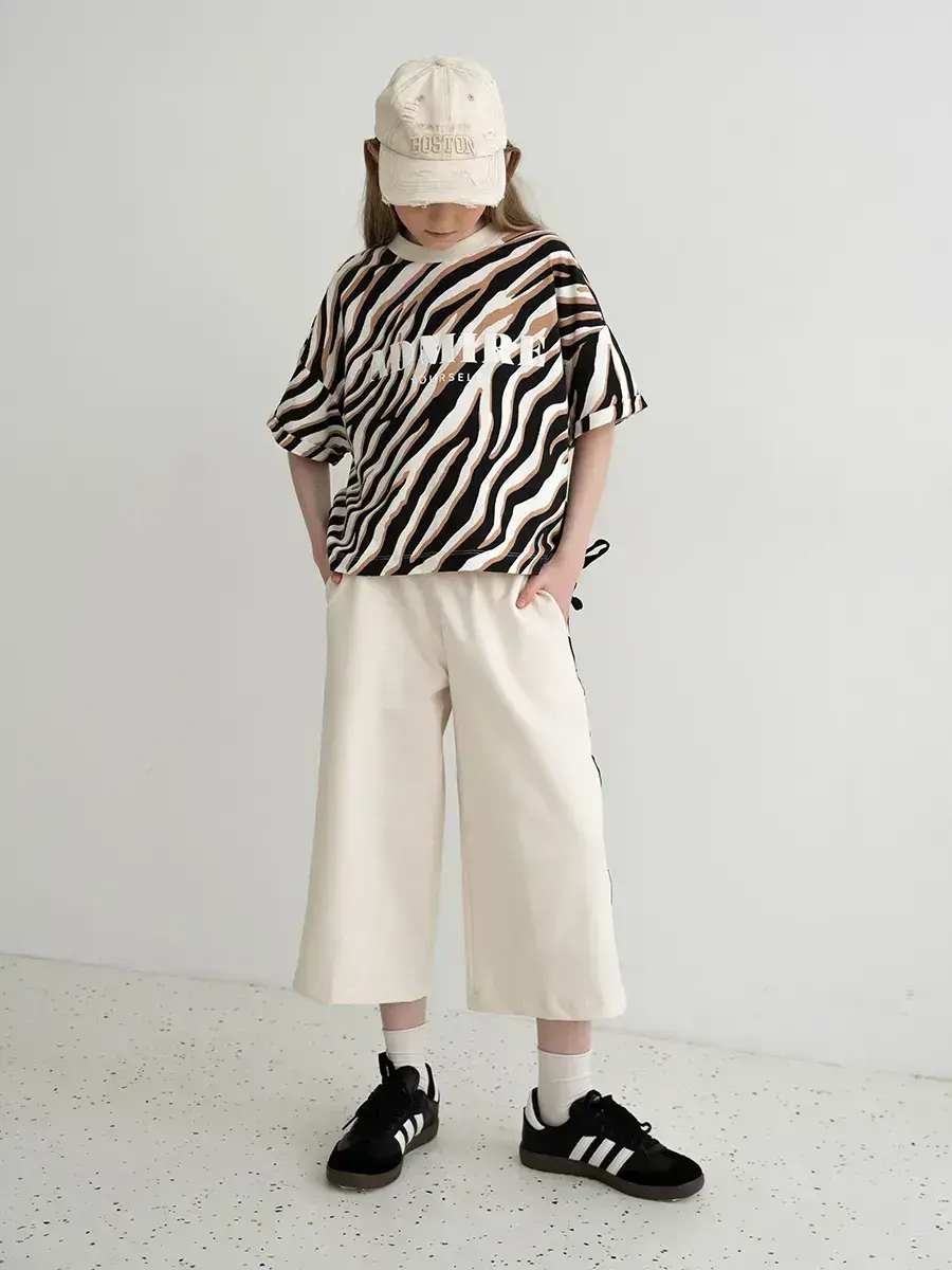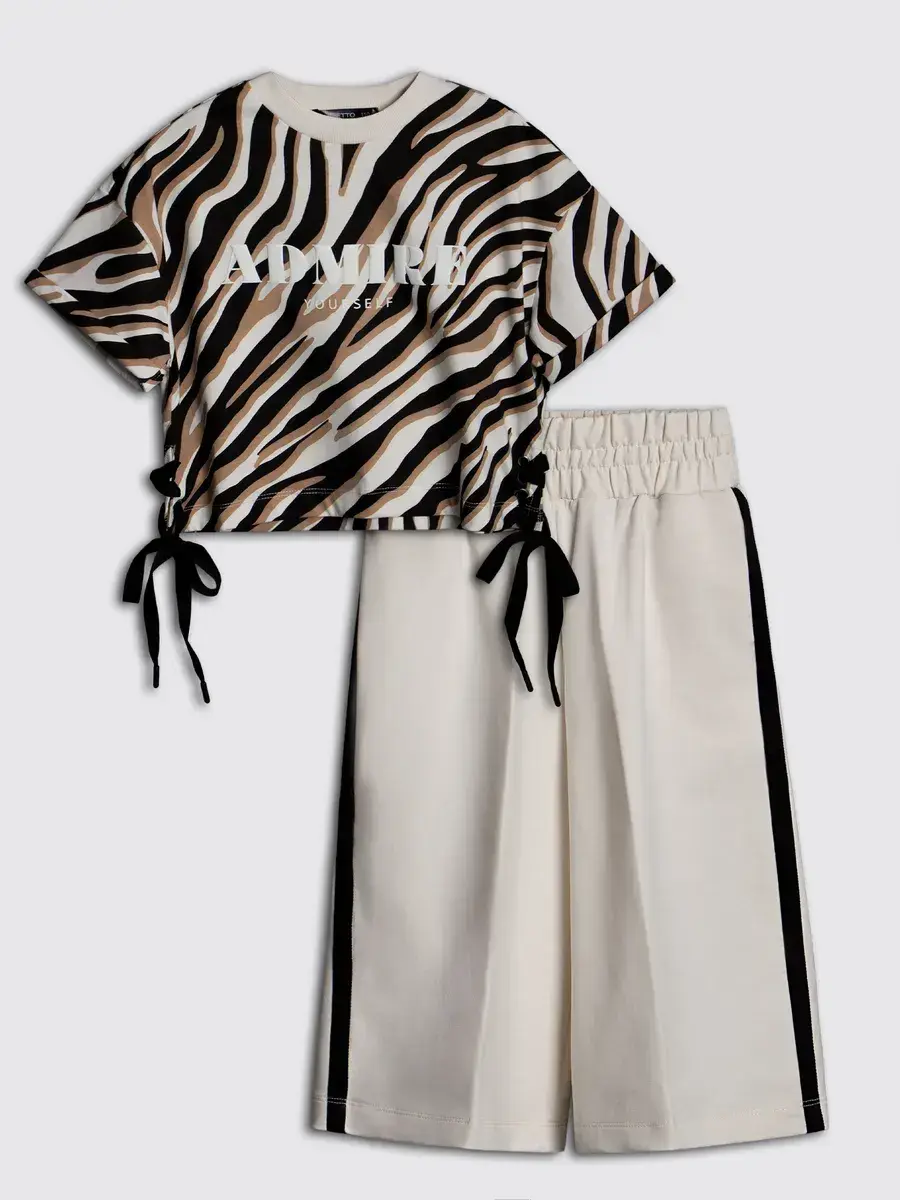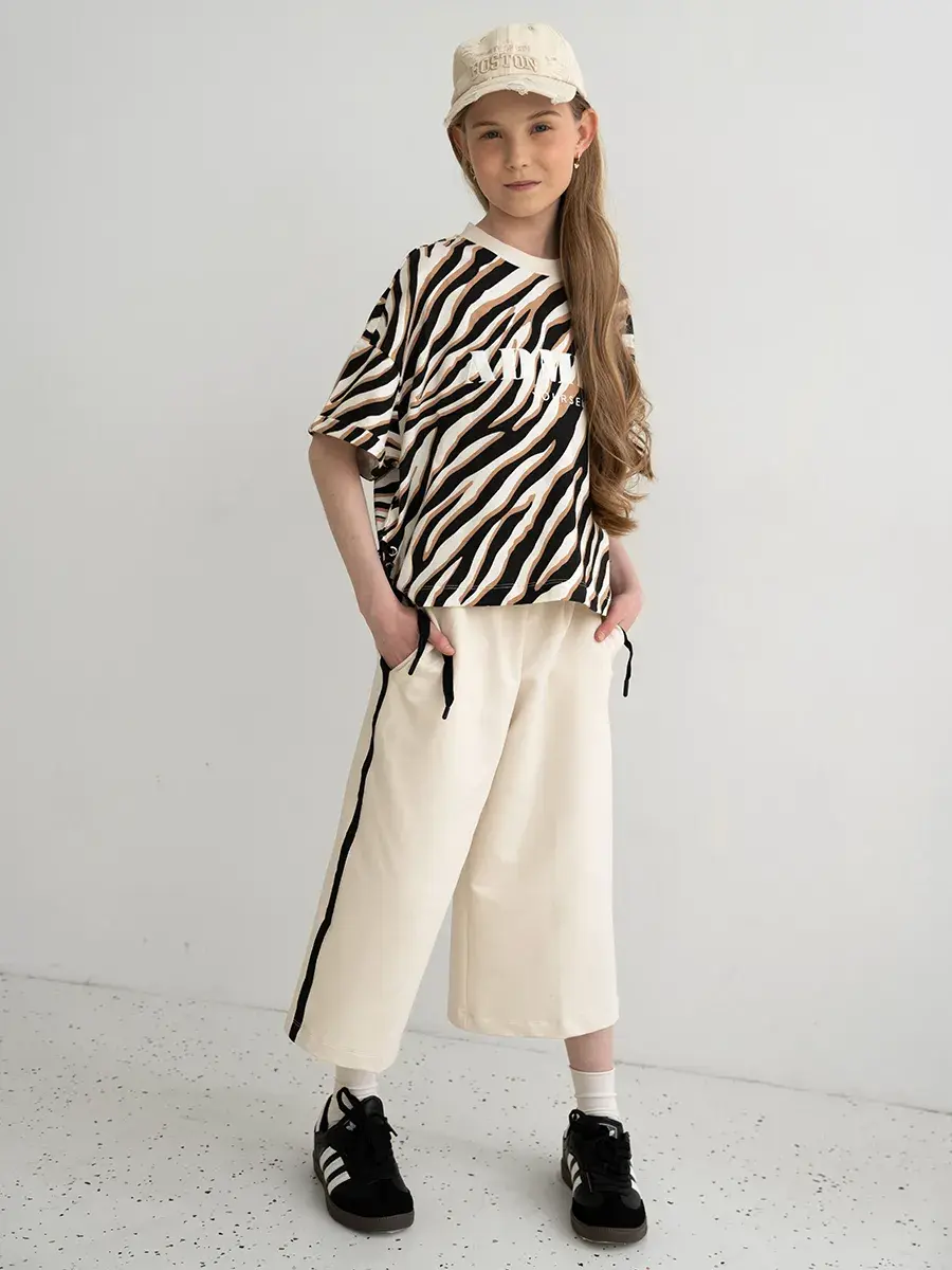 Футболка в спортивном костюме для девочки выполнена из мягкого и дышащего материала, который обеспечивает максимальный комфорт в течение всего дня. Кюлоты свободного кроя позволяют вашей девочке свободно двигаться, что делает этот костюм отличным выбором для активных игр и веселых приключений. Принт зебра добавляет оригинальности и делает костюм настоящим модным акцентом в детском гардеробе.