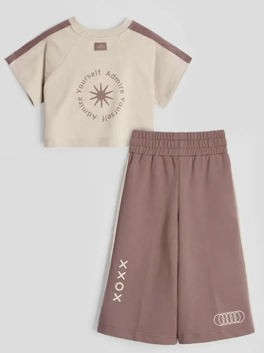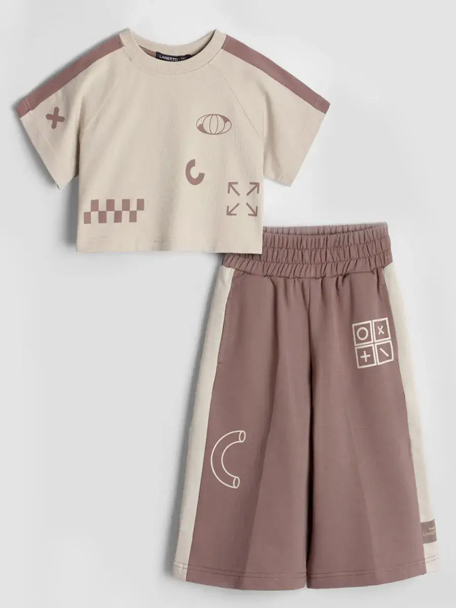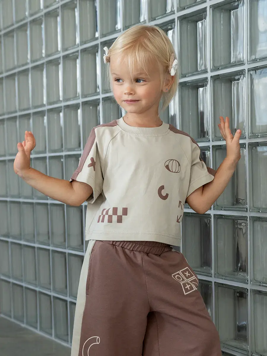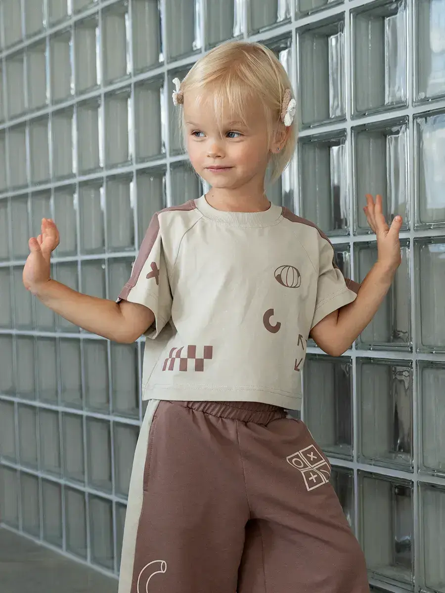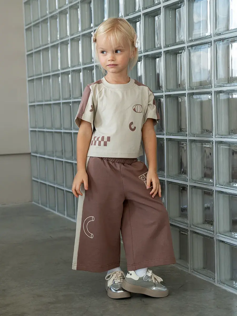 Бежевый костюм штаны и футболка для девочки - это стильный и комфортный комплект, который станет отличным выбором на каждый день. Укороченная футболка оверсайз и брюки кюлоты станут практичным вариантом для дома, отдыха, повседневной носки в школу, садик и занятий спортом. Детская одежда с модным принтом выполнена из качественного хлопкового материала, который обеспечивает удобство, не стесняет движений и позволяет коже дышать.