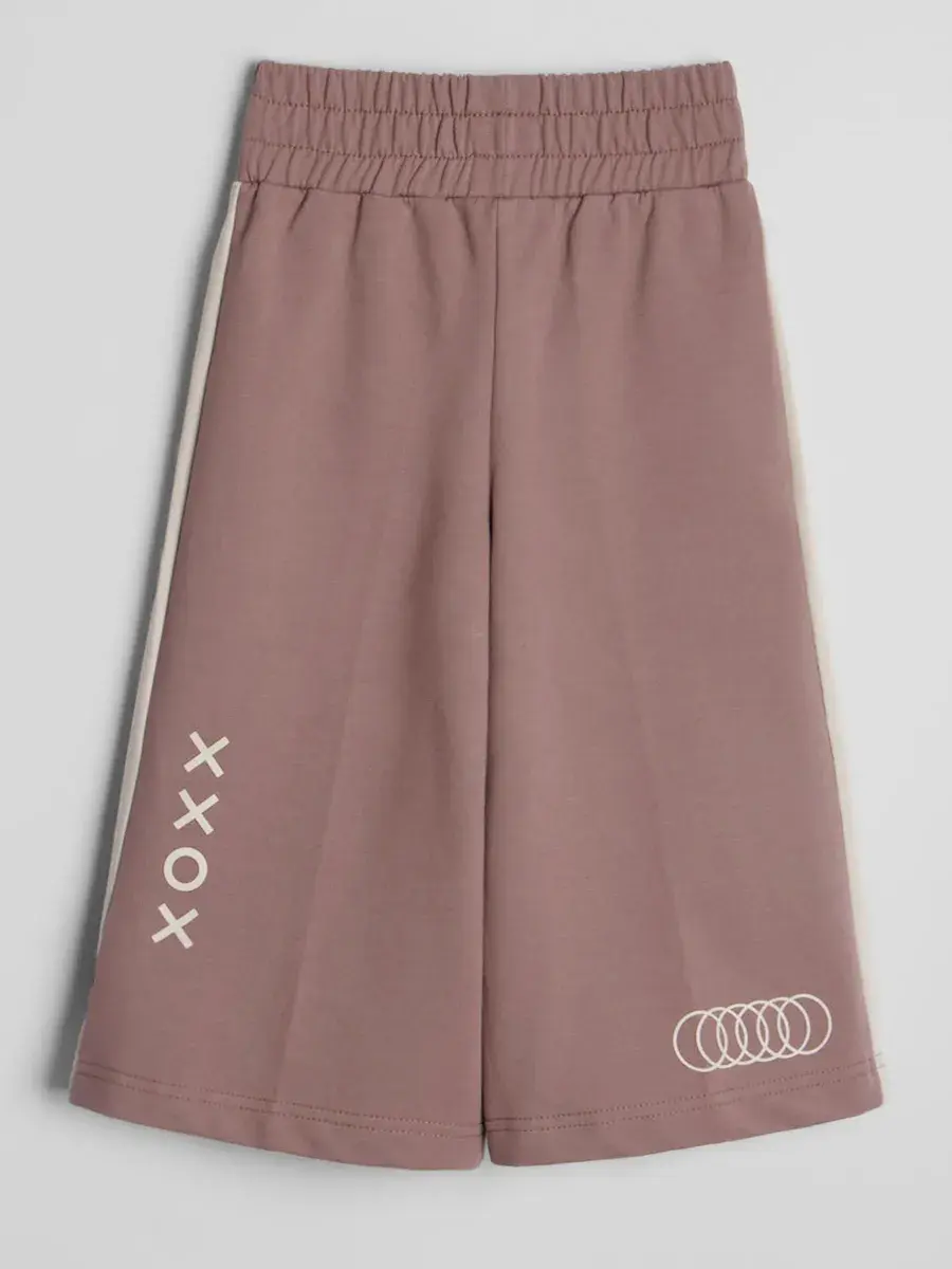 Верх представлен топом с коротким рукавом, что делает его удобным для носки в теплую погоду. Штаны кюлоты для девочки хорошо держат форму, подчеркивают фигуру и придают образу игривость.