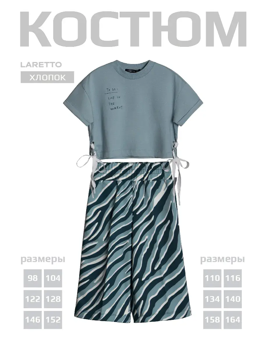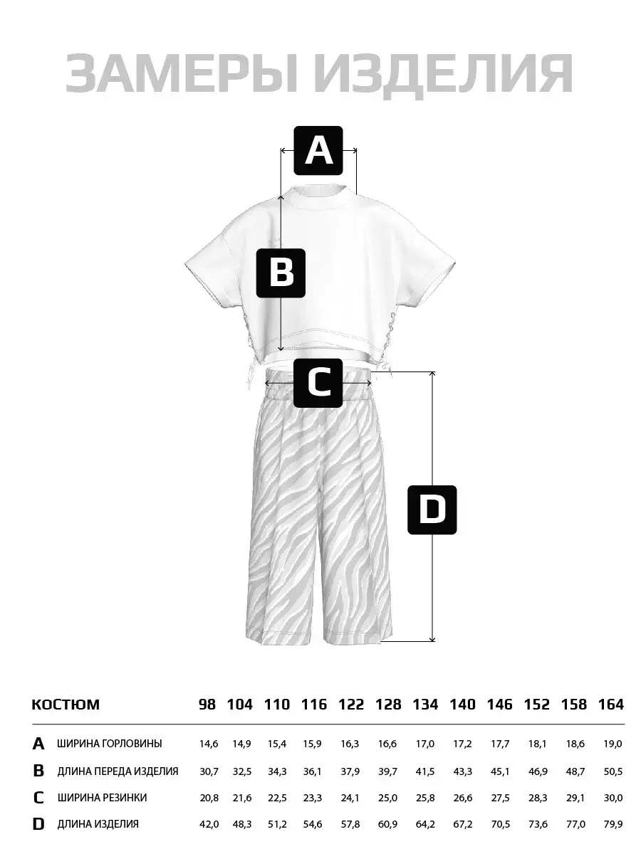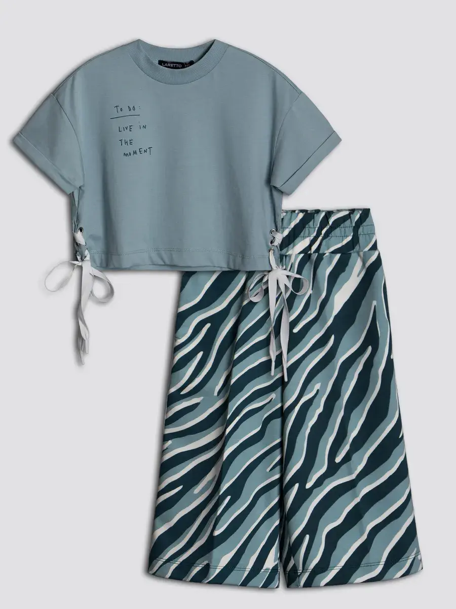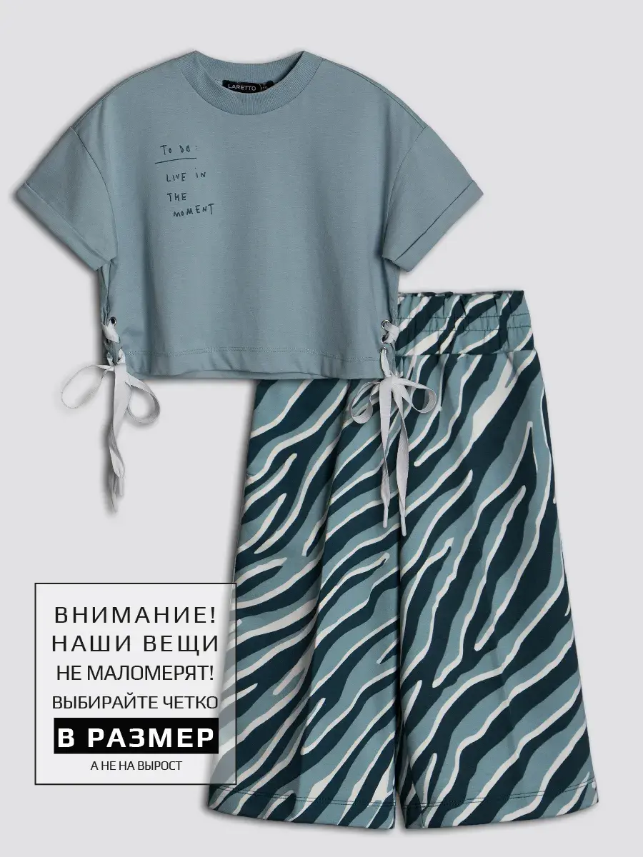 Погрузитесь в мир стиля и комфорта с нашим новым костюмом для девочки LARETTO! Этот восхитительный комплект, состоящий из футболки и модных кюлотов с принтом «зебра», станет незаменимым элементом гардероба вашей юной модницы.