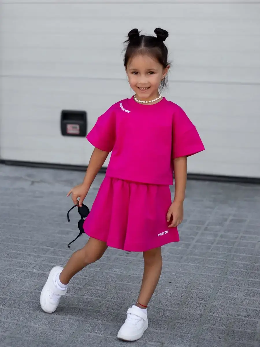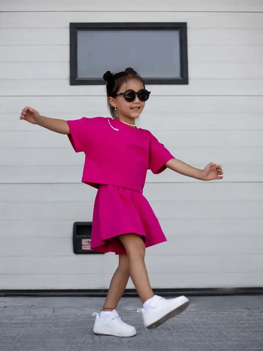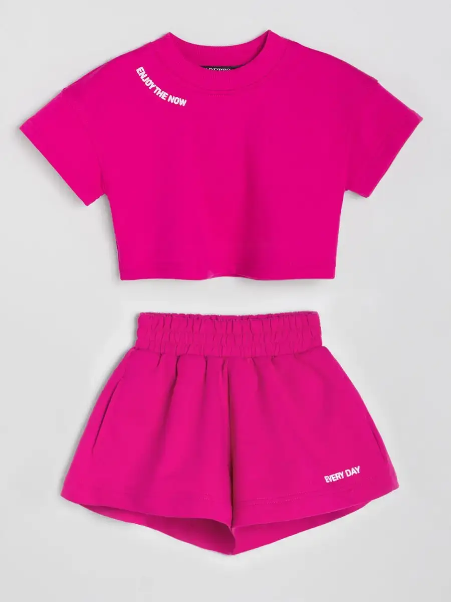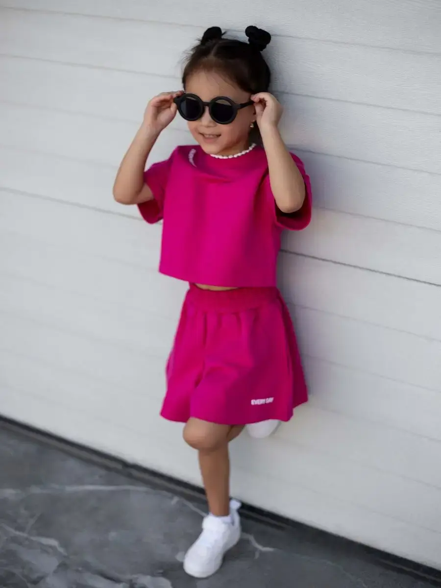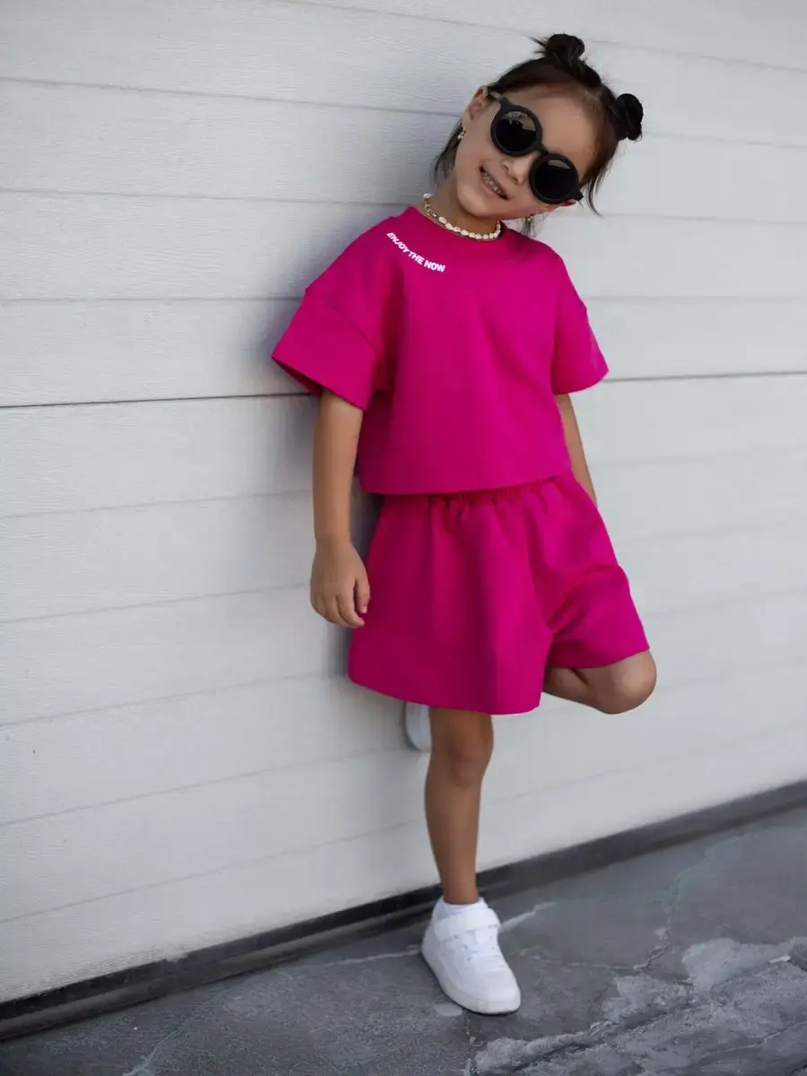 Костюм для девочек включает в себя модную футболку и комфортные шорты, которые подойдут как для активного отдыха, так и для повседневной носки. Идеально подходит для маленьких модниц и юных спортсменок.