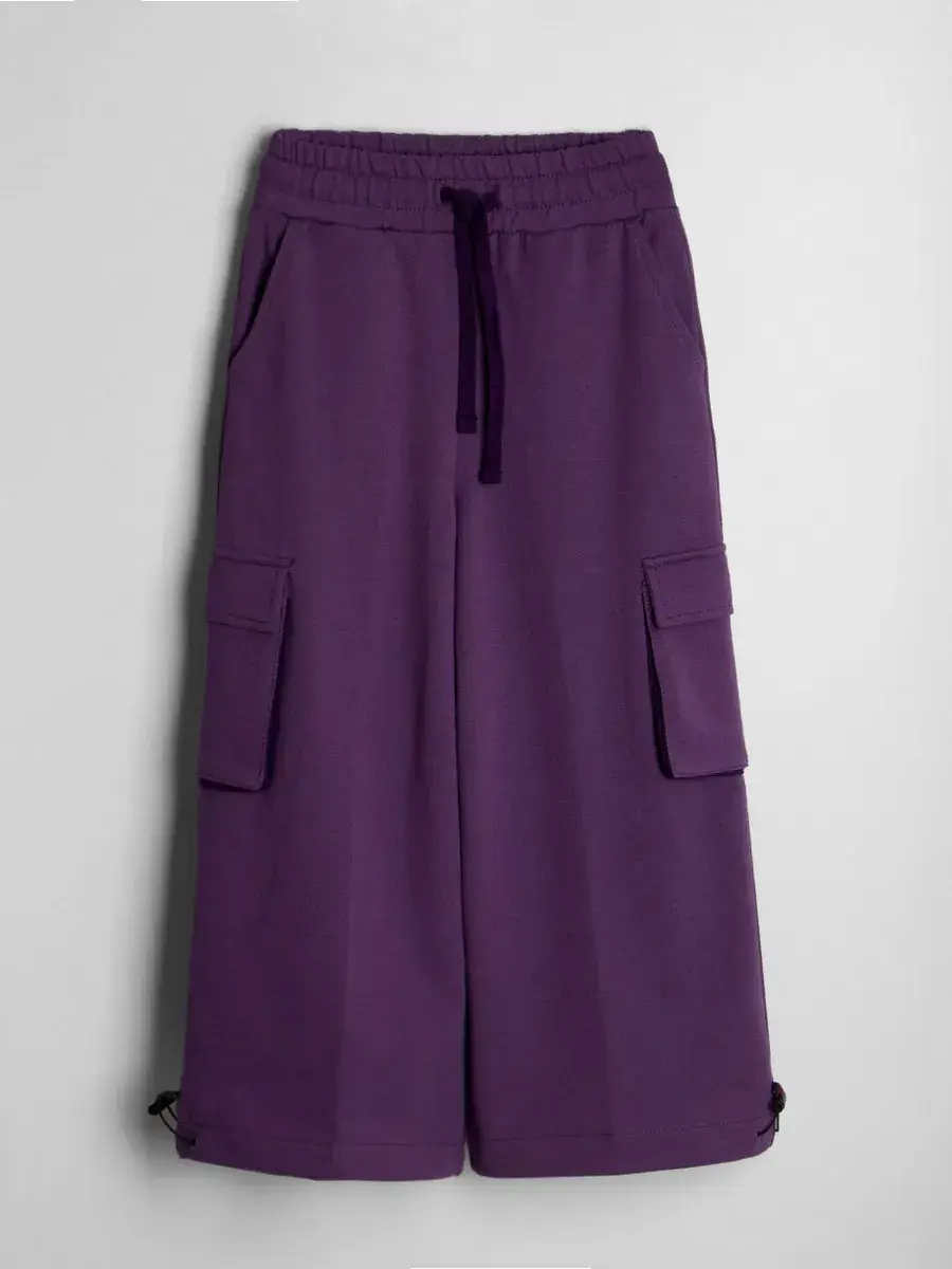 Верх представлен топом с коротким рукавом, что делает его удобным для носки в теплую погоду. Штаны кюлоты для девочки хорошо держат форму, подчеркивают фигуру и придают образу игривость.