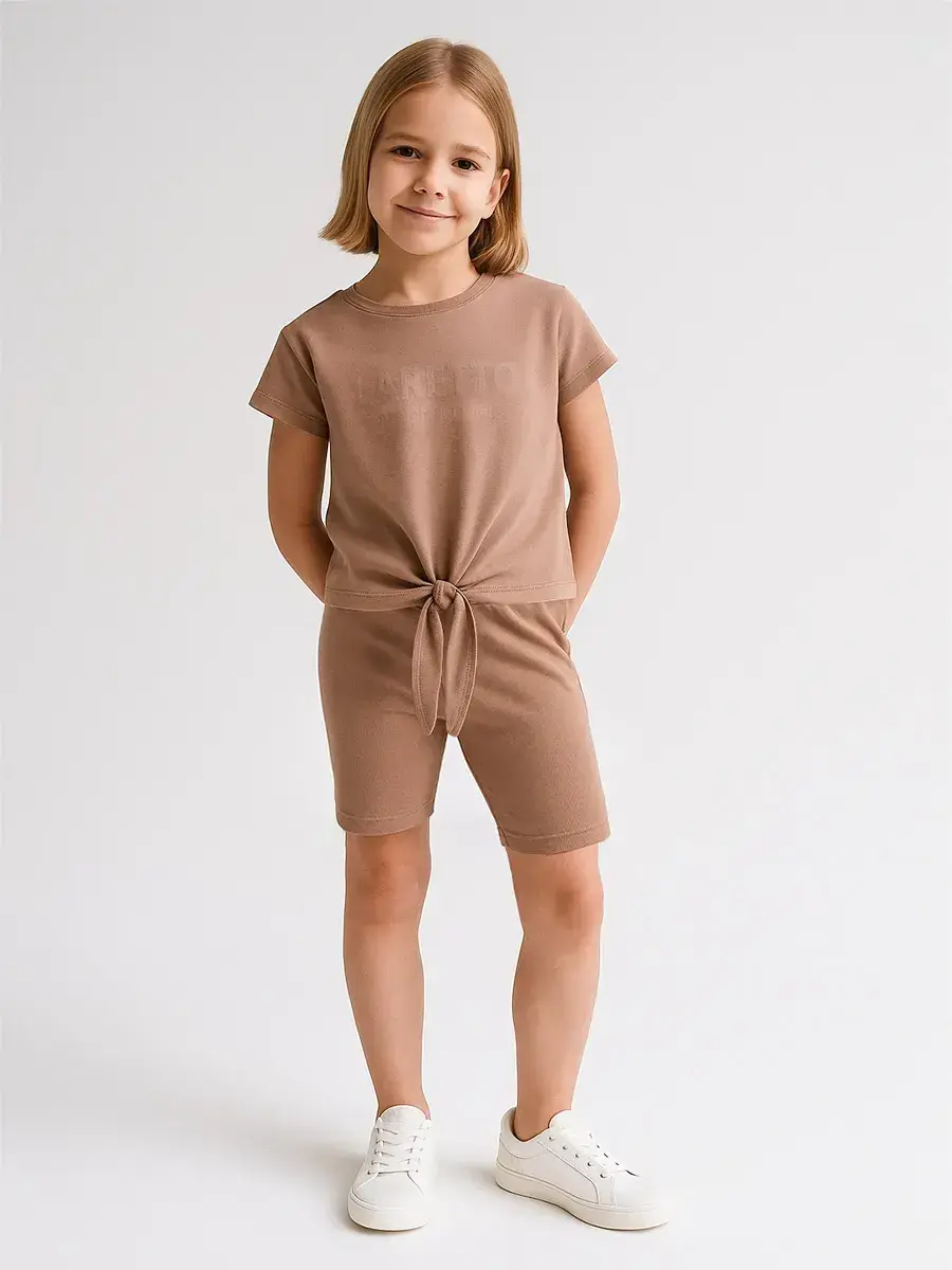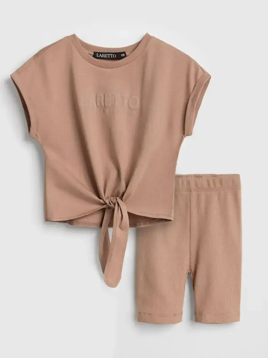 Костюм для девочки летний - это идеальный вариант для дома и отдыха. Футболка с завязками и велосипедки станут самым практичным повседневным вариантом. Шорты детские в рубчик выполнены из Премиального трикотажа кашкорсе, что обеспечивает приятный комфорт для кожи ребенка. Они отлично подойдут для занятий физкультурой, гимнастикой, танцами или бегом. Благодаря широкой палитре цветов комплект легко впишется в гардероб каждой модницы. Топ с завязками и велосипедки выглядят стильно не только во время занятий спортом, но и на прогулке. Идеальный крой и качественное исполнение в сочетании с большим размерным рядом позволит подобрать модель не только для малышей, но и для подростков. Спортивный костюм для девочек не сковывает движений и подойдет для дома и отдыха. Спортивные шортики создают красивый силуэт, подчеркивают талию, а широкая резинка не оставляет следов на коже. Укороченная футболка с минималистичным принтом - хит этого сезона! Детский трикотажный костюм из нашей коллекции - это качественная детская вещь, которая прослужит не один сезон. Он станет чудесным подарком для дочери, племянницы, сестры, внучки, подруги на любой праздник и без повода. Порадуйте своего ребенка качественной одеждой от бренда LARETTO! Приятных Вам покупок!