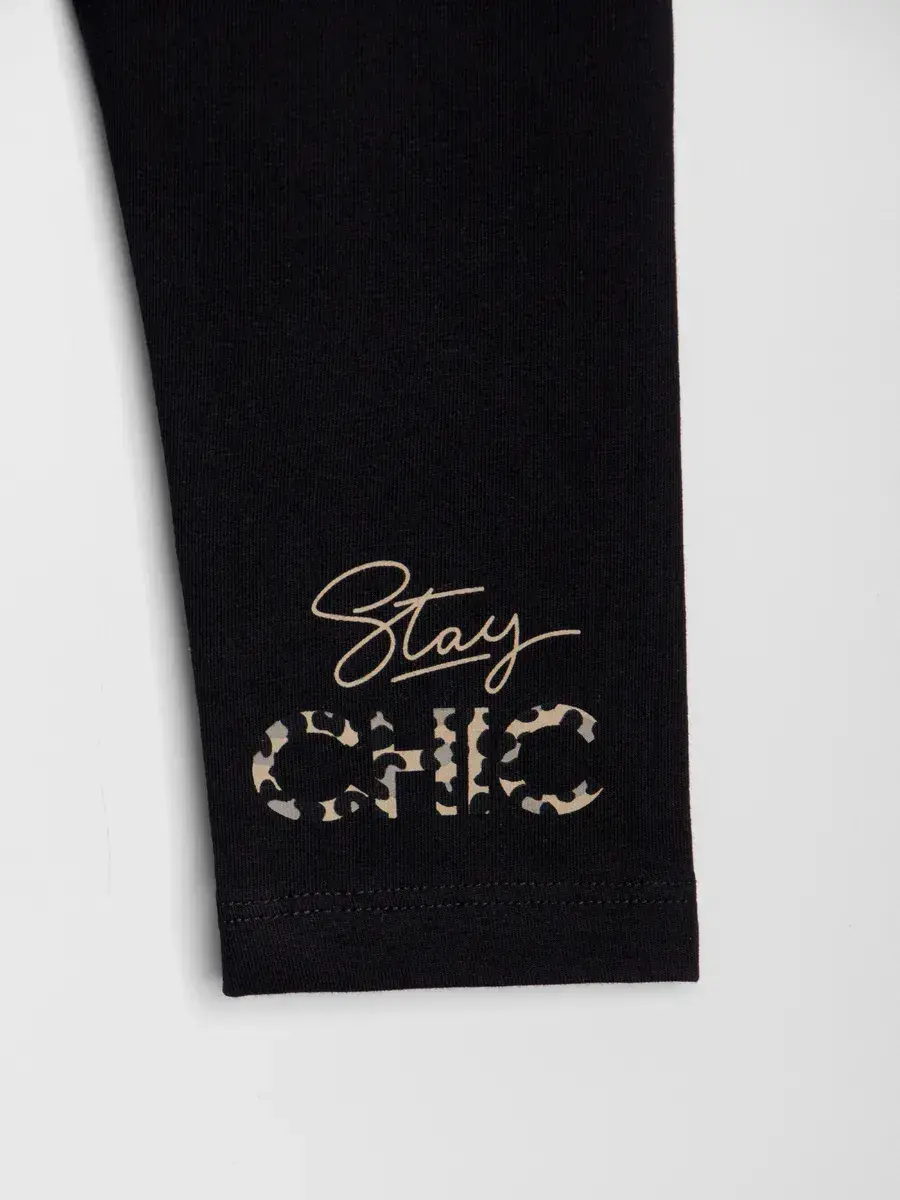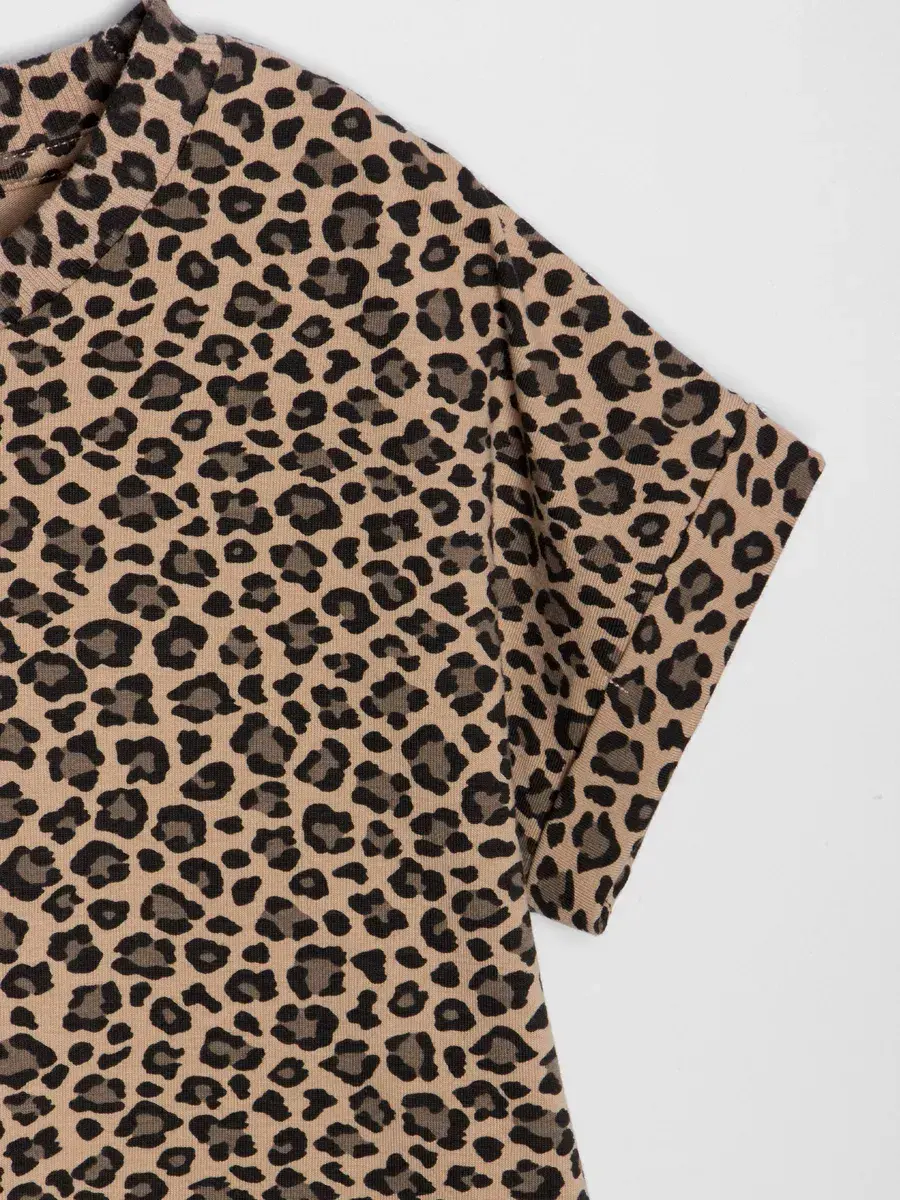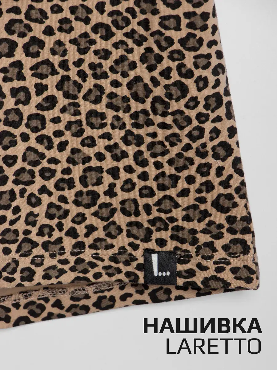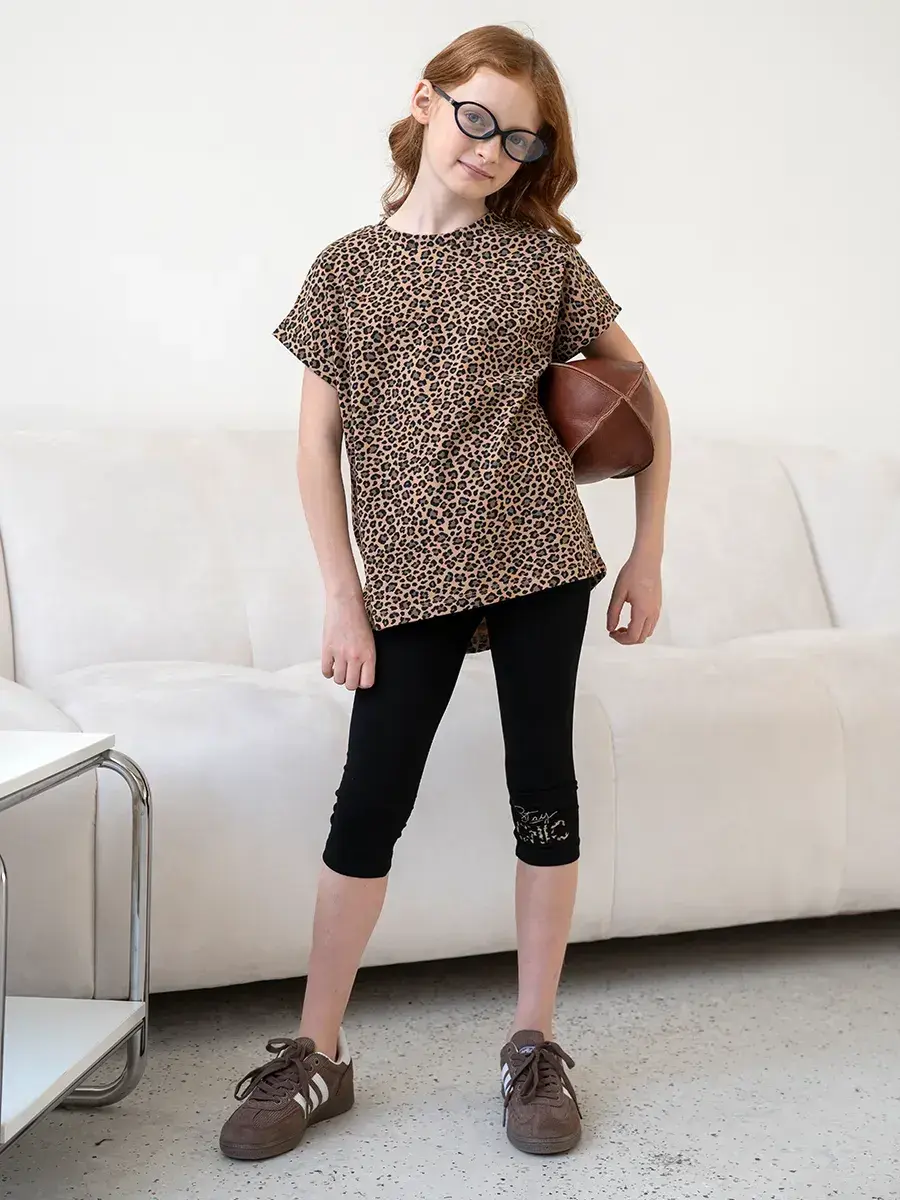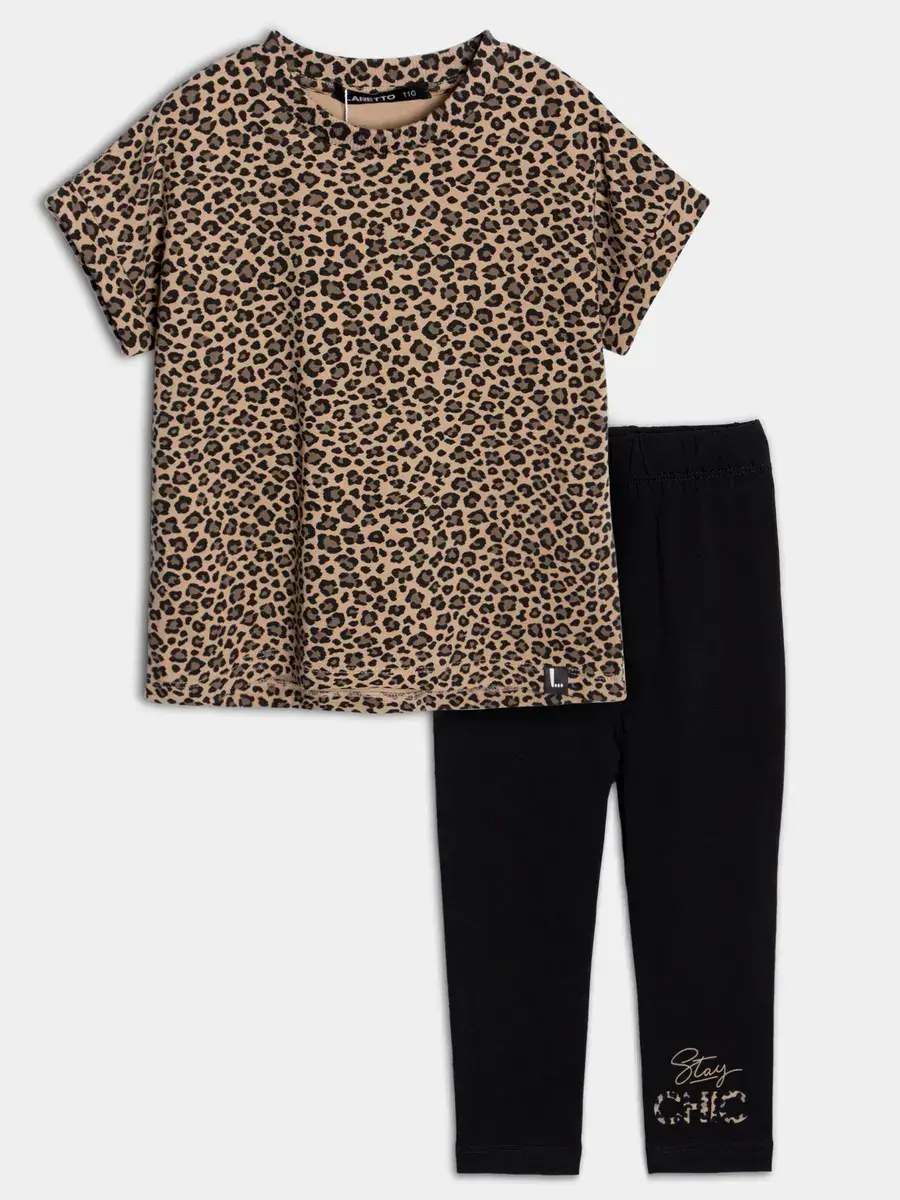 Комплект включает футболку с ярким леопардовым принтом и удобные бриджи.