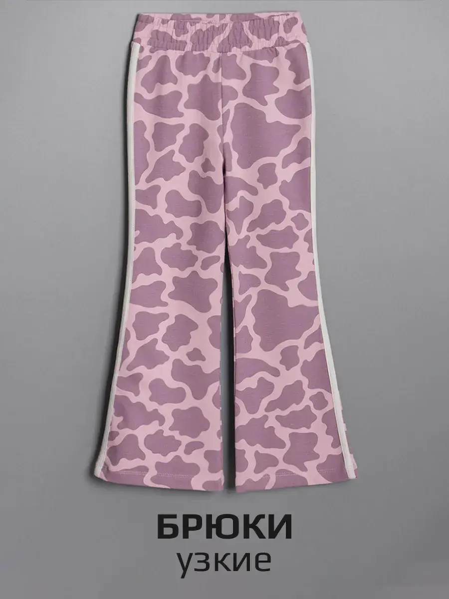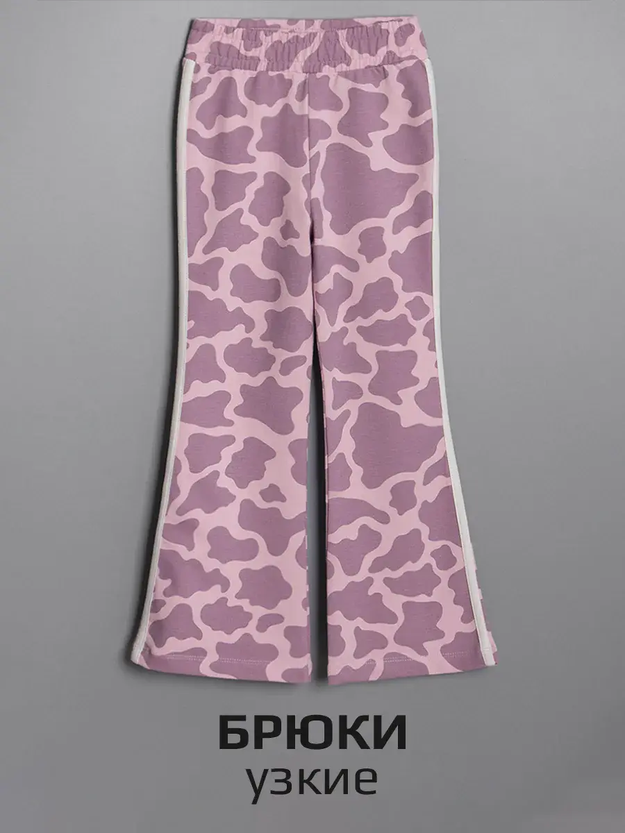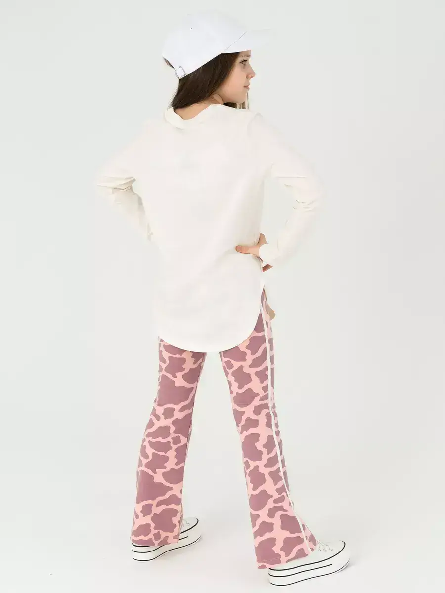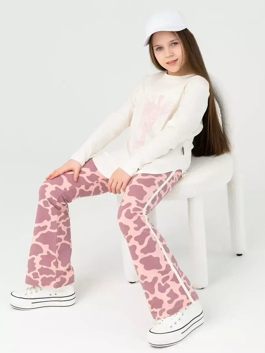 Брюки клеш для девочек - выполнены также из трикотажной ткани на основе натурального хлопка. Широкий пояс на резинке не сдавливает животик ребенка и обеспечивает надежную фиксацию на талии. Расширенные от колена к низу брючины придают образу оригинальность и следуют последним модным тенденциям.