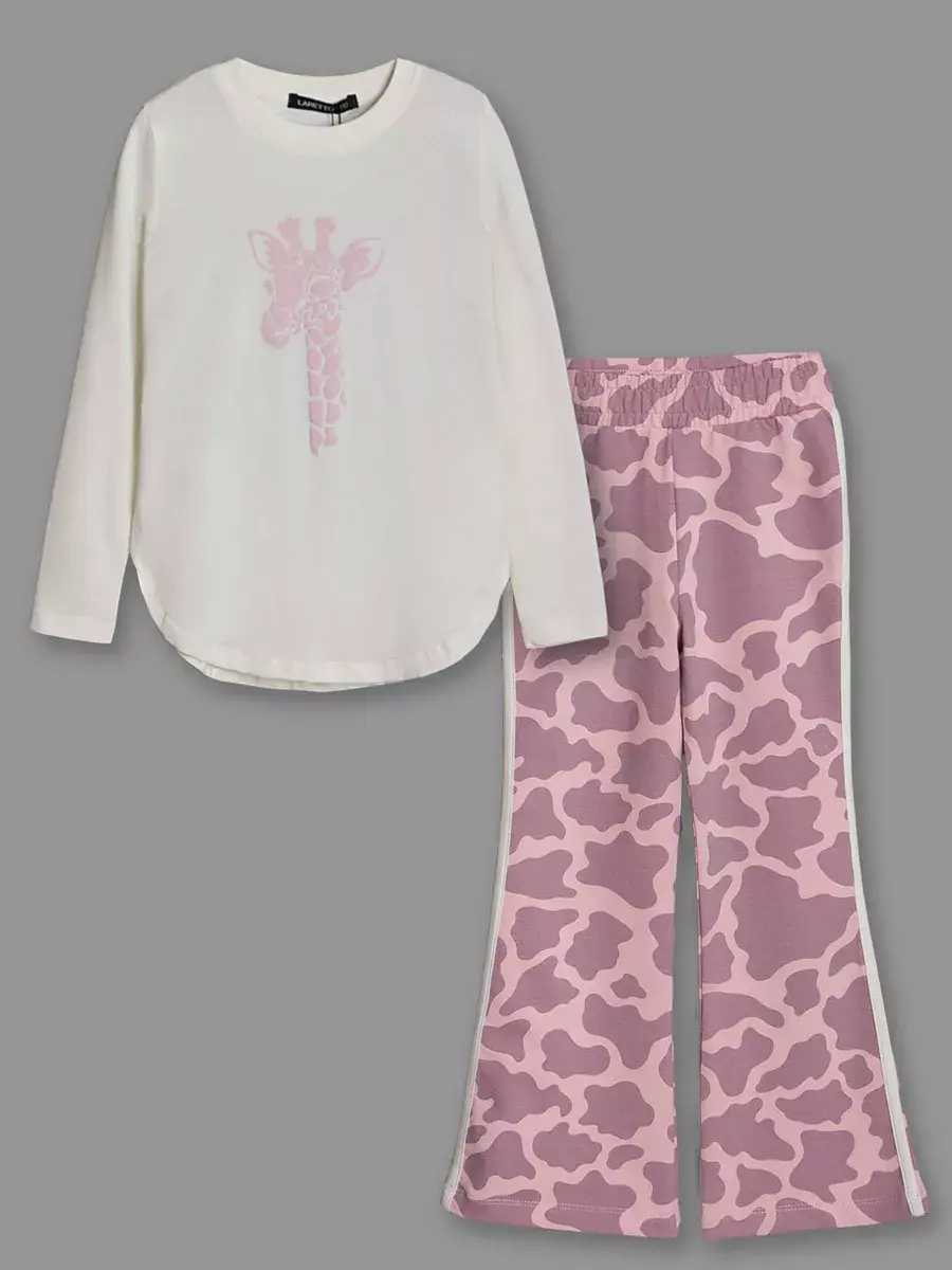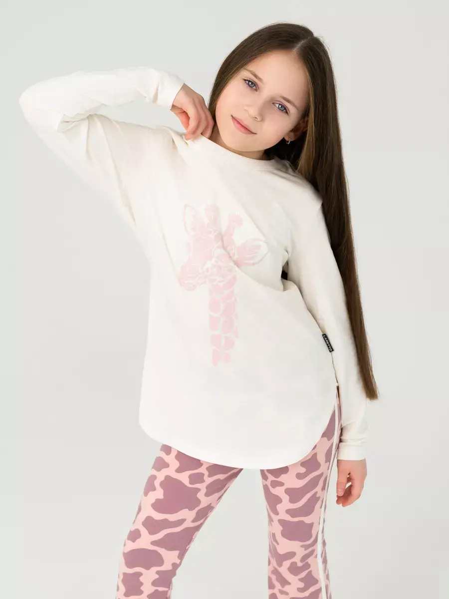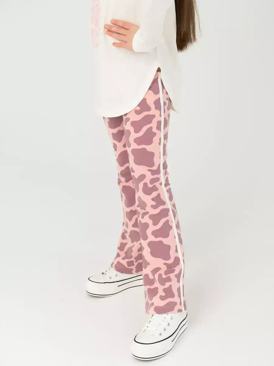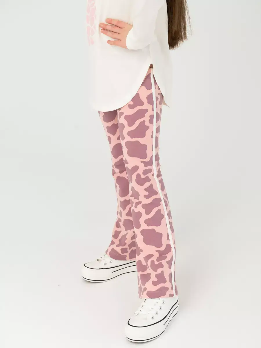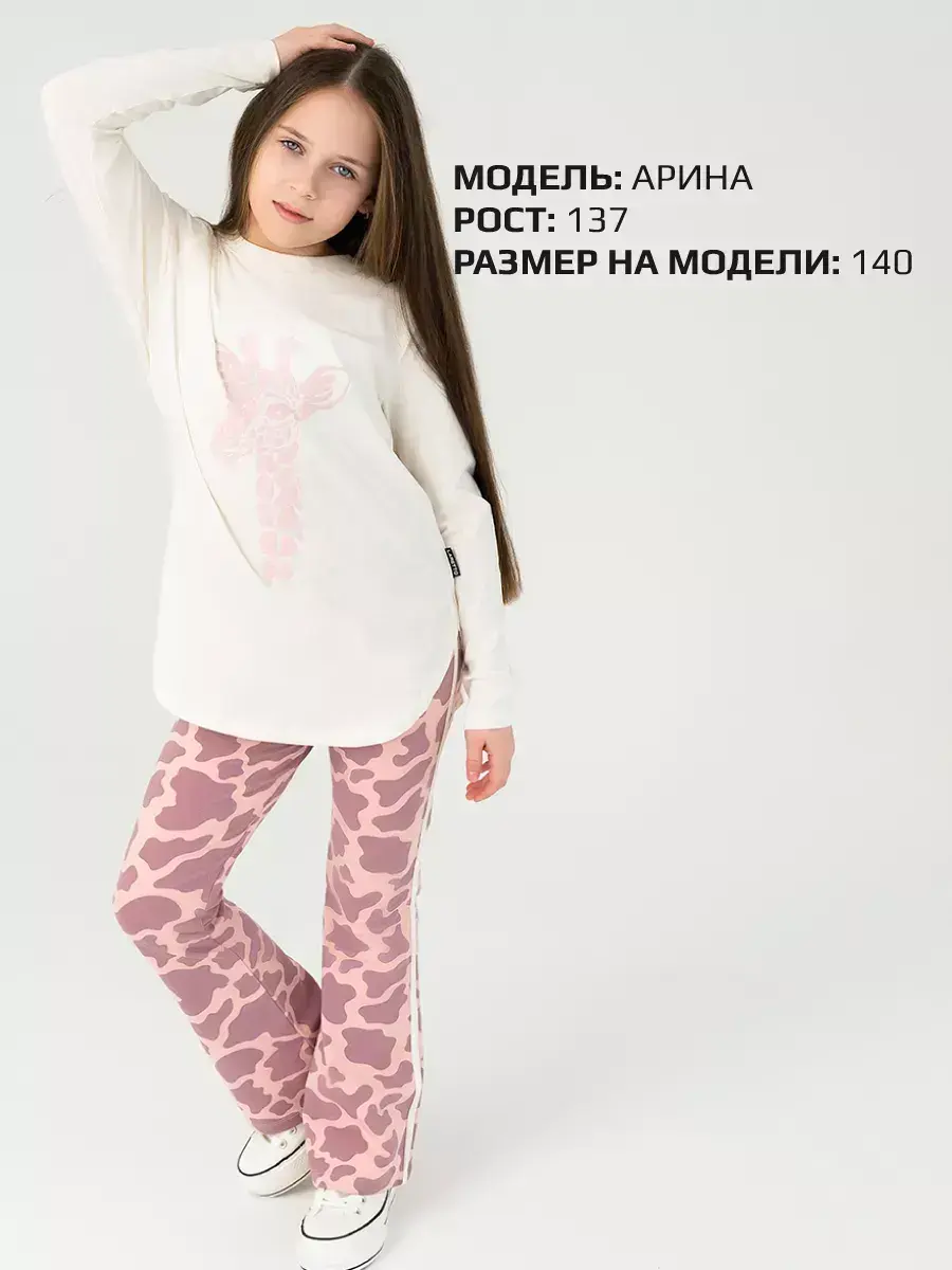 Брюки клеш для девочек - выполнены также из трикотажной ткани на основе натурального хлопка. Широкий пояс на резинке не сдавливает животик ребенка и обеспечивает надежную фиксацию на талии. Расширенные от колена к низу брючины придают образу оригинальность и следуют последним модным тенденциям.