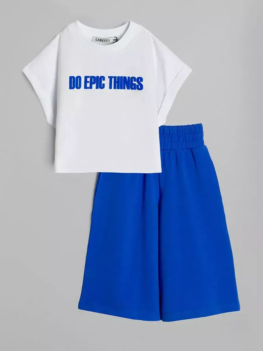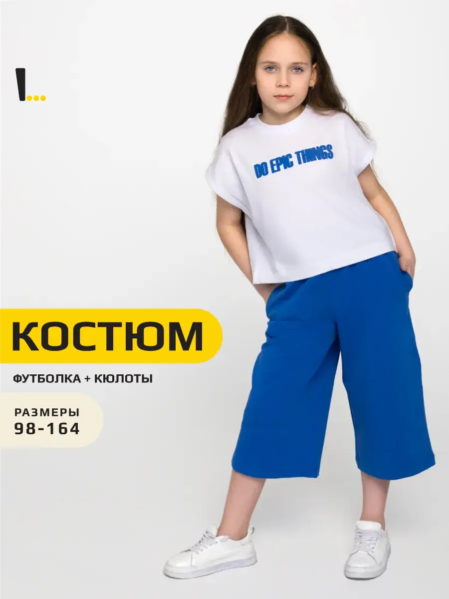 Костюм для девочки — отличный выбор для прогулок, активных игр и занятий спортом. Футболка выполнена из мягкого трикотажного материала, который дышит и приятно ощущается на коже, а кюлоты обладают отличной посадкой и не сковывают движения.