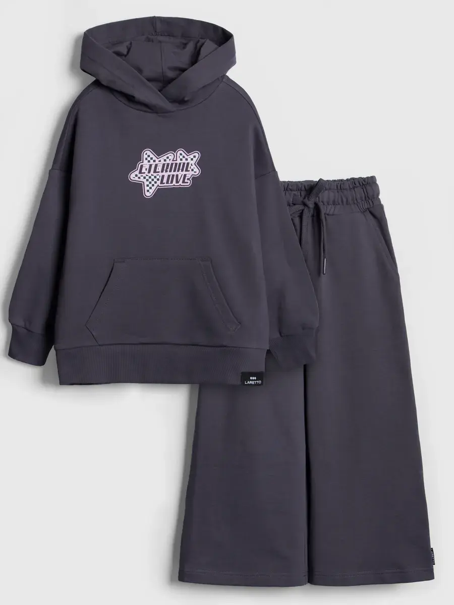 Костюм для девочки состоит из стильной толстовки и модных брюк. Этот комплект для двочки идеально сочетает в себе комфорт и актуальные тренды, что делает его отличным выбором для активных дней, прогулок и отдыха.