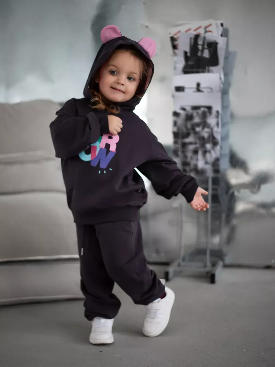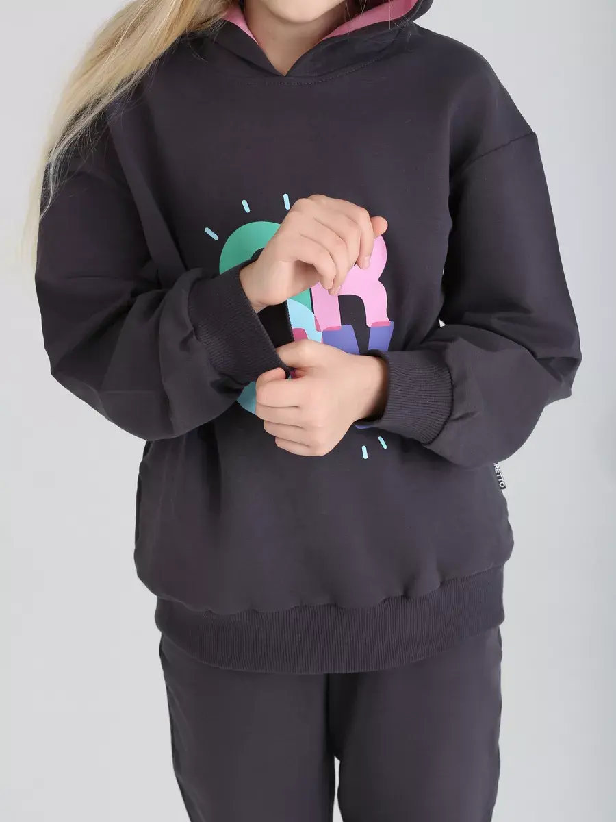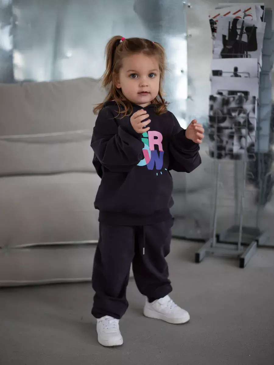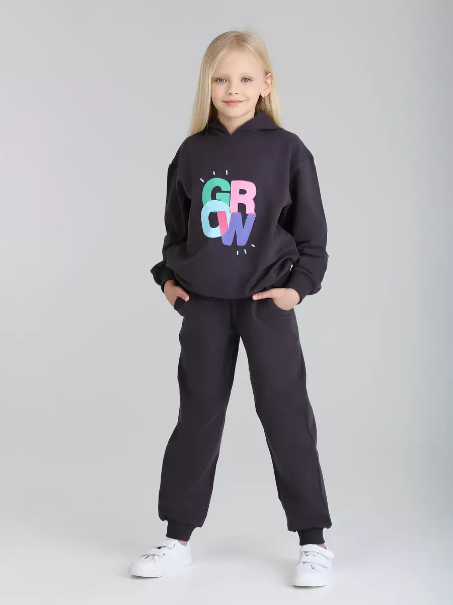 Стильный и современный спортивный костюм для девочек. Состоит из уютного худи и модных брюк джоггеров. Этот темно-серый комплект детский идеально сочетает в себе комфорт и актуальные тренды, что делает его отличным выбором для активных дней, прогулок и отдыха.