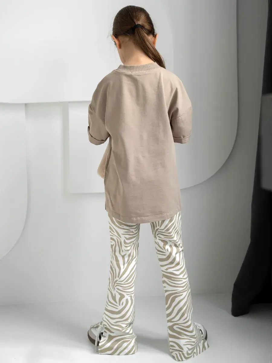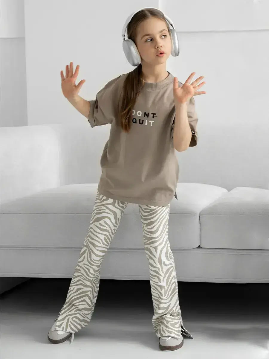 Спортивный костюм для девочек, который сочетает в себе стиль, комфорт и качество. Этот трикотажный детский костюм состоит из удобной футболки оверсайз и модных брюк клеш, которые подарят вашей малышке свободу движений в теплых зимних дней.