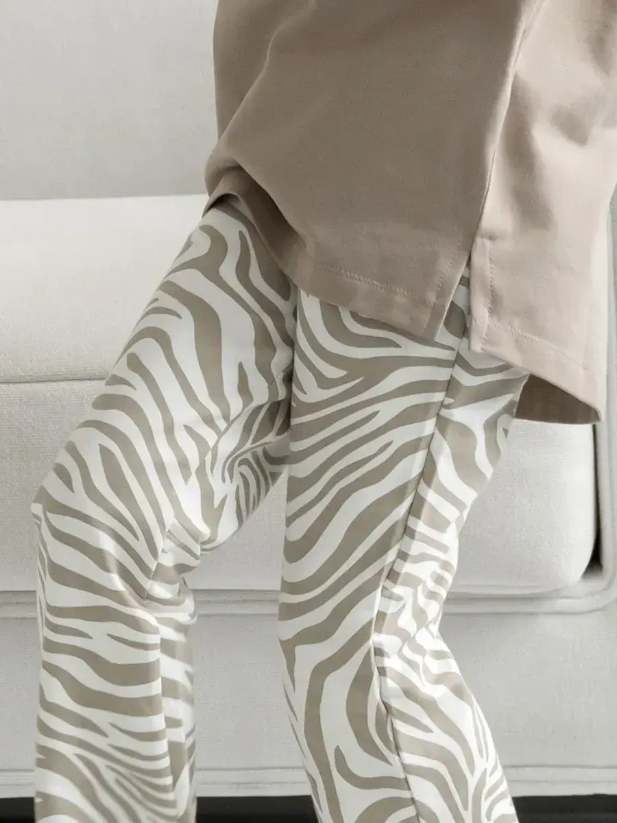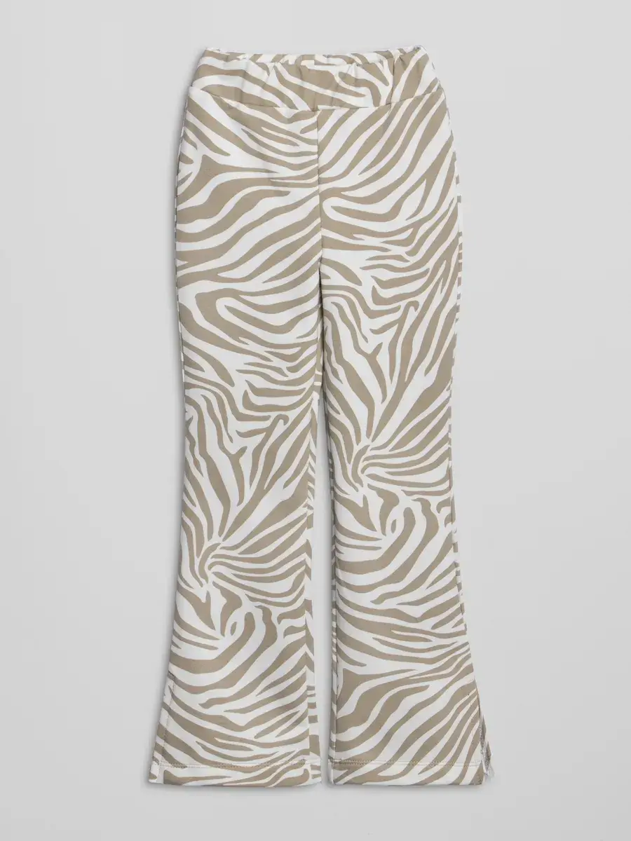 Брюки клеш для девочек - выполнены также из трикотажной ткани на основе натурального хлопка. Широкий пояс на резинке не сдавливает животик ребенка и обеспечивает надежную фиксацию на талии. Расширенные от колена к низу брючины придают образу оригинальность и следуют последним модным тенденциям.