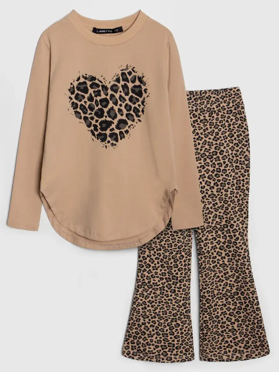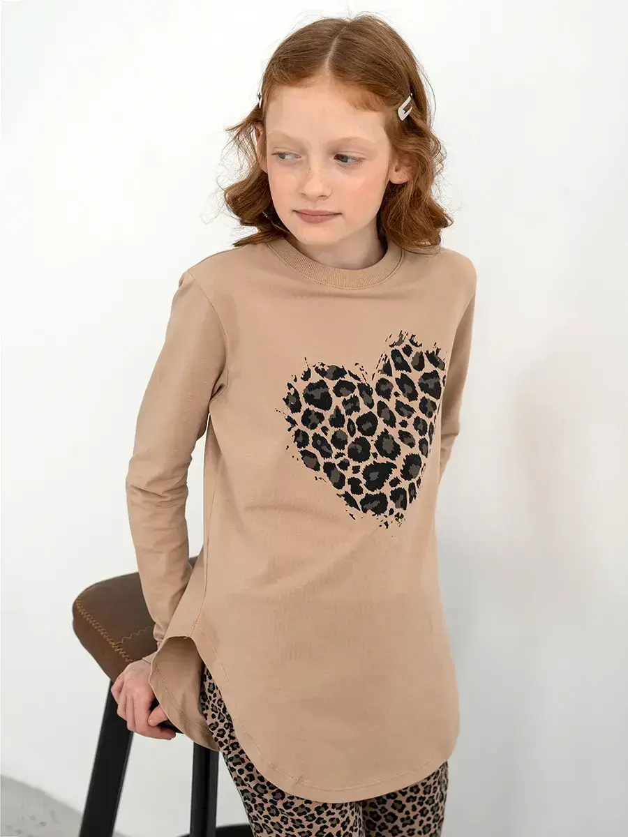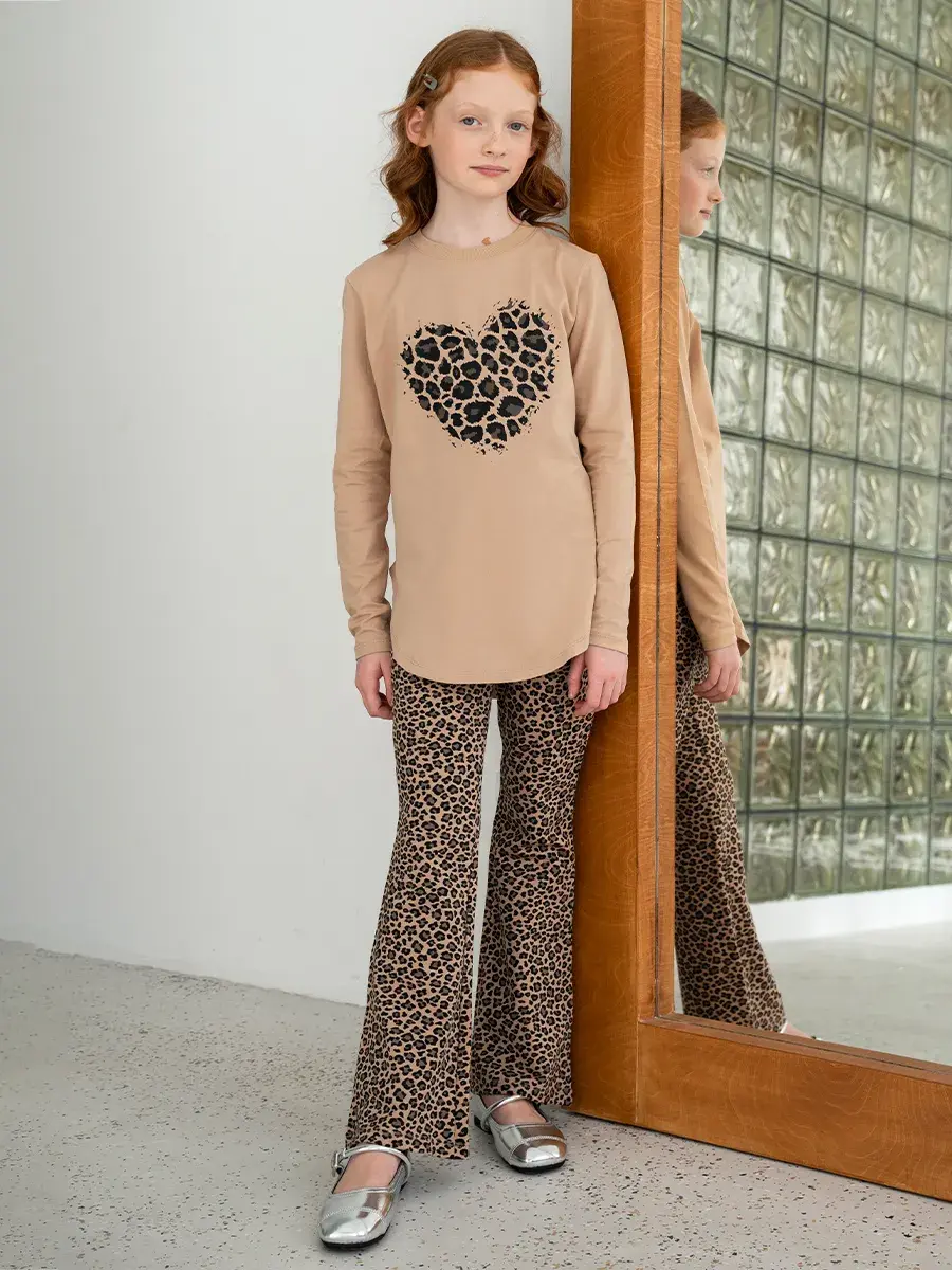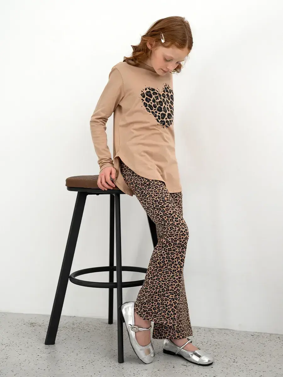 Костюм для девочек, который сочетает в себе стиль, комфорт и качество. Этот трикотажный детский костюм состоит из удобной бежевой туники и модных леопардовых брюк, которые подарят вашей малышке свободу движений в прохладные дни.
