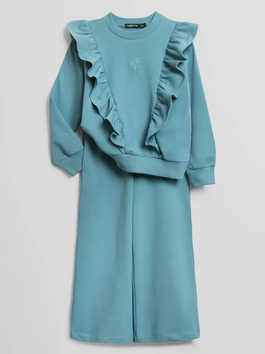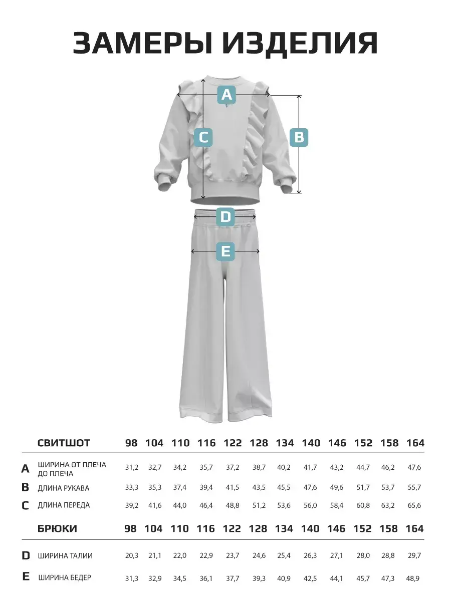 Очаровательный костюм для девочки с брюками палаццо в садик - это волшебный ансамбль, который сочетает в себе элегантность и комфорт. Удобный летний трикотажный костюм с рюшами для девочек от бренда LARETTO идеален для особых случаев или повседневных приключений!