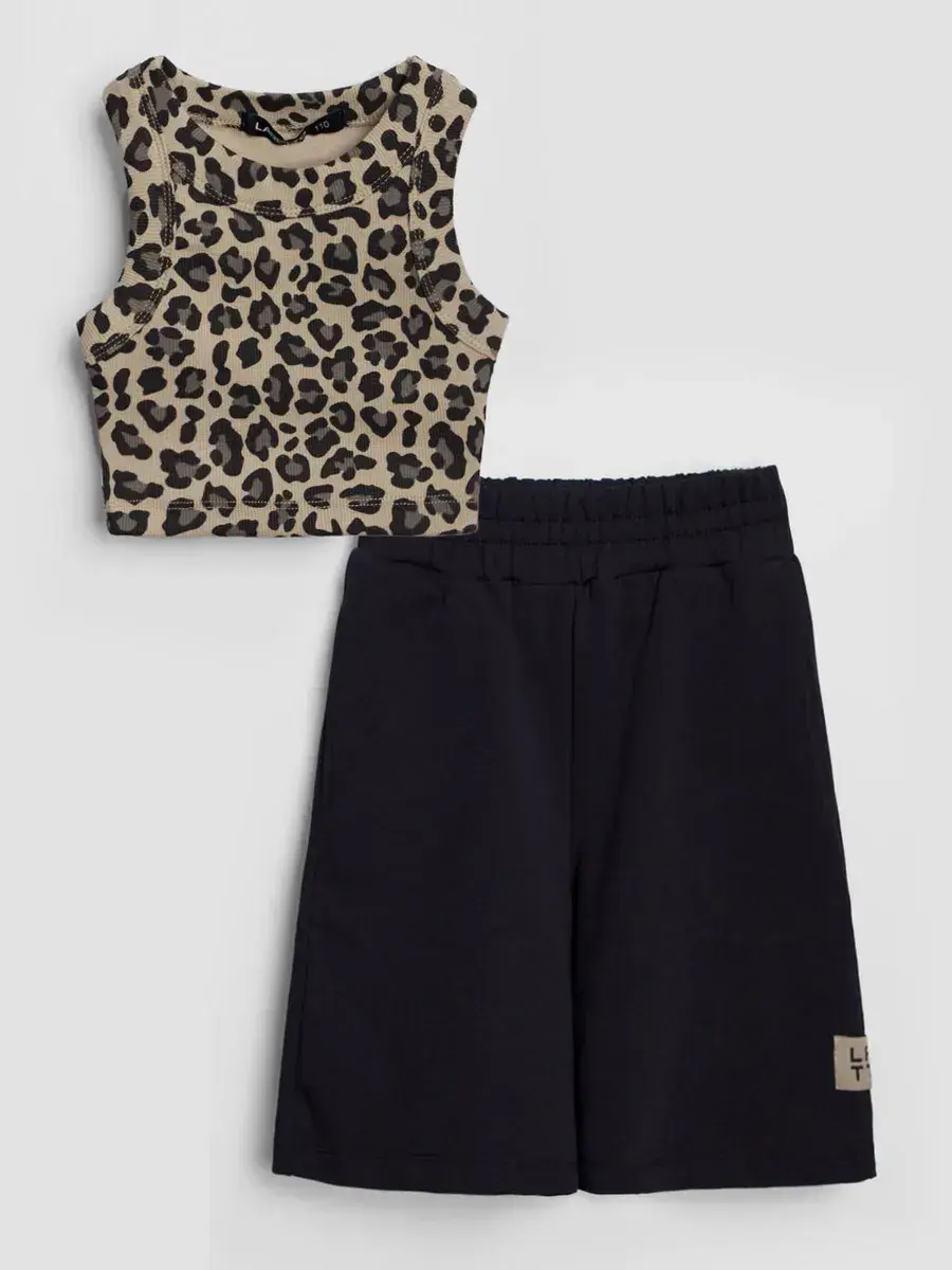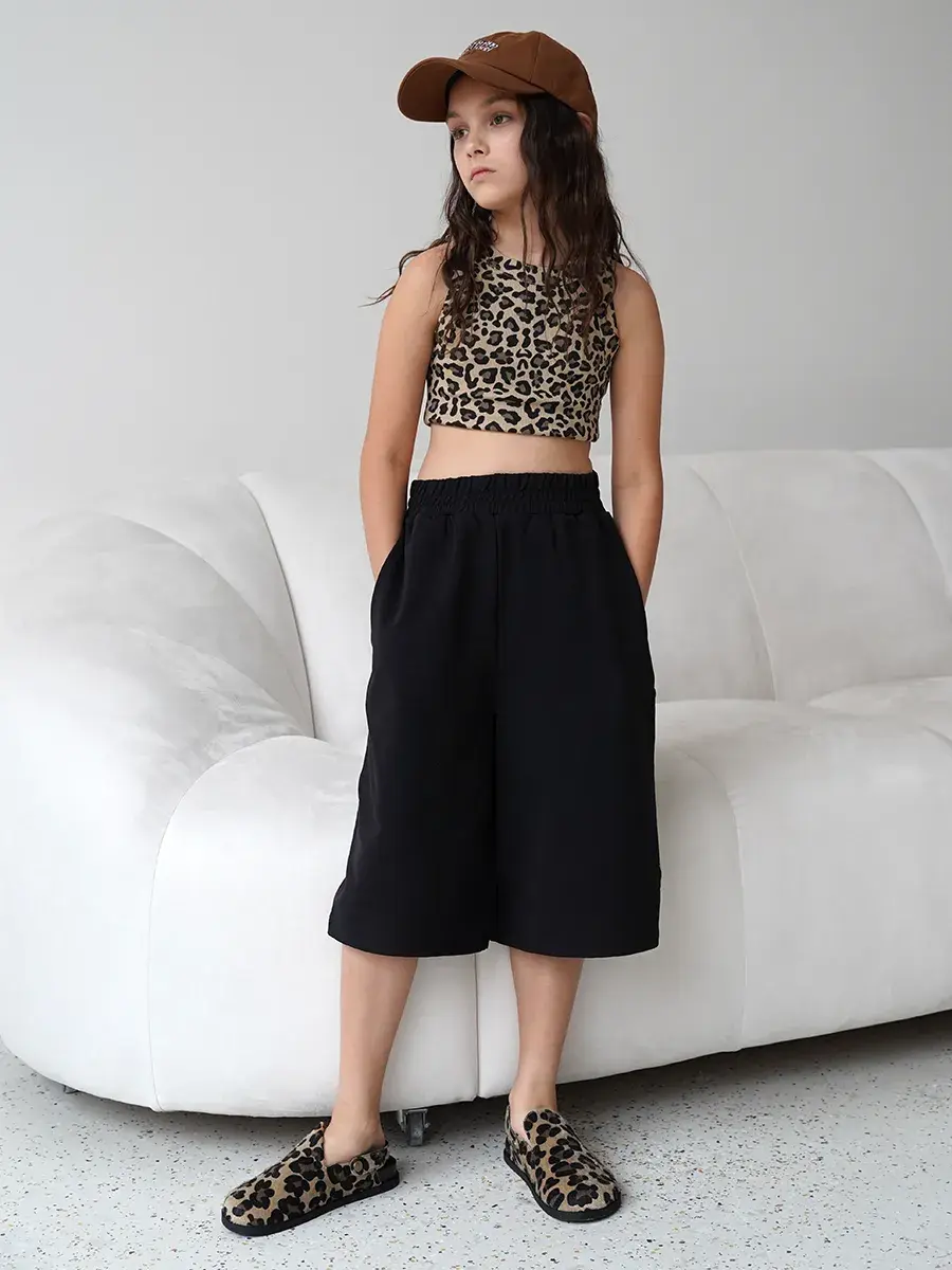 Леопардовый костюм для девочки включает в себя модный топ и комфортные шорты, которые подойдут как для активного отдыха, так и для повседневной носки. Идеально подходит для маленьких модниц и юных спортсменок.