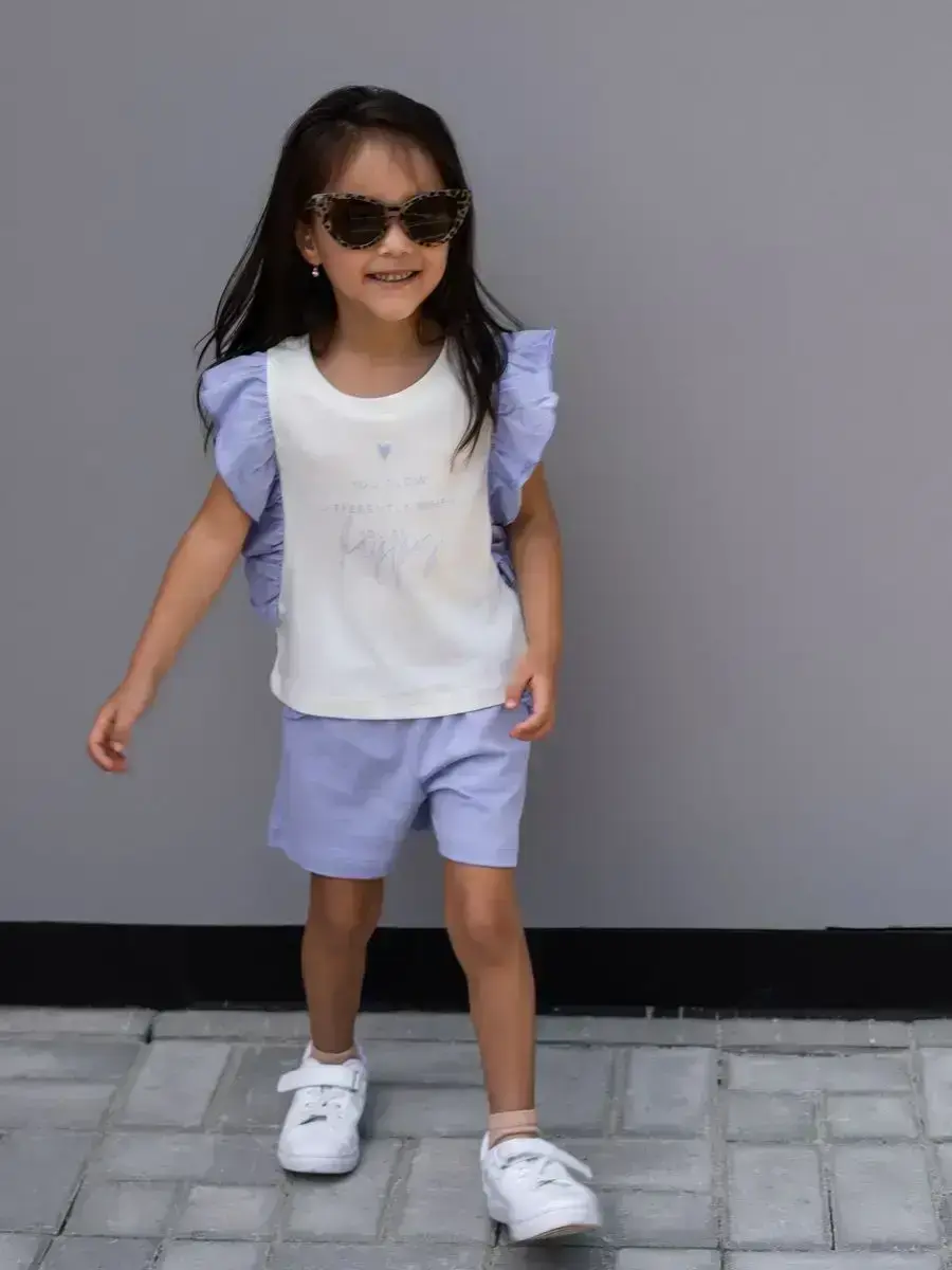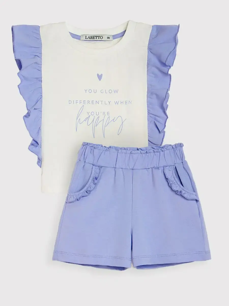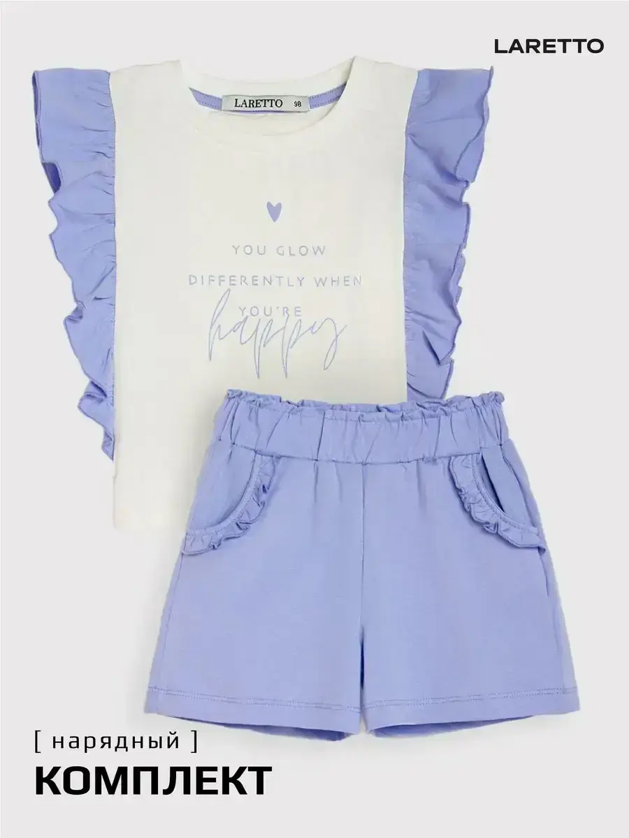 Костюм для девочки летний от бренда LARETTO непременно станет фаворитом в гардеробе Вашего ребенка! Трикотажная футболка с шортами - самая подходящая одежда на лето для детского сада, активного отдыха на природе, путешествий, похода в кино, гости или на праздник. Одежда для девочки выполнена из нежнейшего хлопка, невероятно мягкая и дышащая, имеет рюши на шортах и на топе, короткий рукав и принт в виде надписи. Демисезонный комплект для детей lareto из майки и шорт максимально удобен, прилегает к телу и не сковывает движения. Одежда детская для малыша без застежек, поэтому Ваш ребенок сможет одеваться самостоятельно. Независимо от того, хотите ли вы использовать этот костюм осенью, весной или летом, он будет легким и комфортным. Эта двойка для тех, кто ищет стильную одежду для детей! Не упустите возможность приобрести товар для вашего ребенка уже сегодня! Приятных Вам покупок!