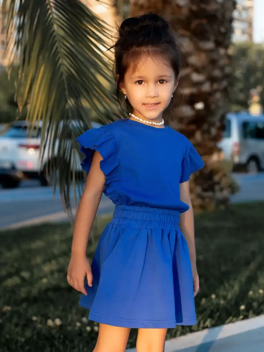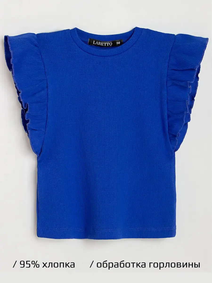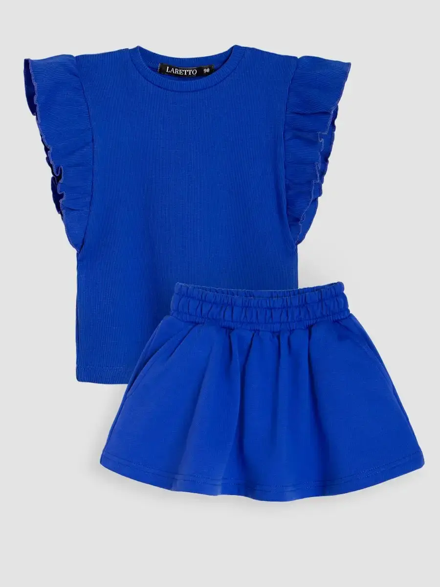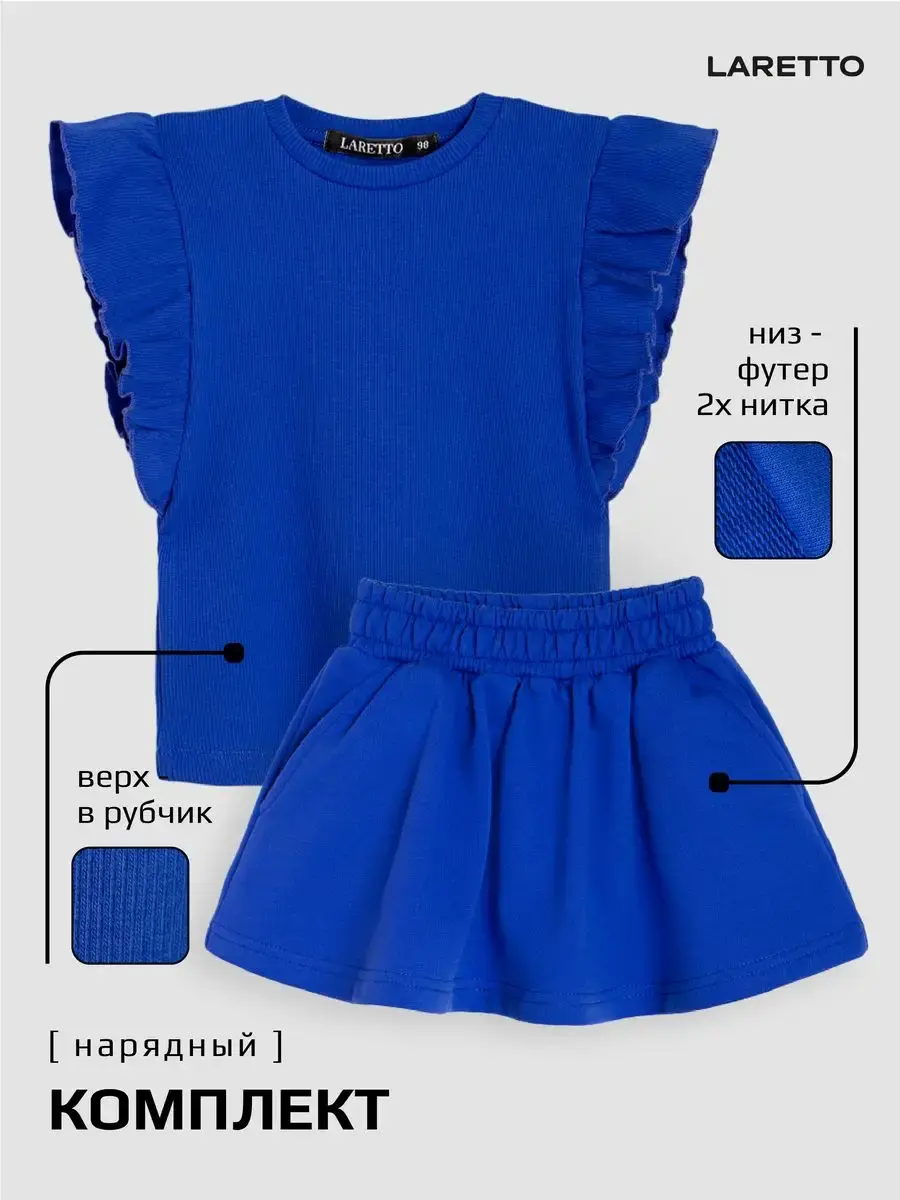 Костюм летний трикотажный непременно станет самым любимым в гардеробе каждой юной модницы! Майка детская в рубчик с рукавами рюшами и юбка мини выше колена - это подходящий вариант для садика, активного отдыха на природе, путешествий, похода в кино, гости или на праздник. Топик для девочки выполнен из нежнейшего трикотажа кашкорсе, невероятно мягкой и эластичной и ткани, которая практически не ощутима во время носки. Юбочка на резинке из футера хорошо сидит, держит форму и подчеркивают силуэт. Футболка хорошо сочетается с любым низом и верхом в одежде. Нарядный костюм идеален для праздничного торжества или фотосессии. Комплект не имеет застежек, поэтому Ваш ребенок сможет легко одеваться самостоятельно. Модель подойдет как малышкам, так и подросткам. Вся коллекция вещей для детей отшивается из натуральных, дышащих материалов Премиум качества и поэтом не вызывает раздражения и дискомфорта на коже. Не упустите возможность приобрести этот качественный товар уже сегодня! Он станет чудесным подарком дочке, сестре, внучке, племяннице без повода и на любое событие. Порадуйте своего ребенка красивой и стильной одеждой от российского бренда LARETTO. Приятных Вам покупок!