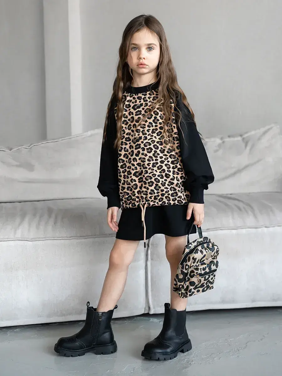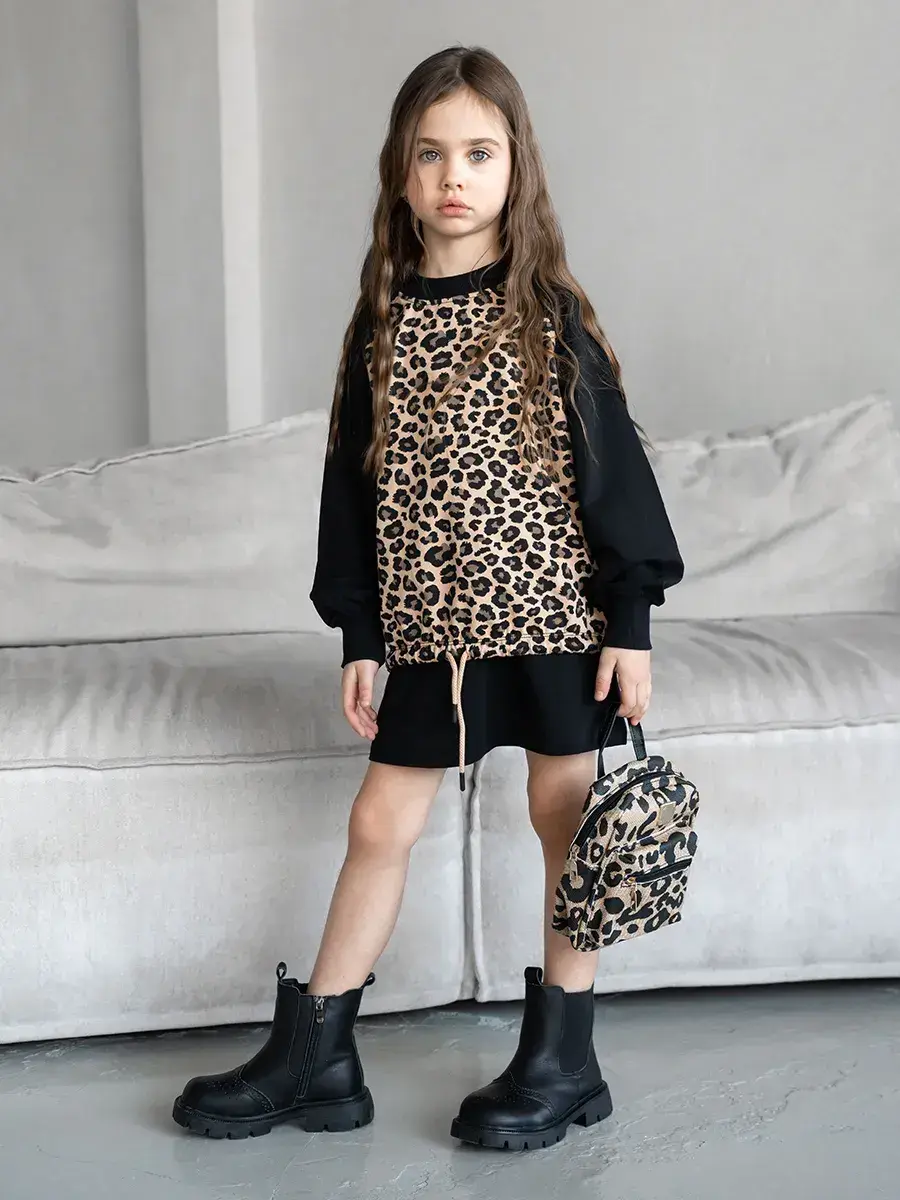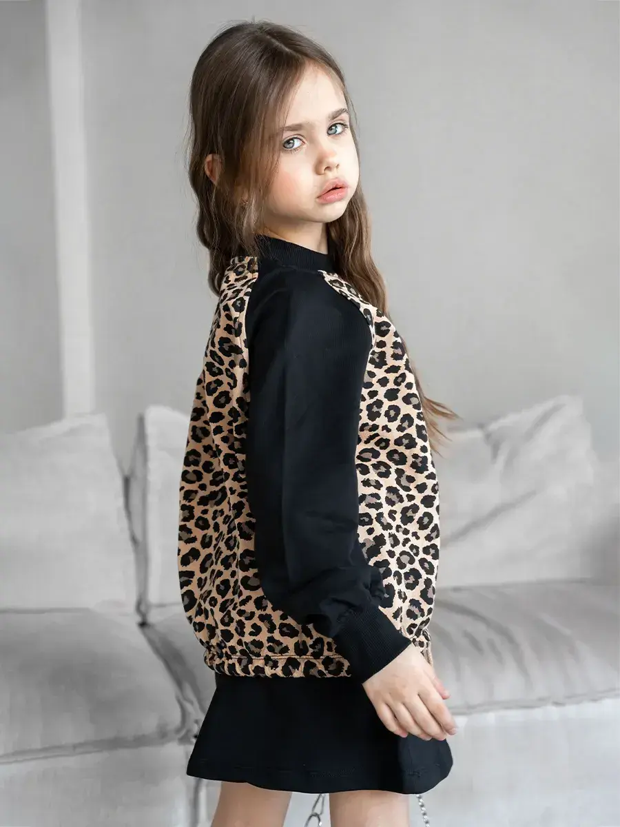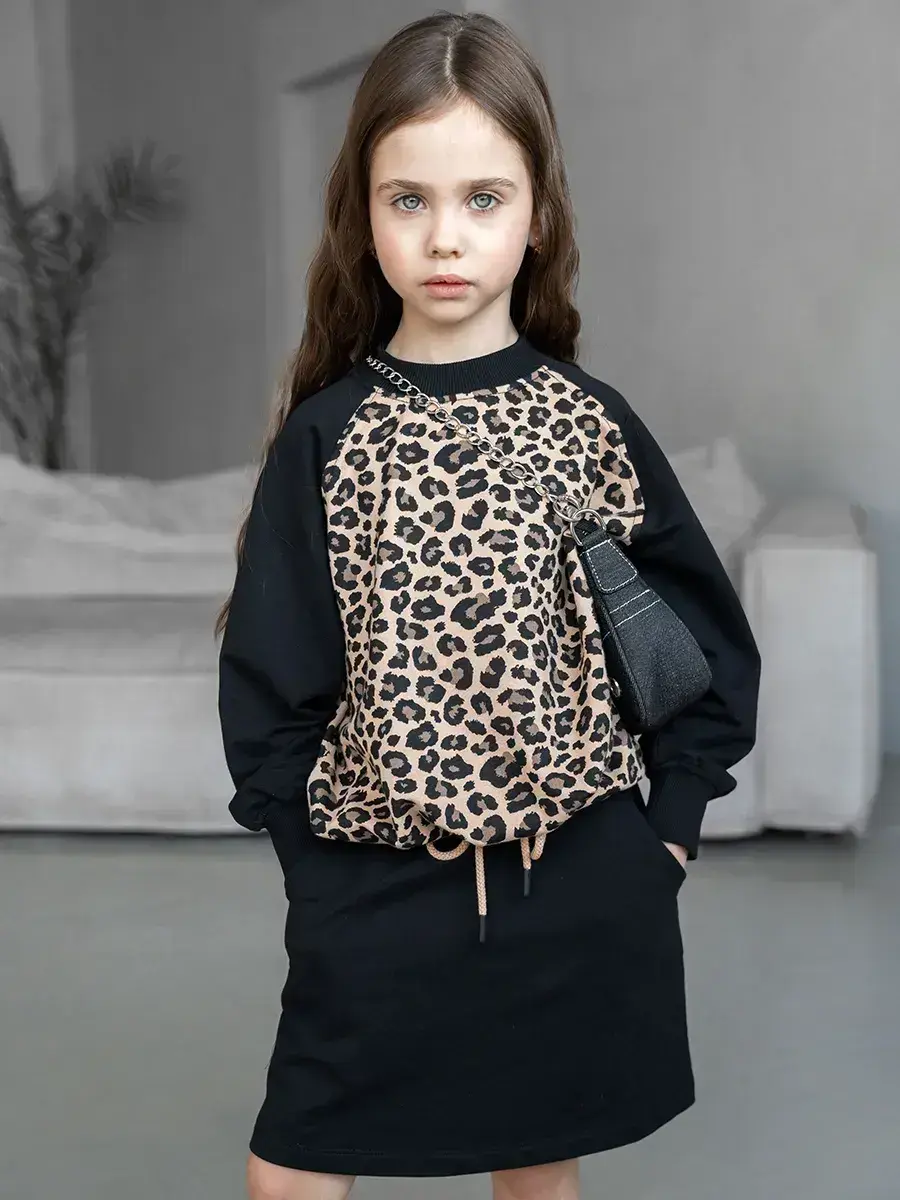 Костюм для девочки, состоящий из уютного свитшота и модной юбки! Этот костюм детский идеально подходит для активных игр, прогулок и повседневной носки. Свитшот для девочки выполнен из мягкого, дышащего материала, обеспечивая комфорт в любое время года. Яркие цвета и оригинальный леопардовый принт делают его настоящим модным акцентом в гардеробе вашей маленькой леди.