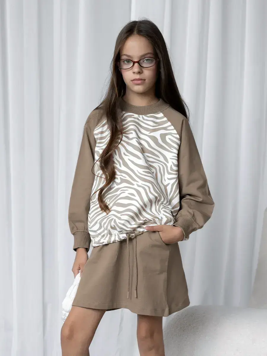 Юбка для девочек прямого кроя имеет эластичный пояс, что обеспечивает идеальную посадку и свободу движений. Легкий материал не сковывает движения, позволяя девочке легко играть и бегать. Дизайн юбки гармонично сочетается со свитшотом, создавая стильный образ для любого случая.