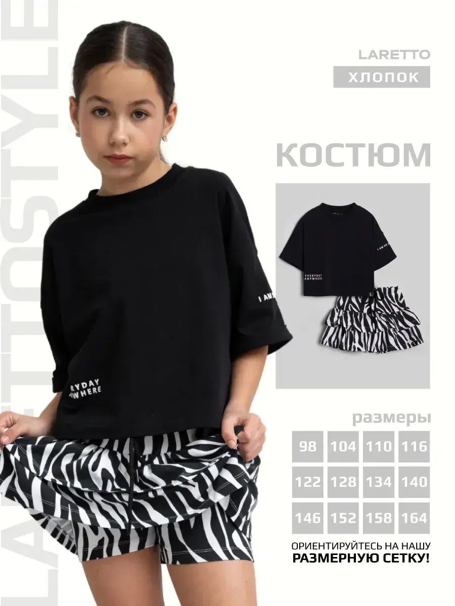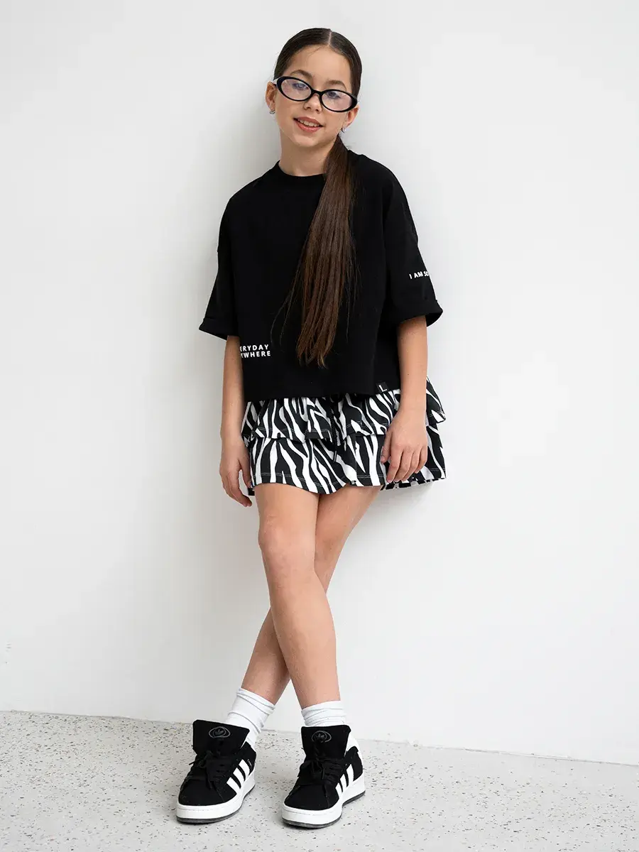Представляем стильный летний костюм для девочки, состоящий из удобной футболки и модной юбки-шорты! Этот детский комплект идеально подходит для активных игр, прогулок и повседневной носки. Футболка для девочек выполнена из мягкого дышащего материала, что обеспечивает комфорт в любое время года. Детская футболка свободного кроя в стиле oversize со спущенными рукавами очень удобная и стильная для ежедневных прогулок.