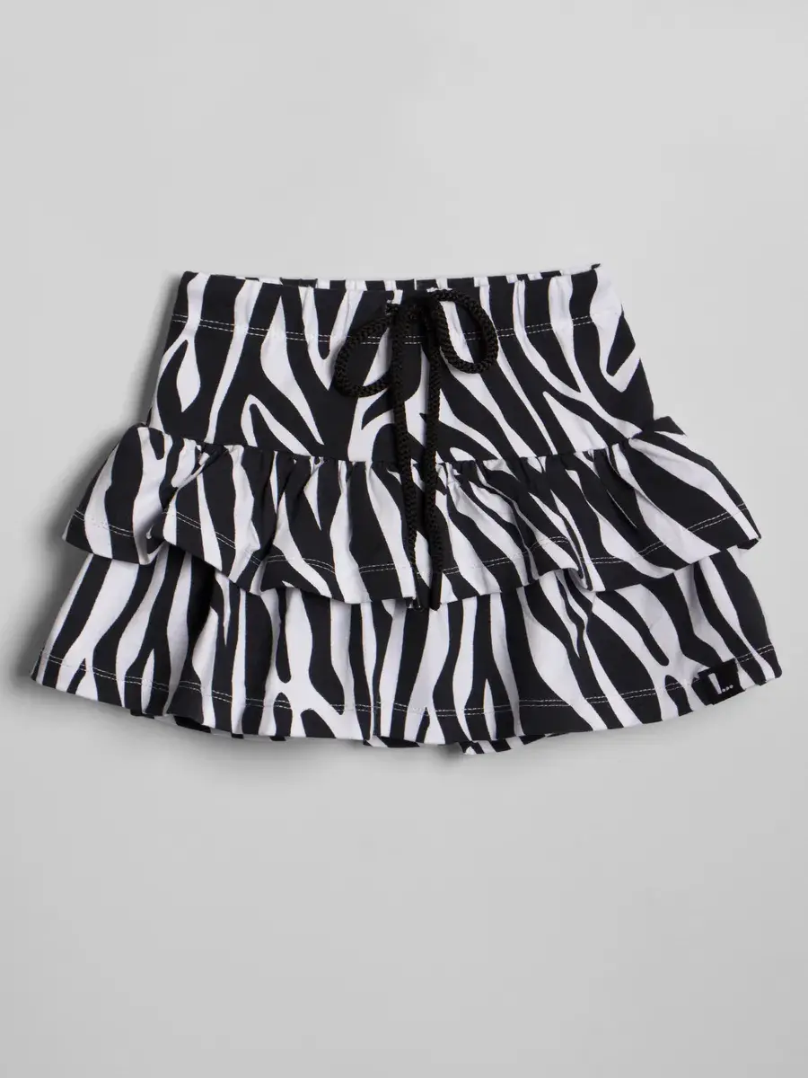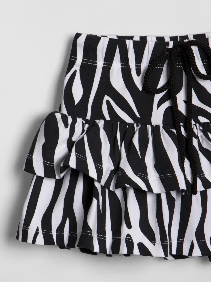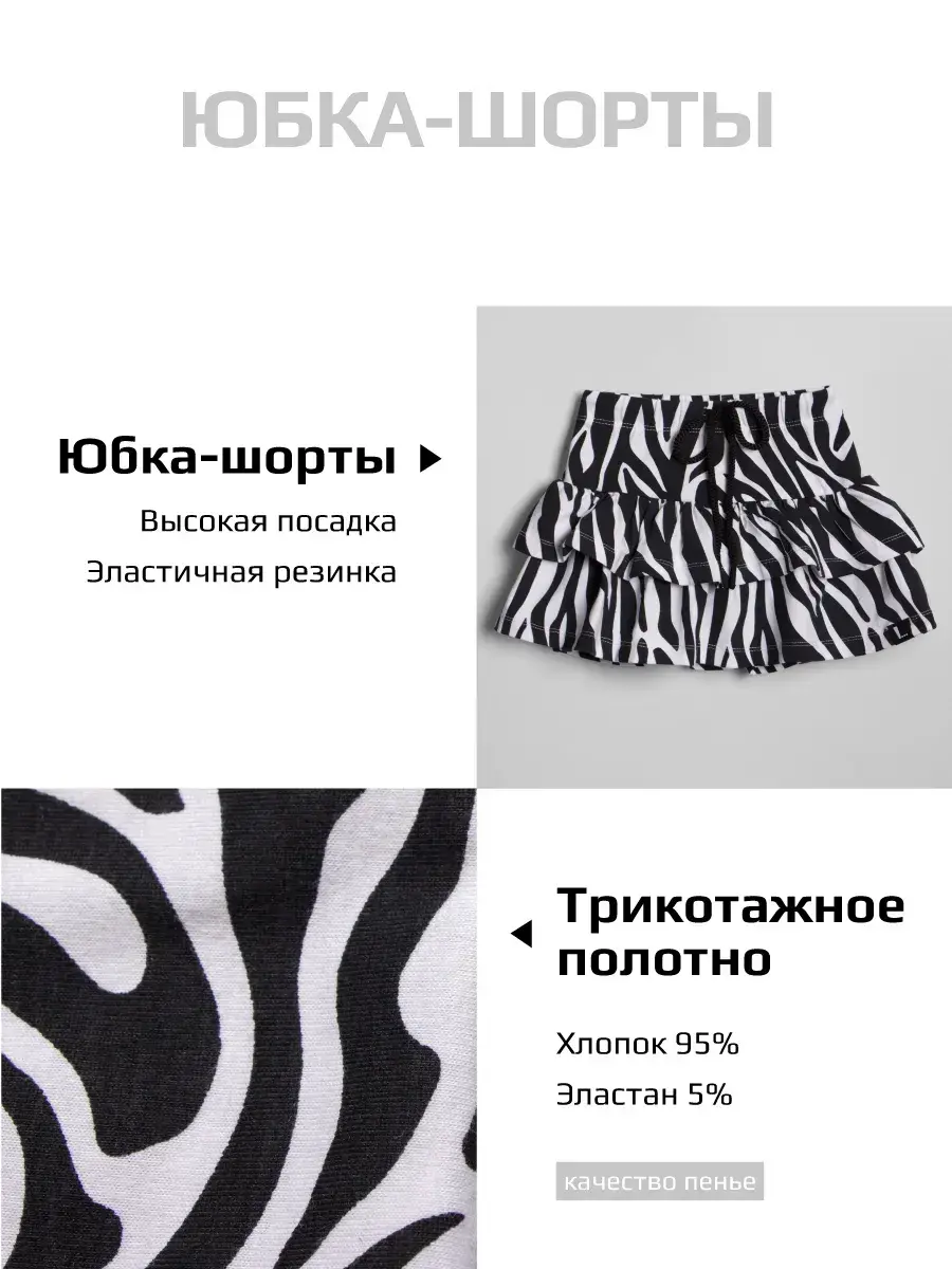 Юбка-шорты имеет эластичный пояс, что обеспечивает идеальную посадку и свободу движений. Она выполнена из легкого материала, который не сковывает движения и позволяет девочке легко играть и бегать. Дизайн юбки-шорт с воланами прекрасно сочетается с футболкой, создавая стильный образ для любого случая.