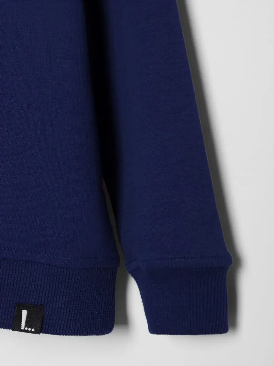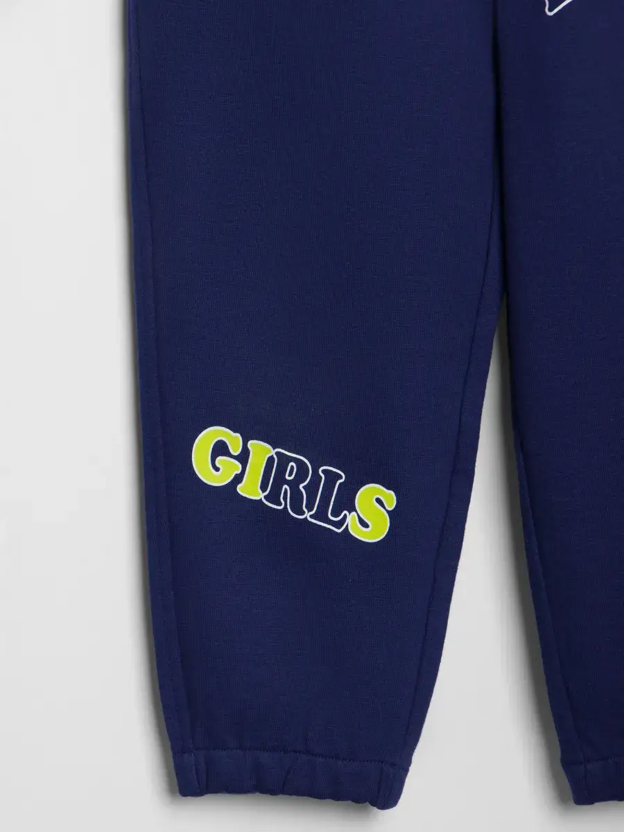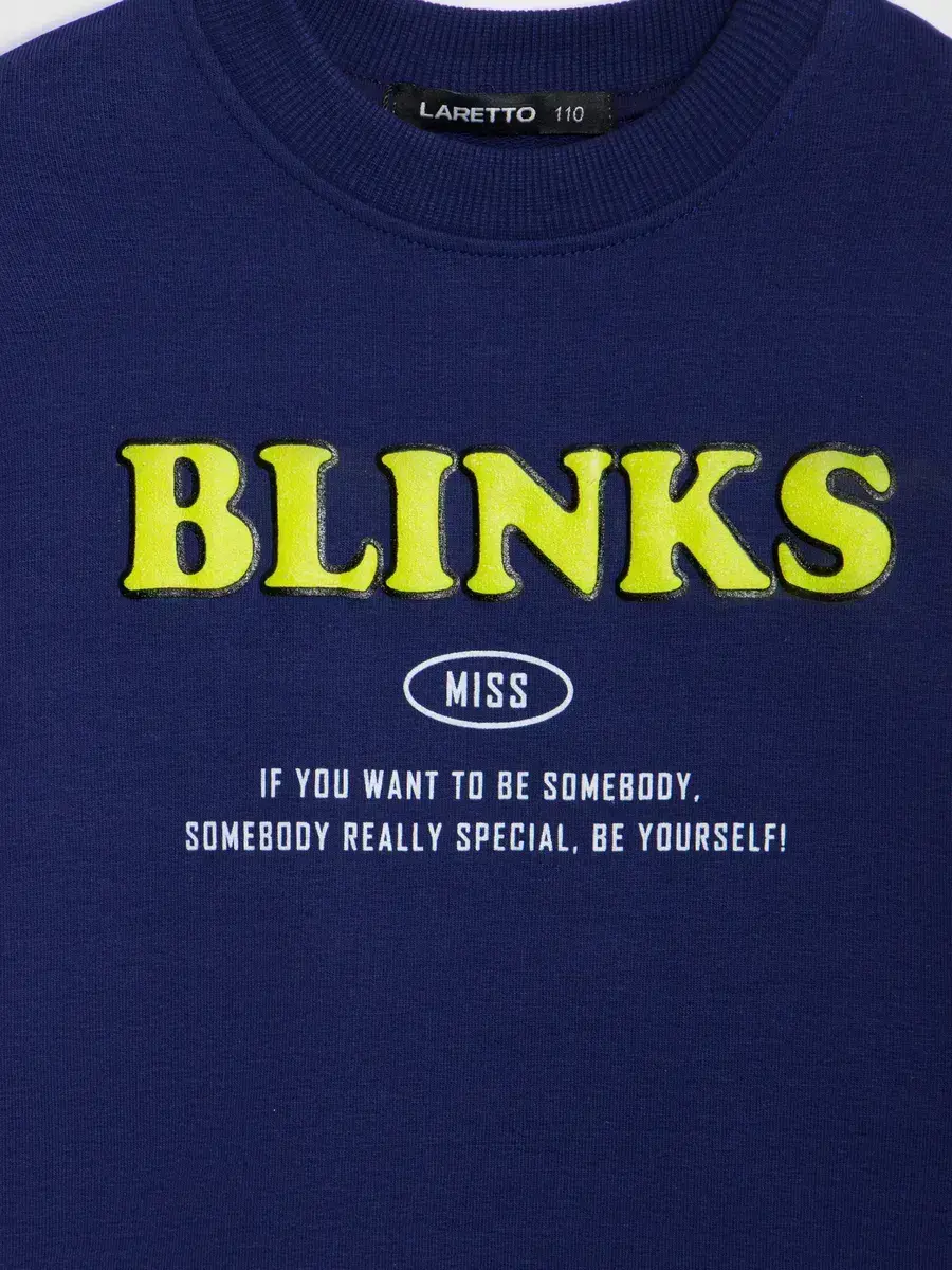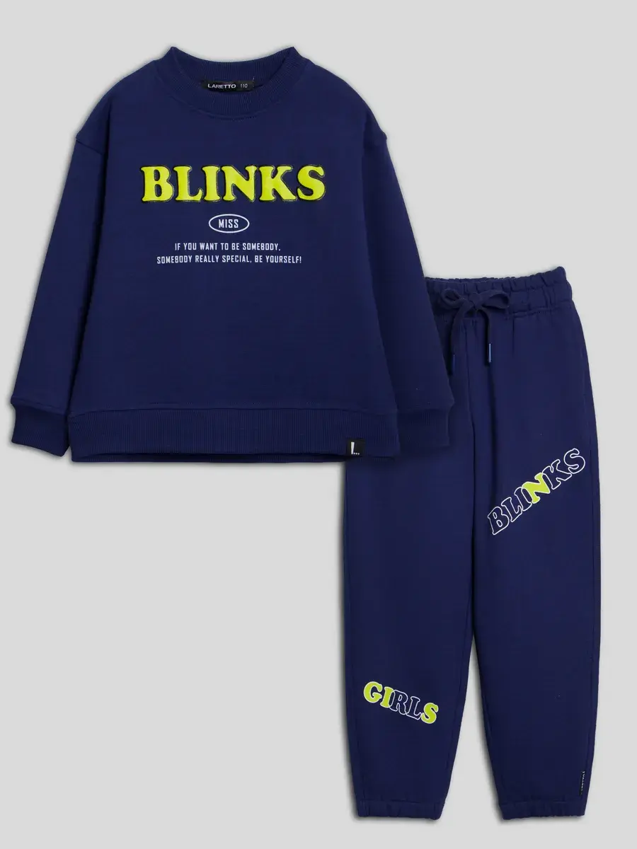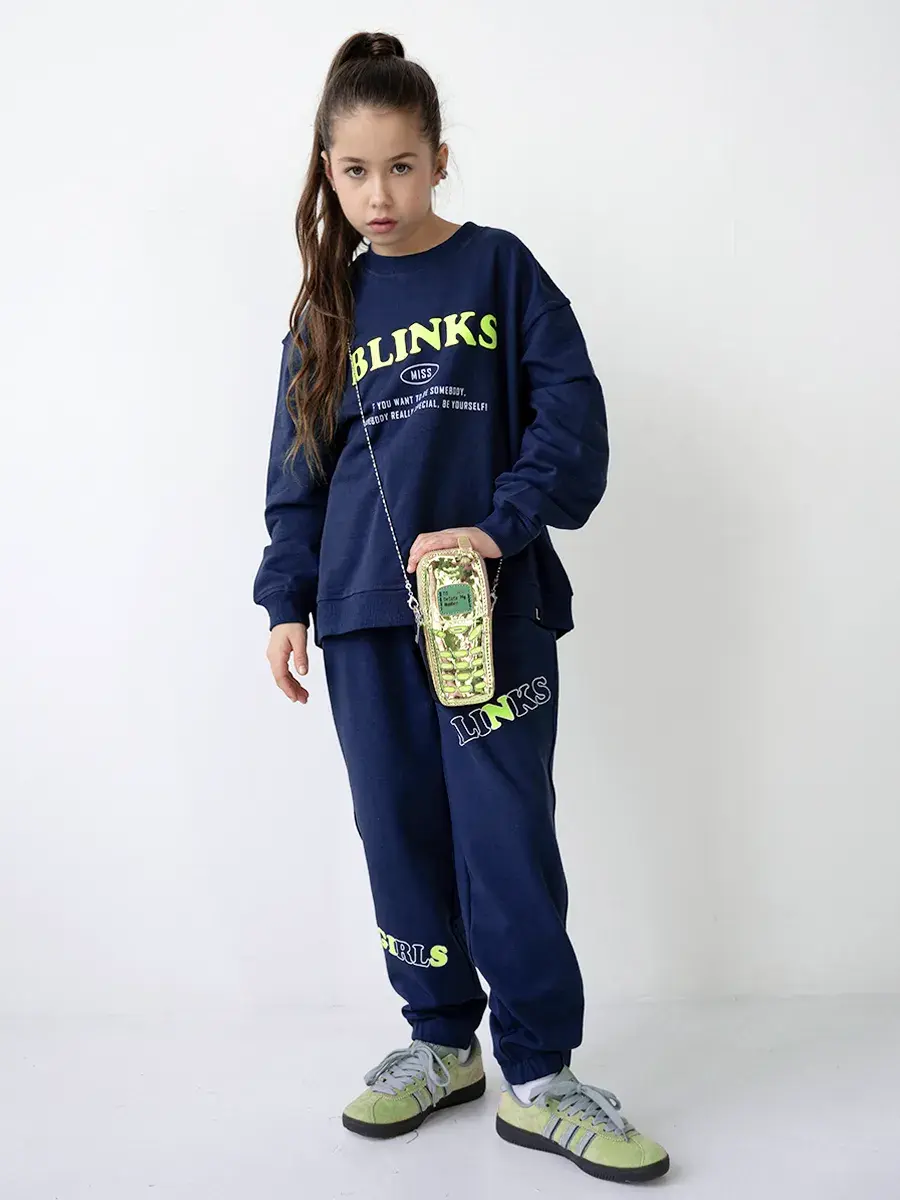 Стильный и удобный синий костюм для девочки, состоящий из свитшота и брюк. Изготовлен из высококачественного материала, который дарит комфорт на протяжении всего дня.