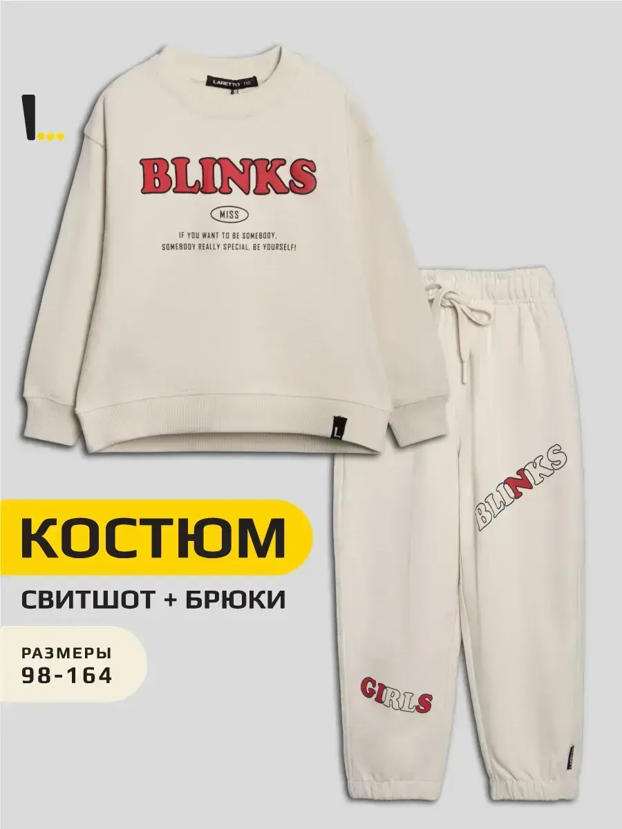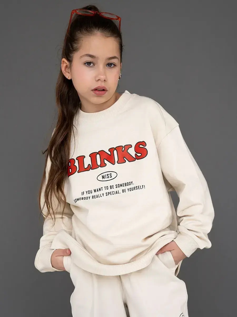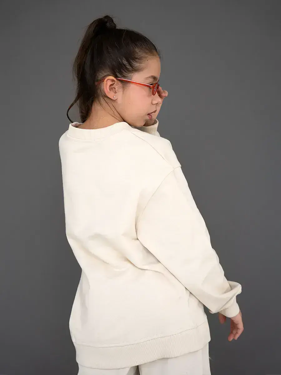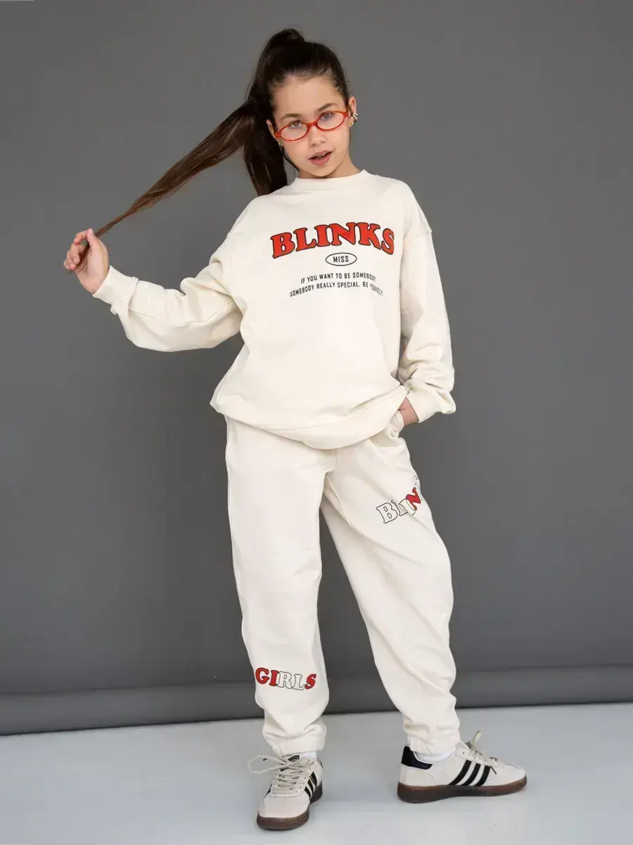 Стильный и удобный бежевый костюм для девочки, состоящий из свитшота и брюк. Изготовлен из высококачественного материала, который дарит комфорт на протяжении всего дня.